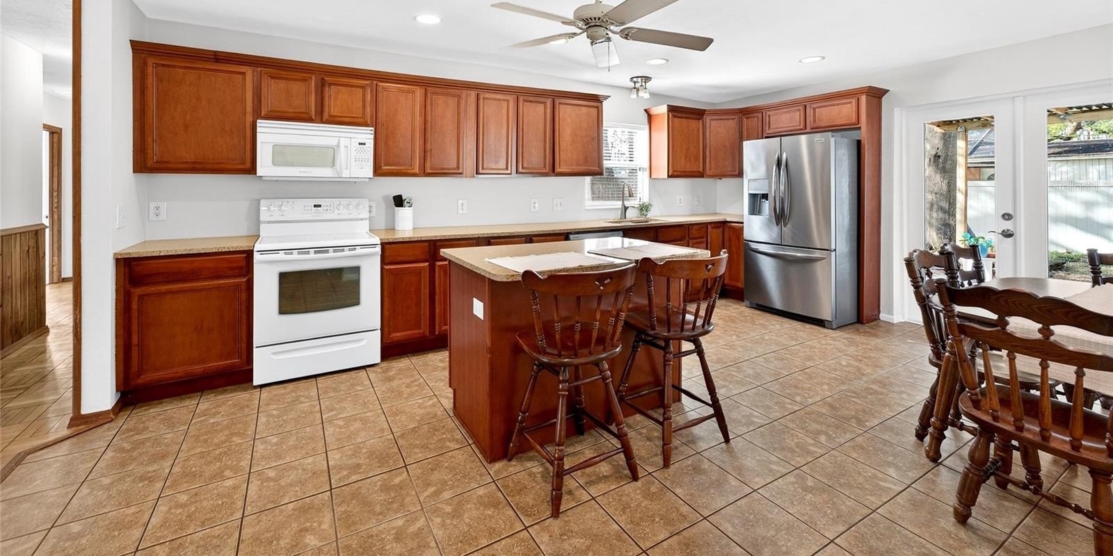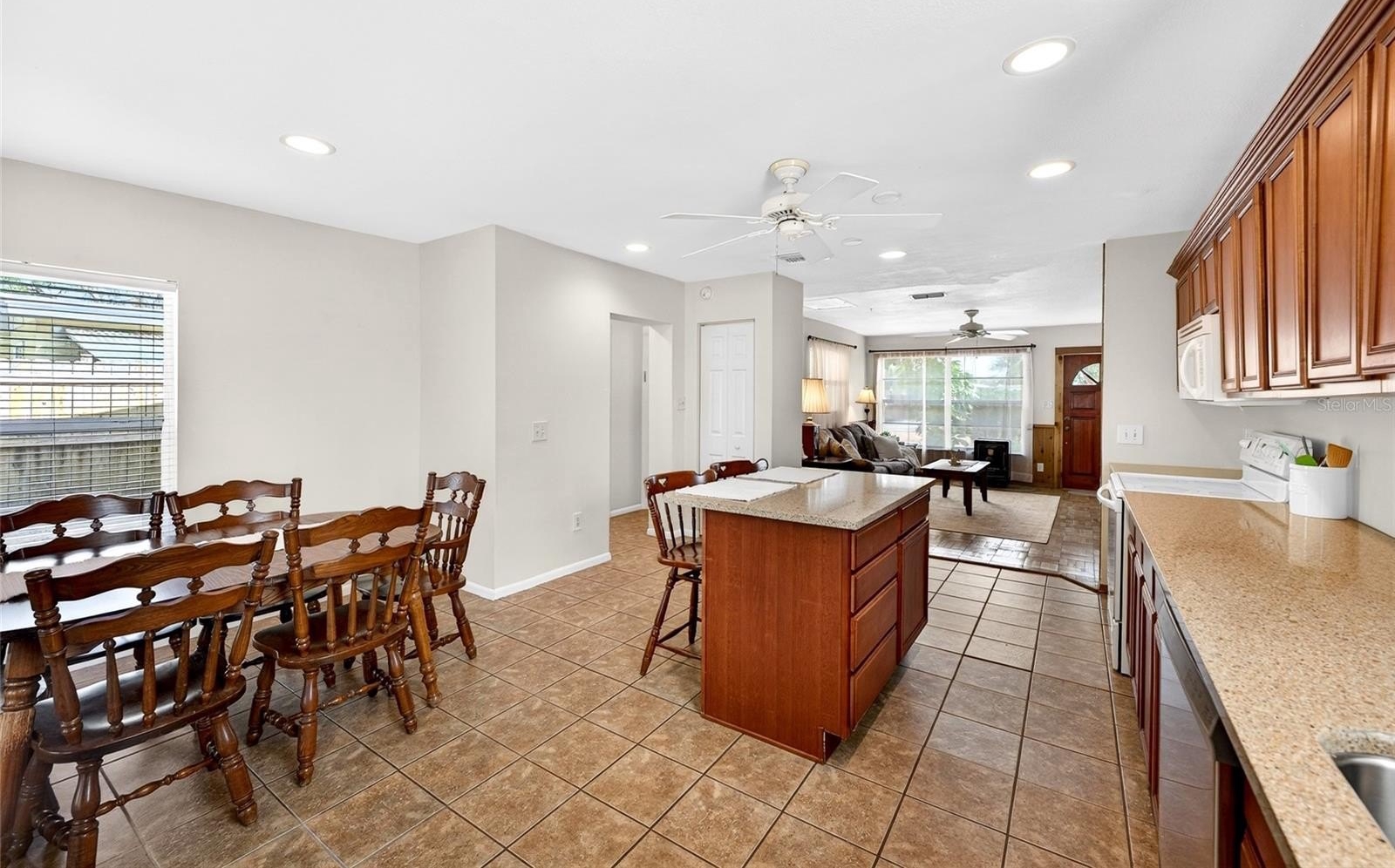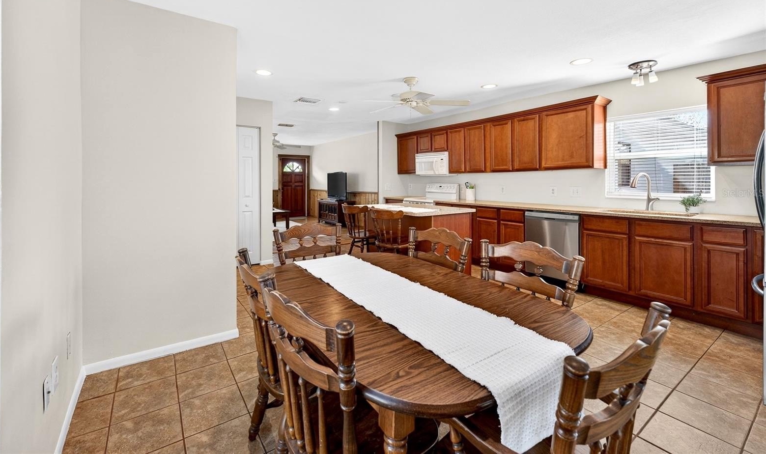 Inside, the home features a bright and functional floor plan designed for comfortable everyday living. The spacious kitchen is the heart of the home, offering abundant cabinetry, generous counter space, stainless steel appliances, and a center island with seating, making it perfect for meal prep, casual dining, or entertaining guests. The kitchen flows seamlessly into the dining area and living space, creating a warm and inviting atmosphere filled with natural light.