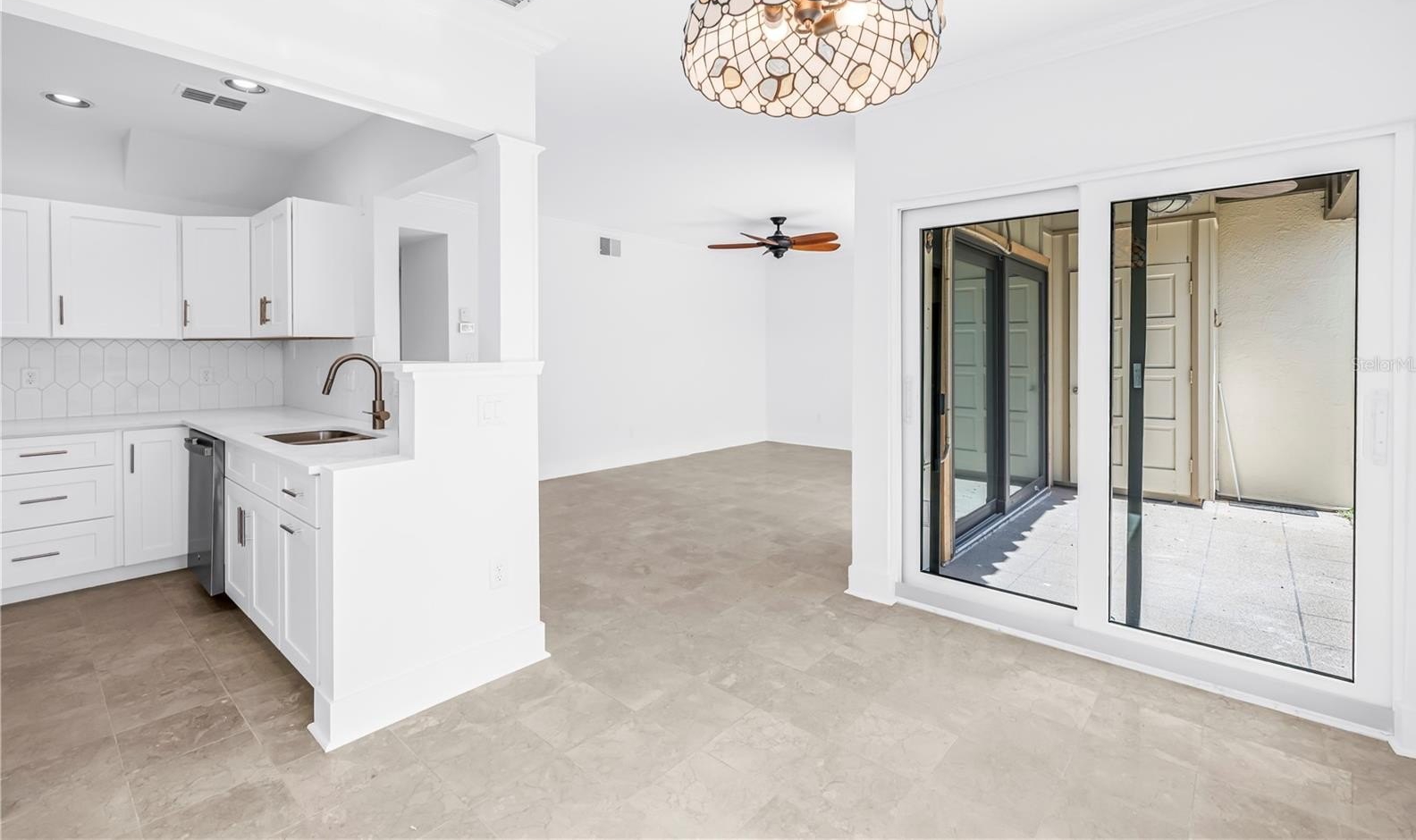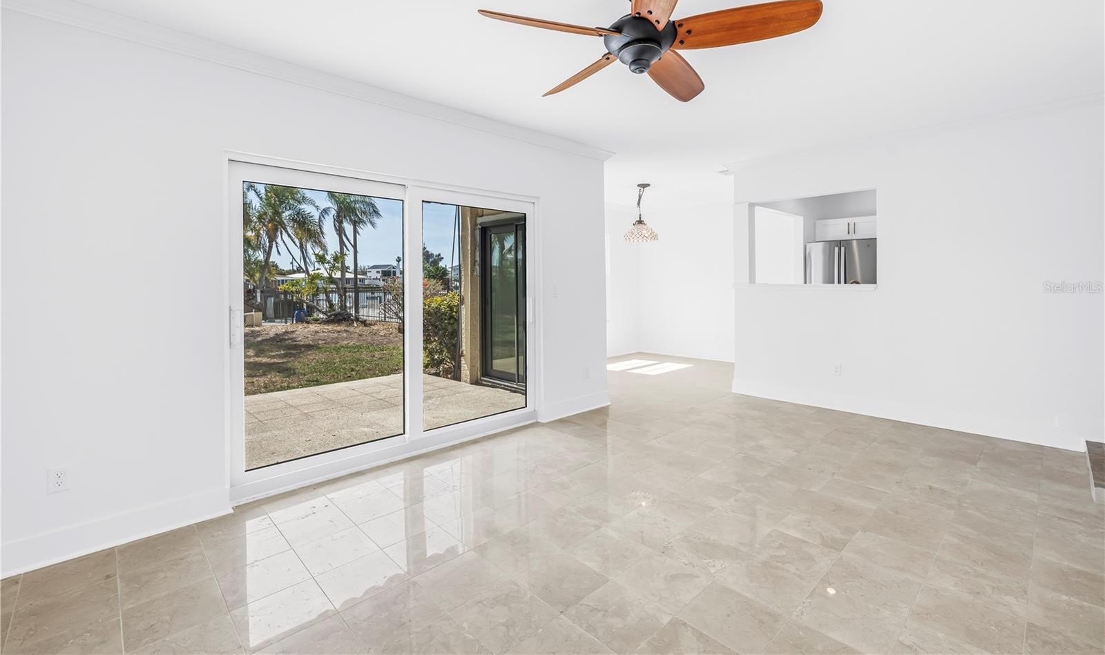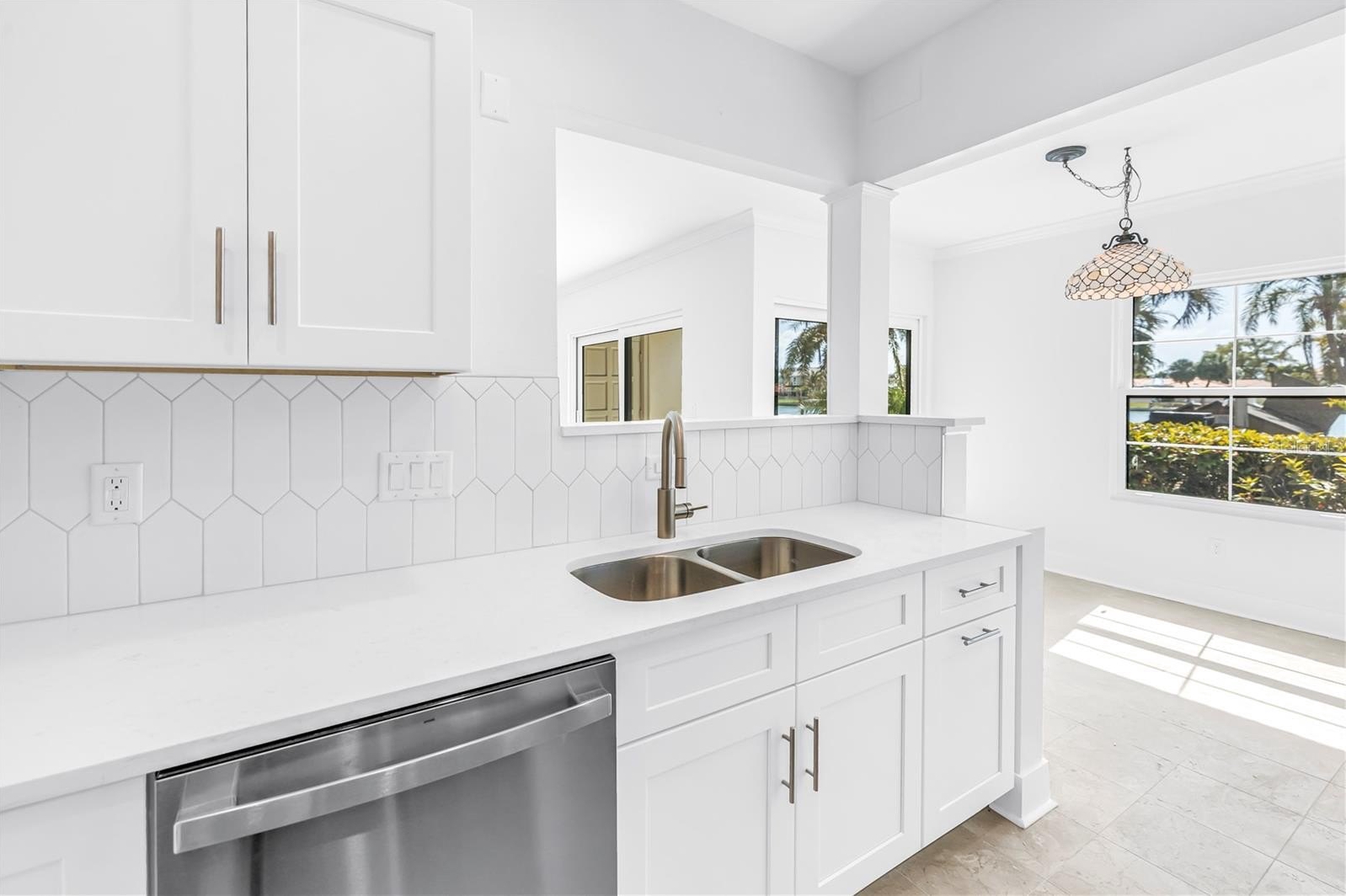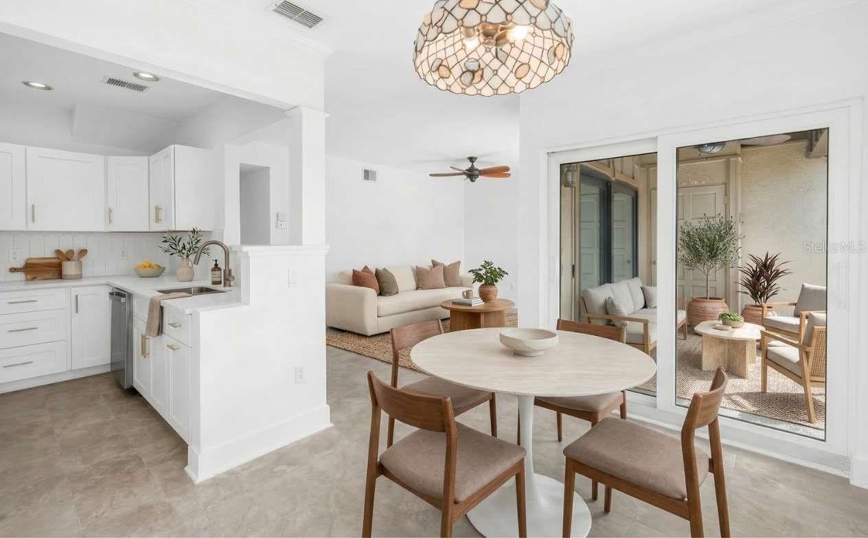 Inside, the home has been completely remediated and thoughtfully restored, presenting as fresh, clean, and move-in ready. The bright interior features an open living and dining layout, elegant marble flooring throughout the kitchen, dining and living areas, and sliding glass doors that invite natural light while framing peaceful water views. The renovated kitchen showcases quartz countertops, white shaker cabinetry, stainless appliances, and designer tile backsplash, blending hip coastal style with everyday functionality.