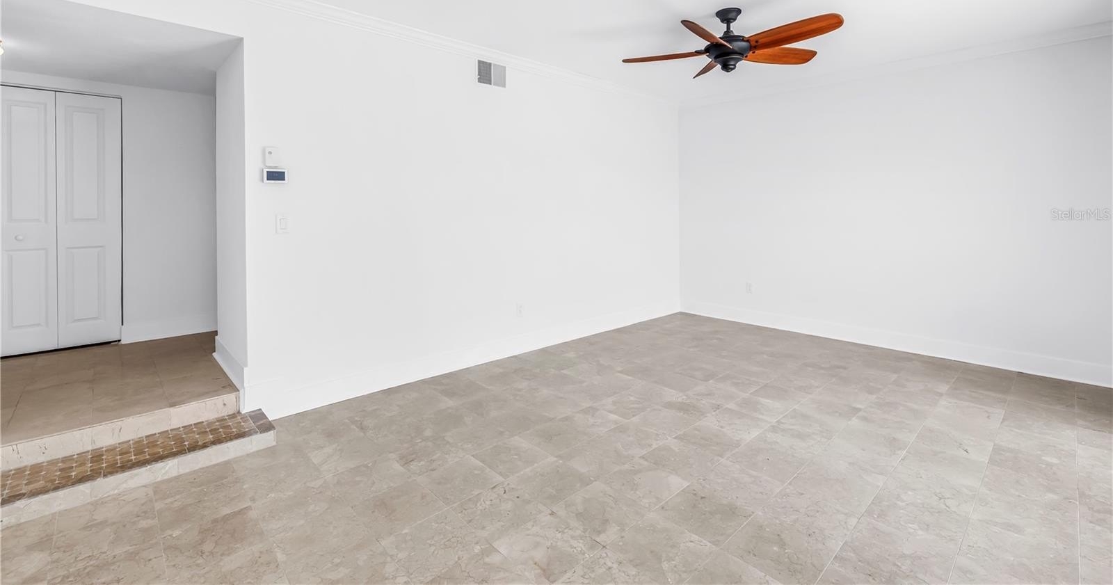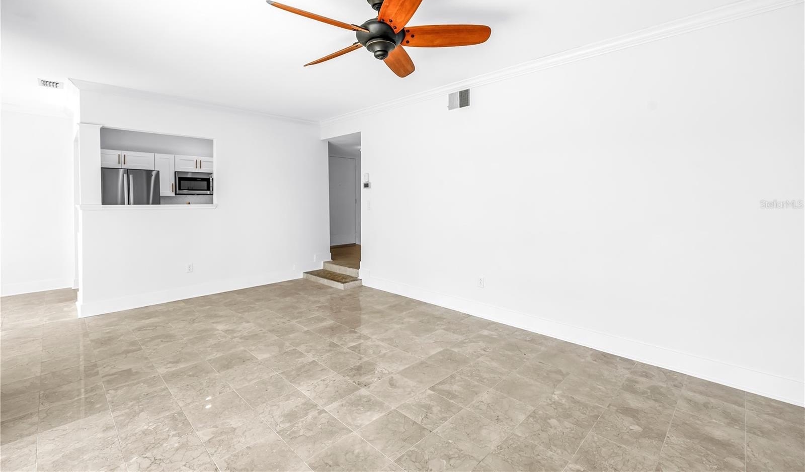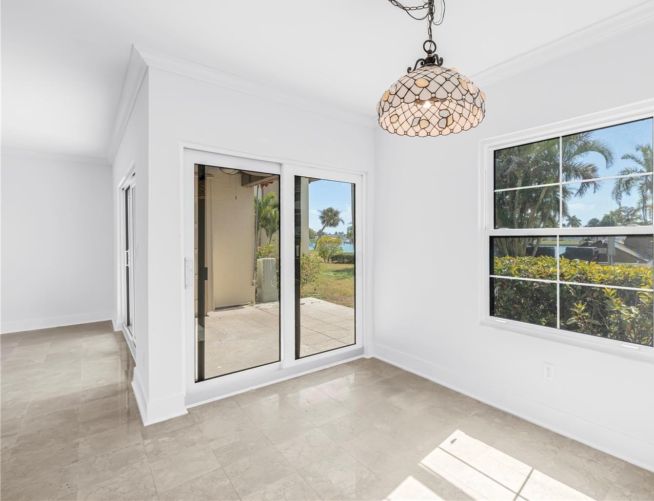 Inside, the home has been completely remediated and thoughtfully restored, presenting as fresh, clean, and move-in ready. The bright interior features an open living and dining layout, elegant marble flooring throughout the kitchen, dining and living areas, and sliding glass doors that invite natural light while framing peaceful water views. The renovated kitchen showcases quartz countertops, white shaker cabinetry, stainless appliances, and designer tile backsplash, blending hip coastal style with everyday functionality.