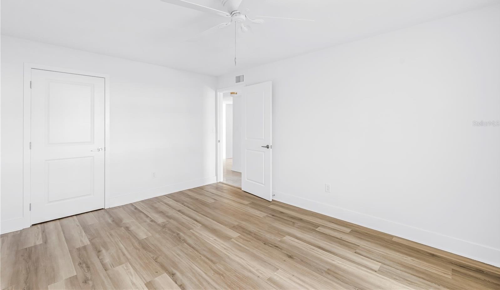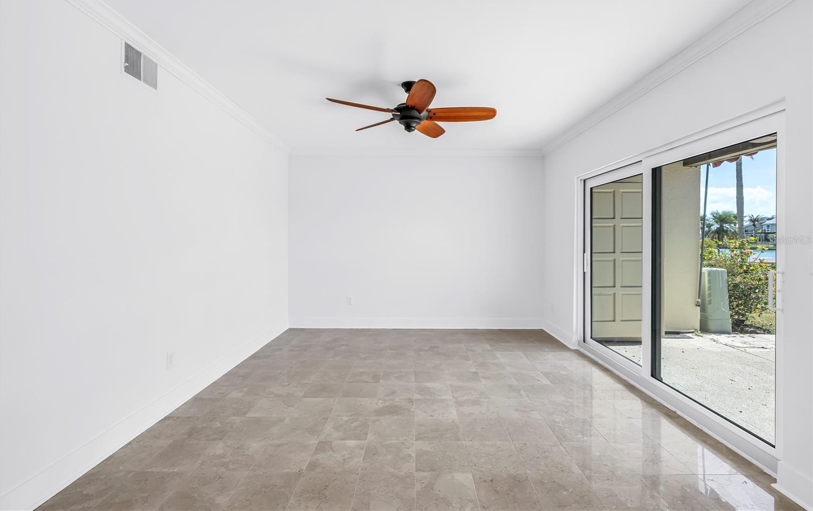The spacious living area flows effortlessly to a private patio where you can enjoy morning coffee while watching boats drift by on the bay. Here there is a sense of privacy and comfortable seating all year round. The updated bathroom features modern finishes and a sleek glass-enclosed shower, completing the home's crisp coastal aesthetic.