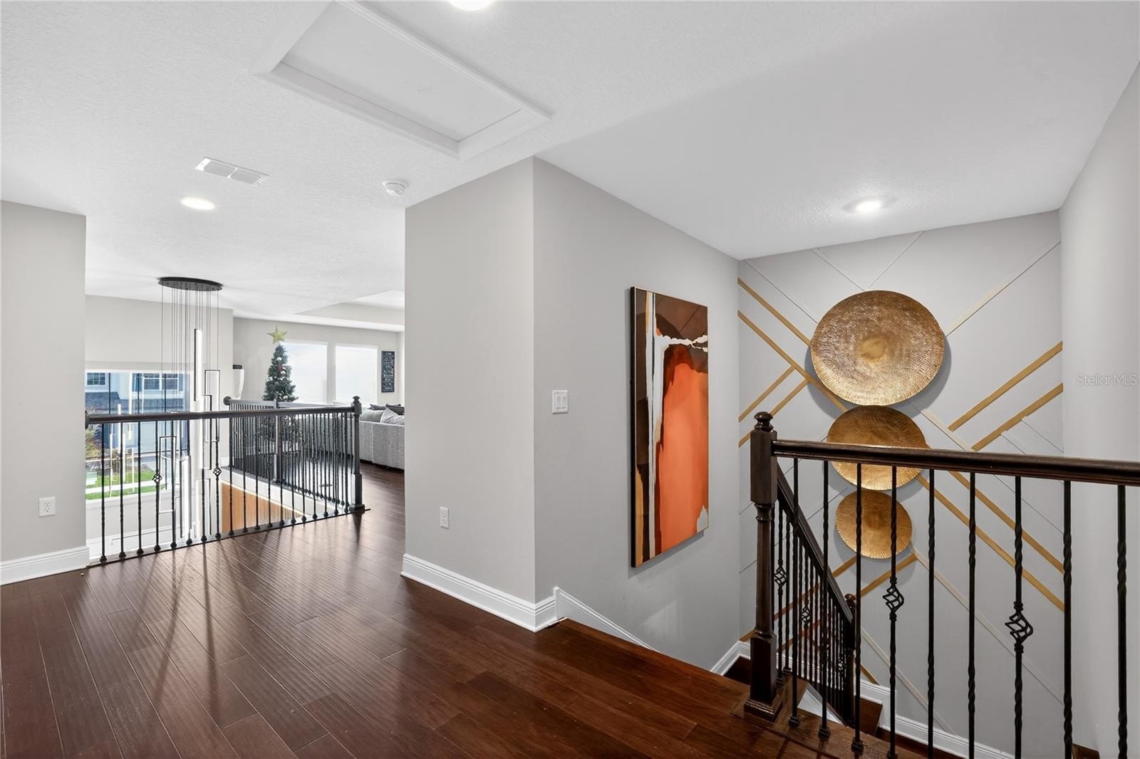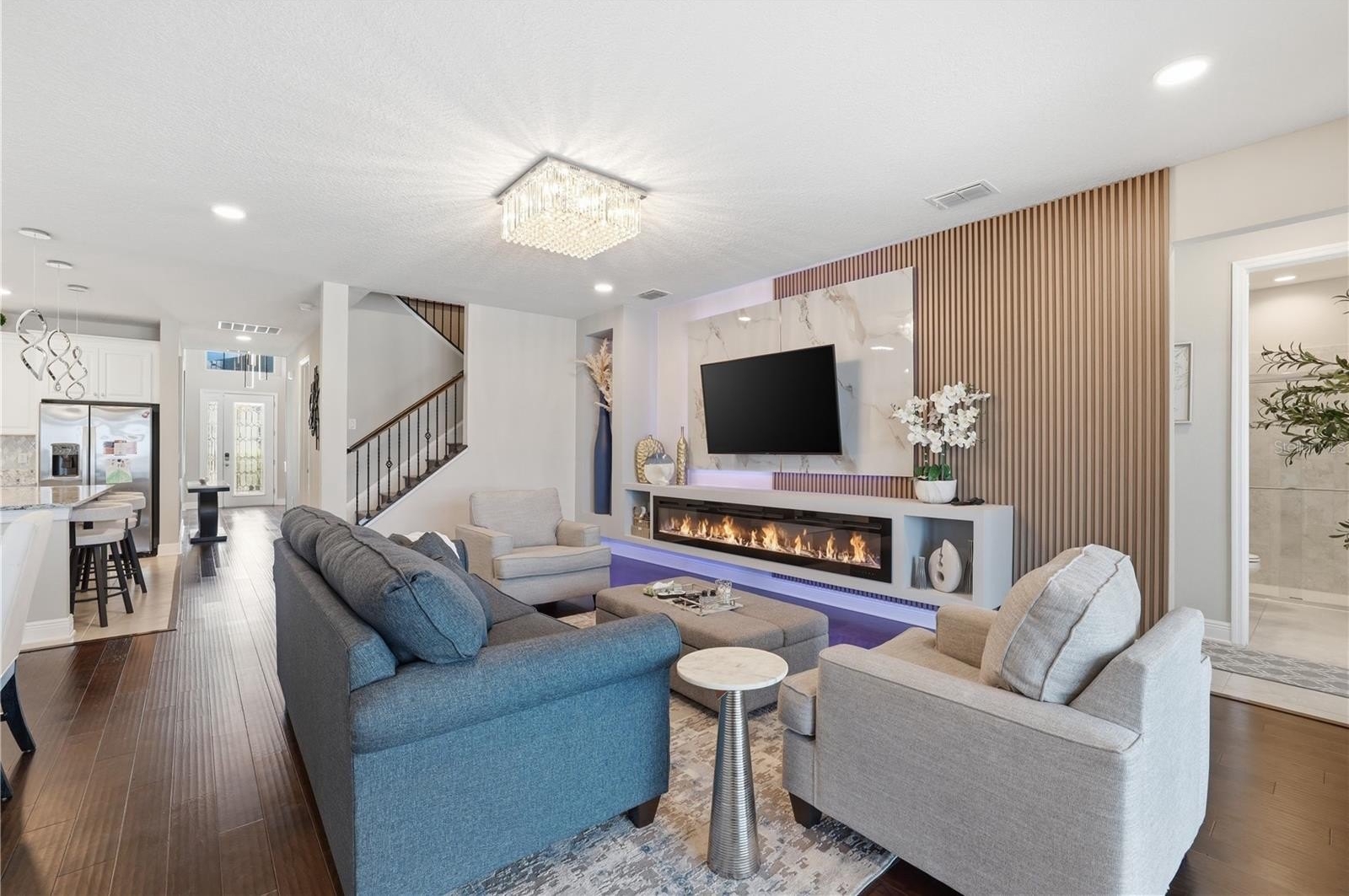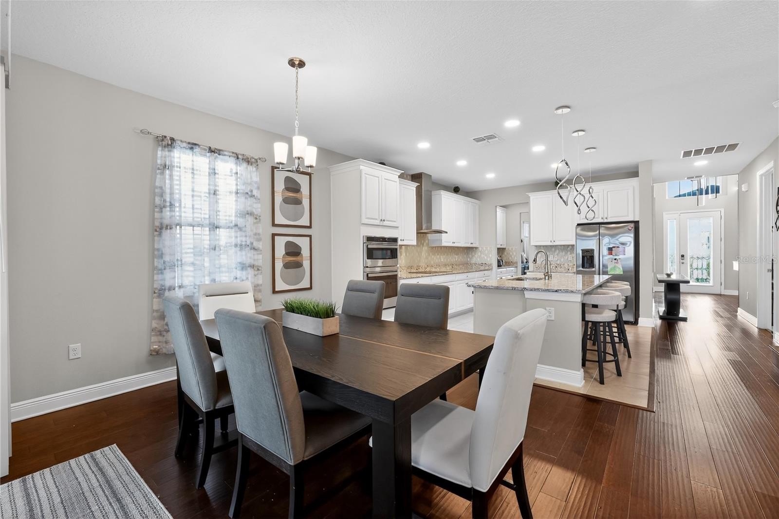 From the moment you enter, you are welcomed by soaring ceilings, rich architectural details, and a light-filled open-concept design. Elegant wood and tile flooring flow throughout the main living spaces, complemented by crown molding and designer finishes that create a sophisticated yet inviting atmosphere. The gourmet kitchen seamlessly connects to the living and dining areas, making it ideal for both intimate gatherings and large-scale entertaining.