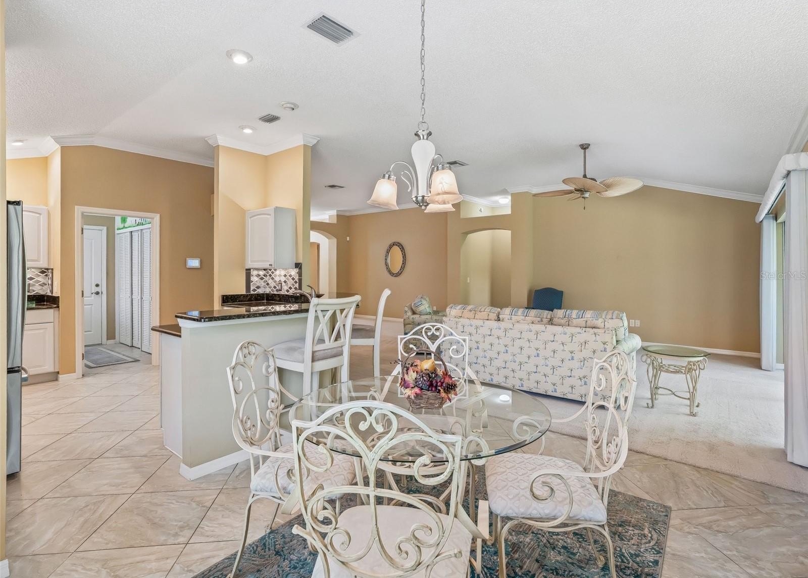 From the moment you arrive, the painted driveway and walkway, mature landscaping, and inviting curb appeal set the tone. Inside, you’ll find a light-filled, open floorplan enhanced by neutral tones, crown molding throughout, and plantation shutters on every window—creating a timeless and elegant feel.