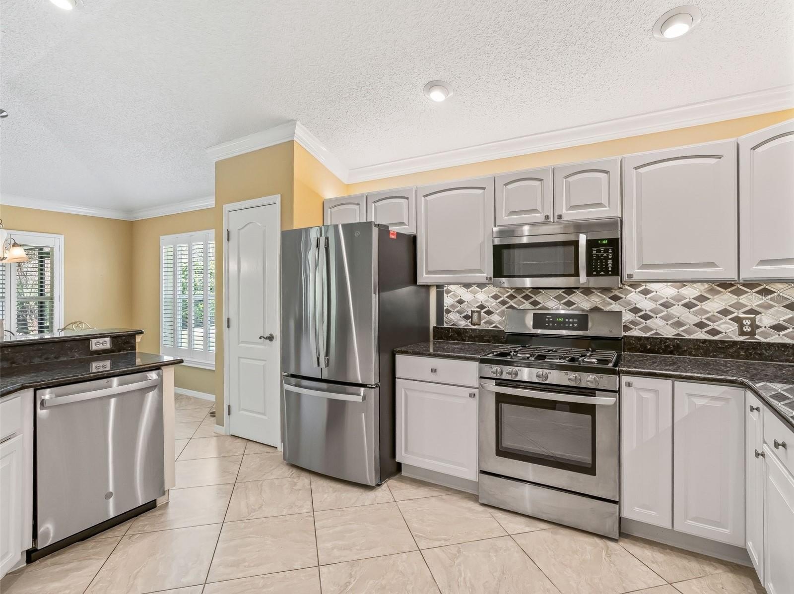 The spacious kitchen is designed for both everyday living and entertaining, featuring stainless steel appliances, granite countertops, a gas range, abundant cabinetry, and a cheerful eat-in area. Just off the kitchen, the large interior laundry room adds convenience and functionality.
