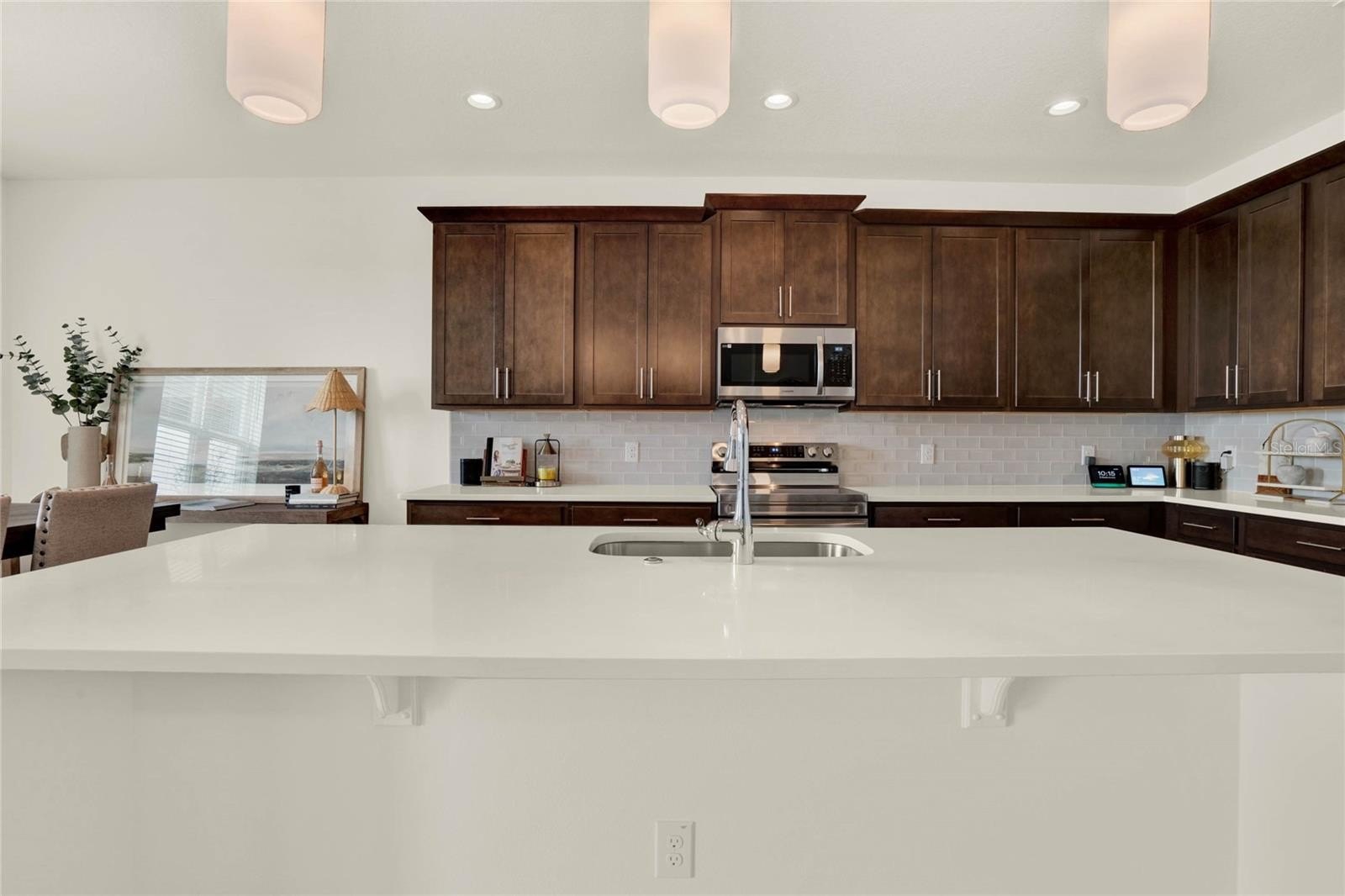 • Kitchen with quartz countertops, stainless steel appliances, and large center island