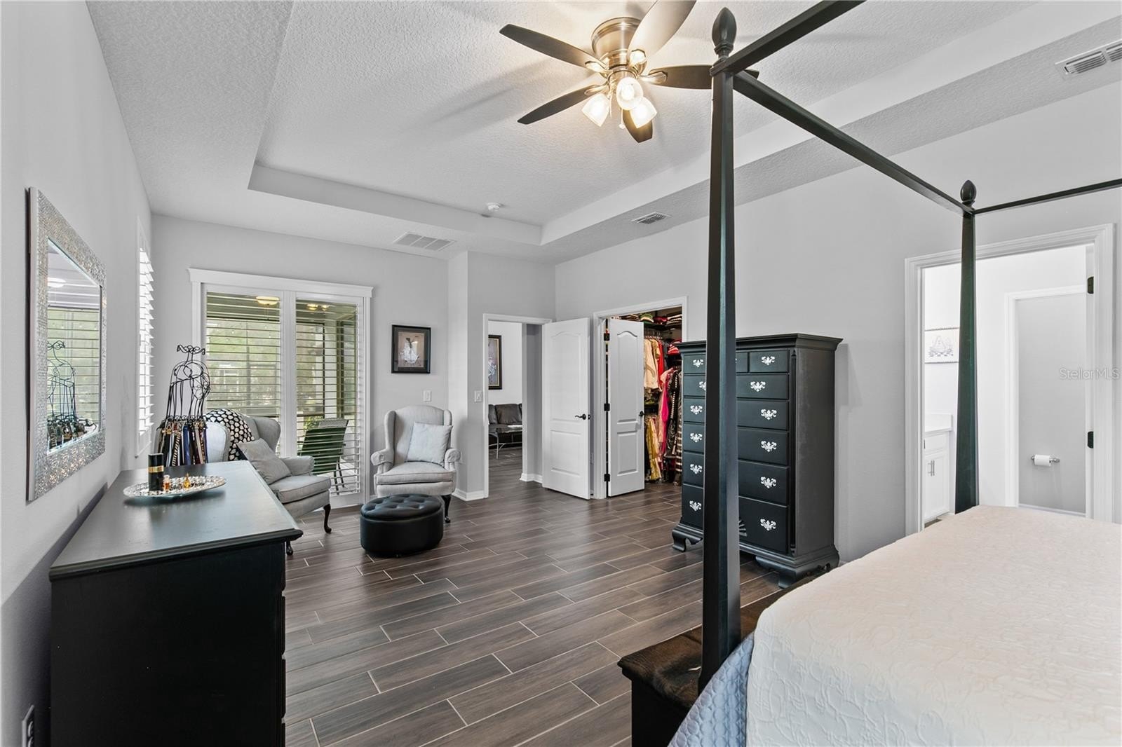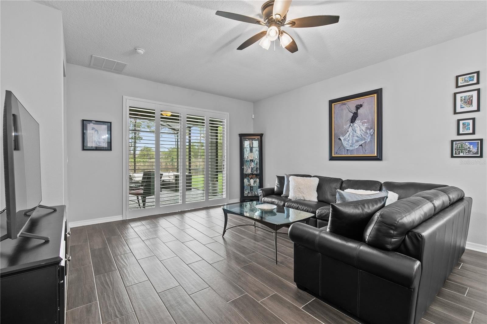 Step inside to find stunning porcelain tile flooring throughout the entire home, complemented by tray ceilings and a custom accent wall that adds a touch of sophistication. The open living space flows seamlessly to an extended lanai, perfect for relaxing or entertaining.
