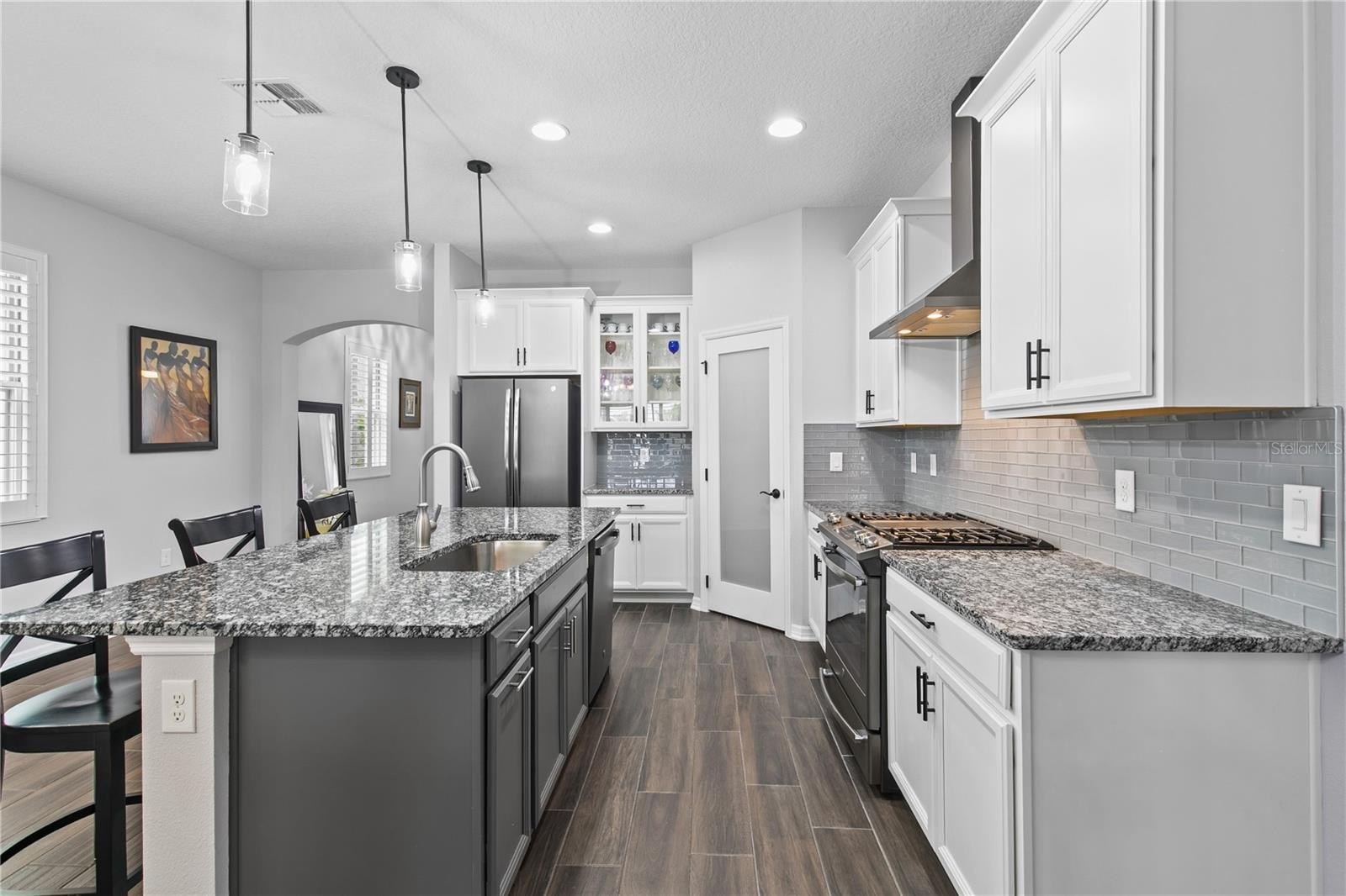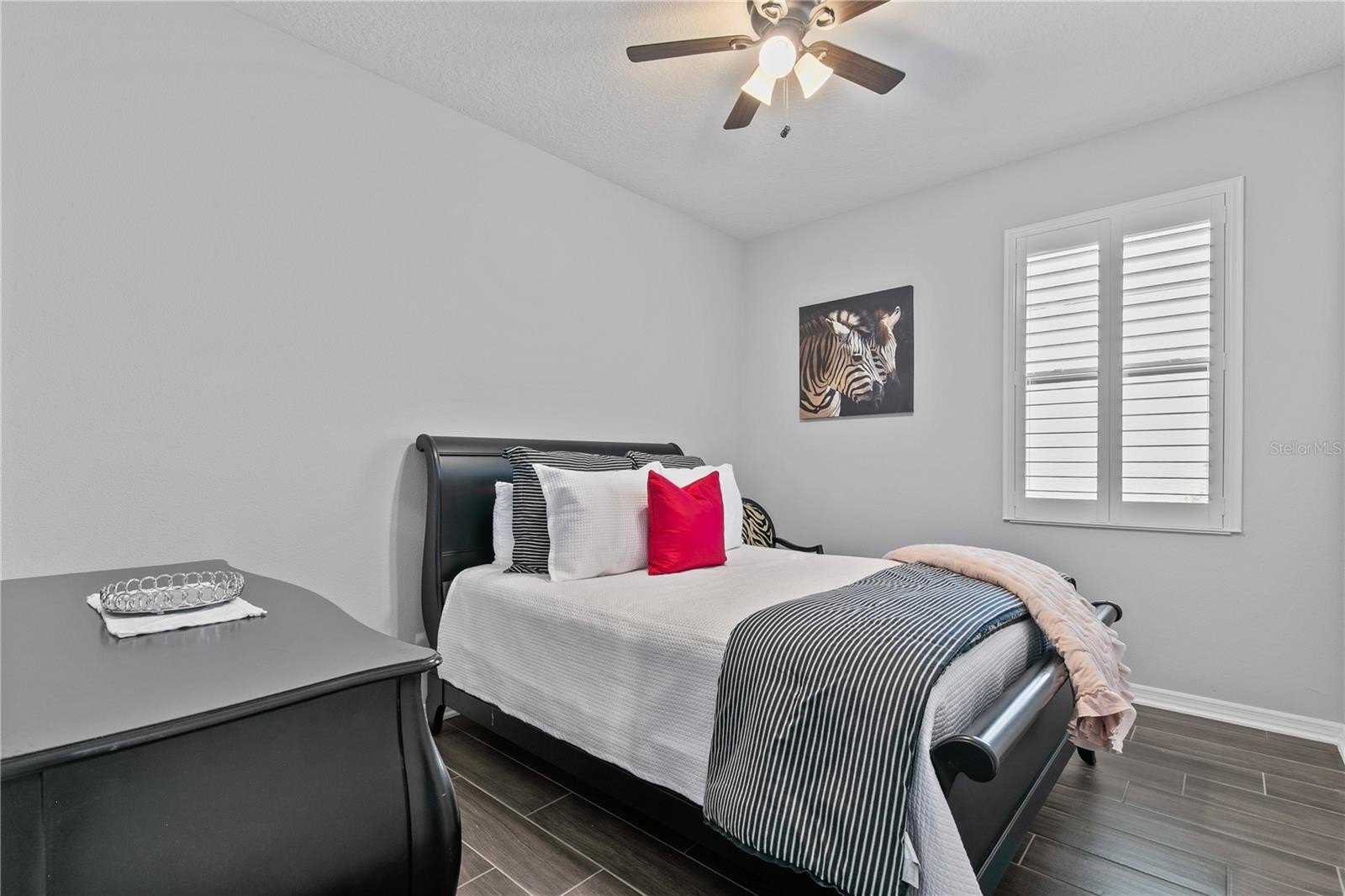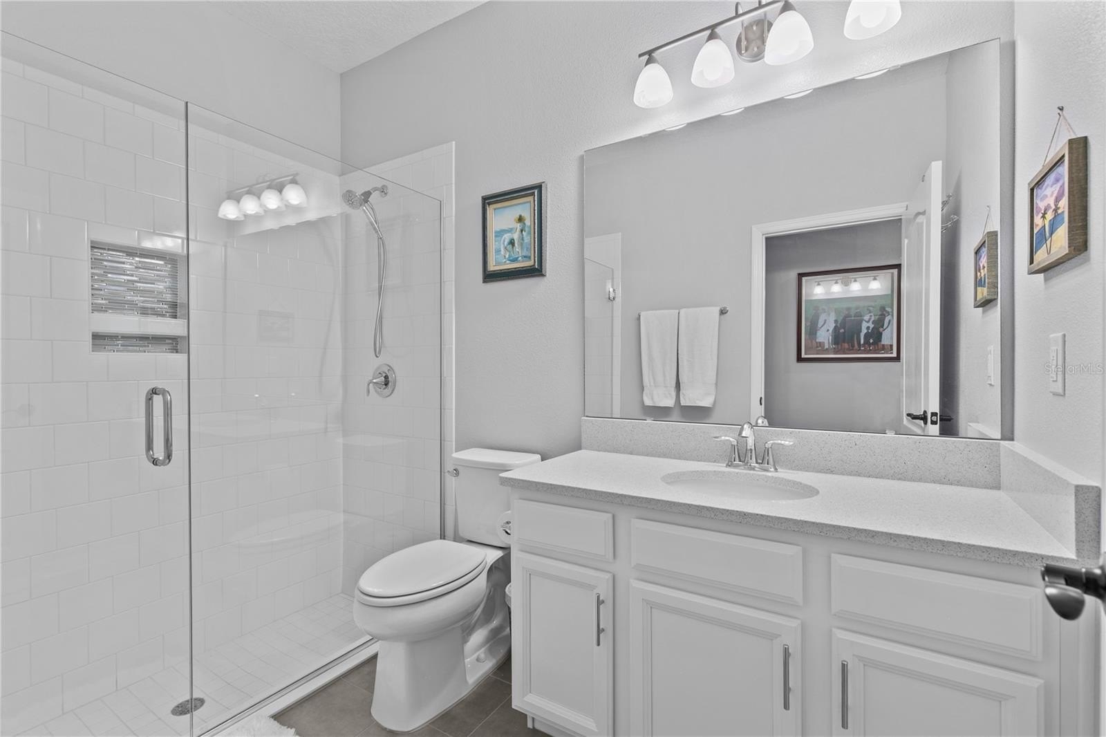 The kitchen and bathrooms feature upgraded finishes, including quartz countertops, while the primary bathroom boasts a beautifully upgraded shower. Additional features include a whole-home water softener system, sprinkler system, and hurricane shutters throughout—even on the sliding glass doors for added peace of mind.