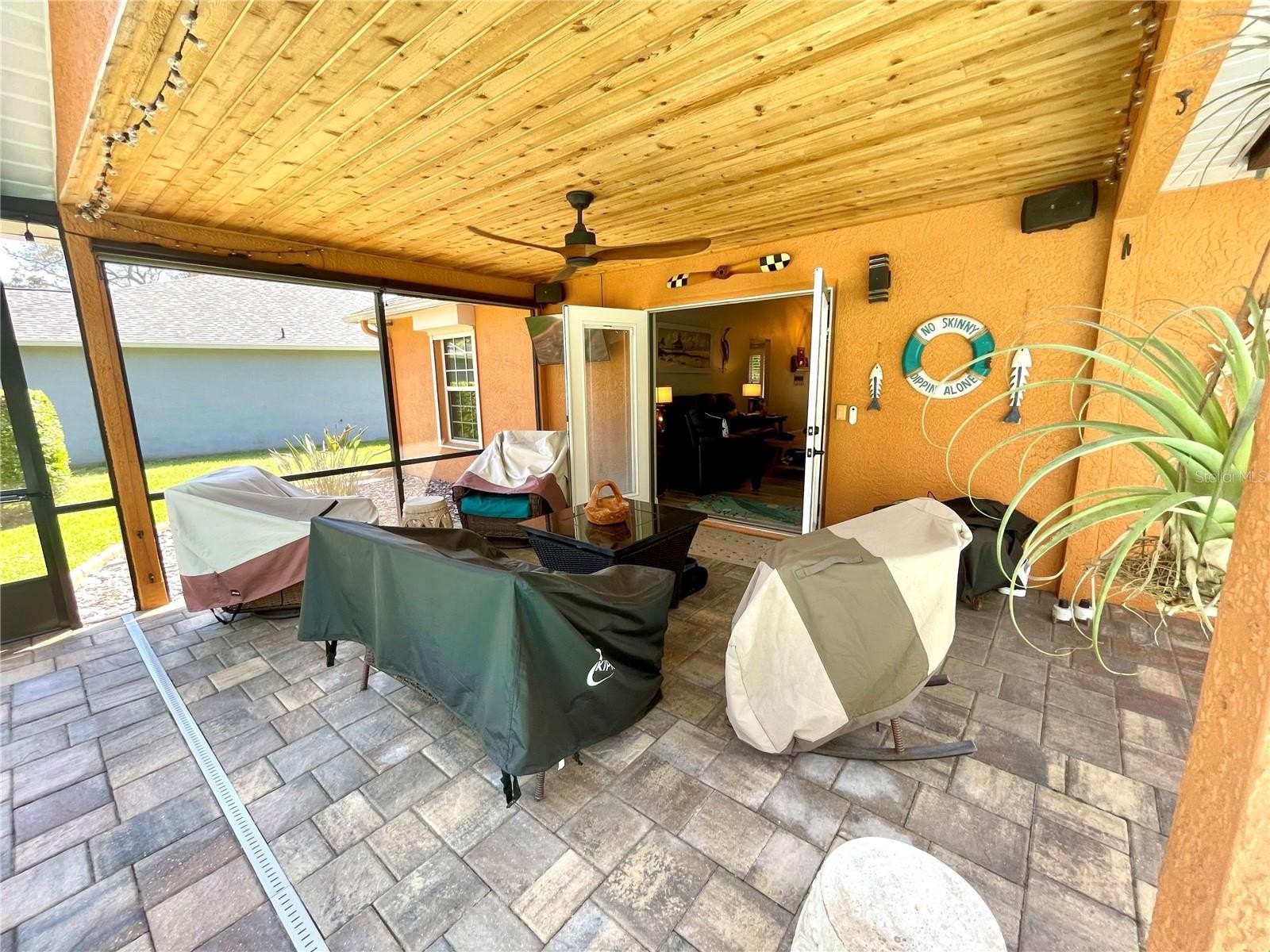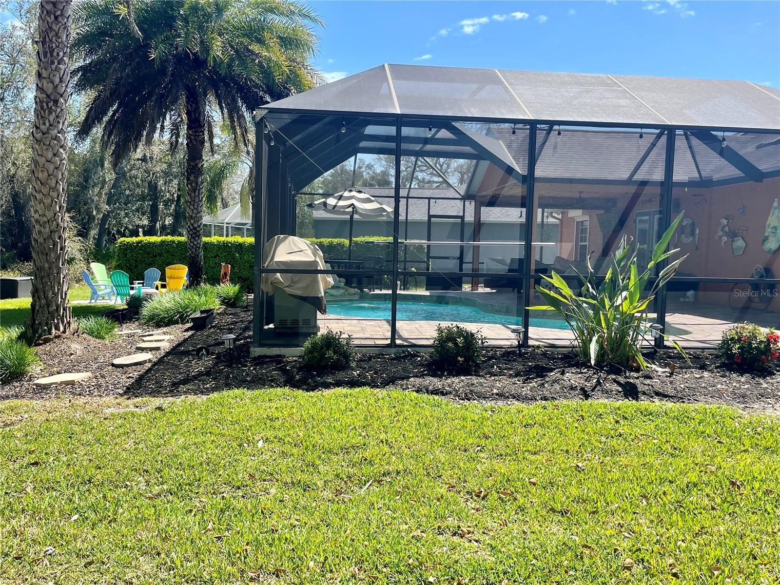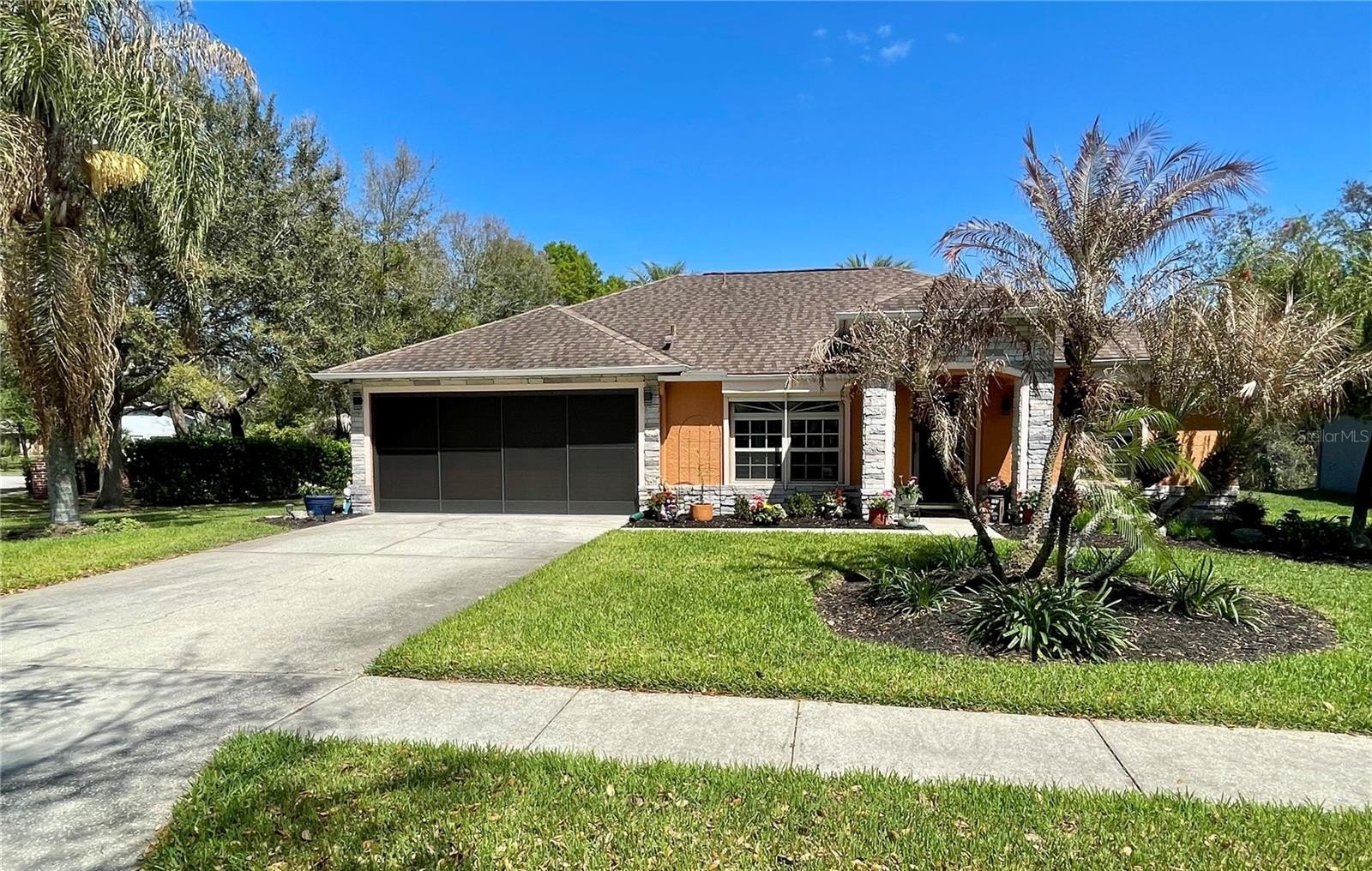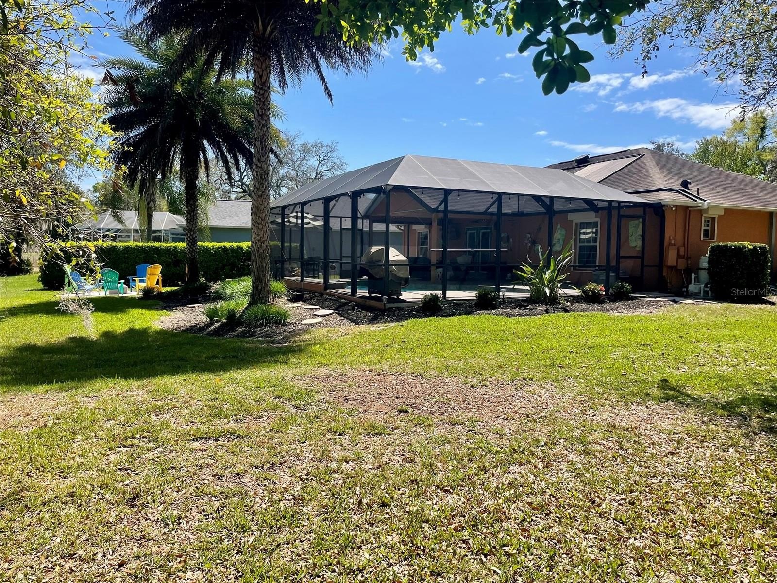 Turnkey 3-Bedroom, 2-Bath Beauty on Corner Lot - Move-In Ready! This immaculate pool home shows pride of ownership. Meticulously maintained, offering the perfect blend of comfort, style, and functionality. Situated on a beautifully landscaped corner lot, the curb appeal sets the stage for what awaits inside. As you step through the front door, you'll immediately notice the soaring cathedral ceilings and the wood plank matte porcelain tile throughout the entire home. That enhances the spacious feel of the open floor plan. The thoughtfully designed split-bedroom floor plan offers privacy between the bedrooms and there are two beautifully updated bathrooms. The neutral color palette throughout makes it easy to add your own personal touch. The renovated kitchen is a showstopper, featuring timeless cabinetry, stone countertops, a breakfast bar and ample workspace for any chef. Featuring top of the line BOSCH appliances. Blackout screened in garage gives another area to enjoy bug free. Walk through your French doors to your outside OASIS! Featuring screened-in pool area with covered seating area for comfort, with fire pit and TV. Enjoy the Salt Water heated pool with cascading water fall for relaxation. Finish your evening with a stroll to your private circular outdoor fire pit area on a perfect evening. Don't forget to rub to Totem Pole for luck! Home shows better in person. You will not be disappointed! LIST OF FEATURES:SALT WATER POOL,PUSH-BUTTON AUTOMATIC HURRICANE SHUTTERS ON ALL WINDOWS, OUTDOOR NIGHT-VISION CLOSED CIRCUIT CAMERAS, ELECTRIC FIREPLACE, FIRE-PIT, INDOOR-OUTDOOR SATELLITE XM RADIO, PLANTATION SHUTTERS ON ALL WINDOWS, SOLAR HEATED POOL, POOL ROBOT, WATERFALL, BLACKOUT GARAGE SCREEN, HURRICANE RESISTANT & ENERGY-SAVING TINTED WINDOWS, EPOXY GARAGE FLOOR.
