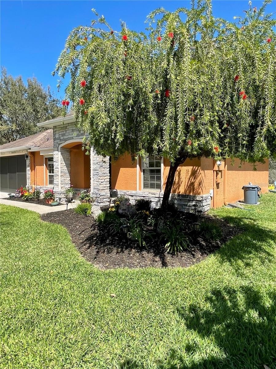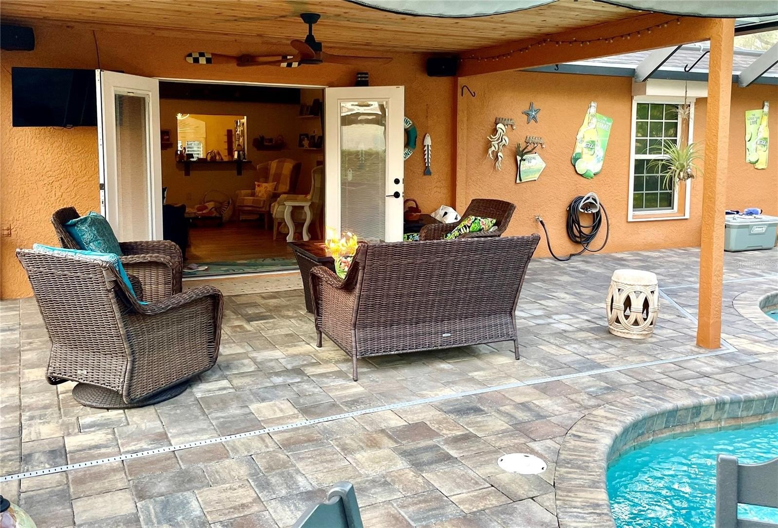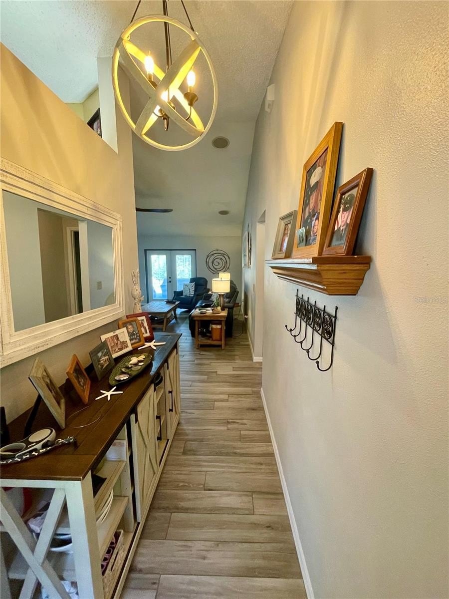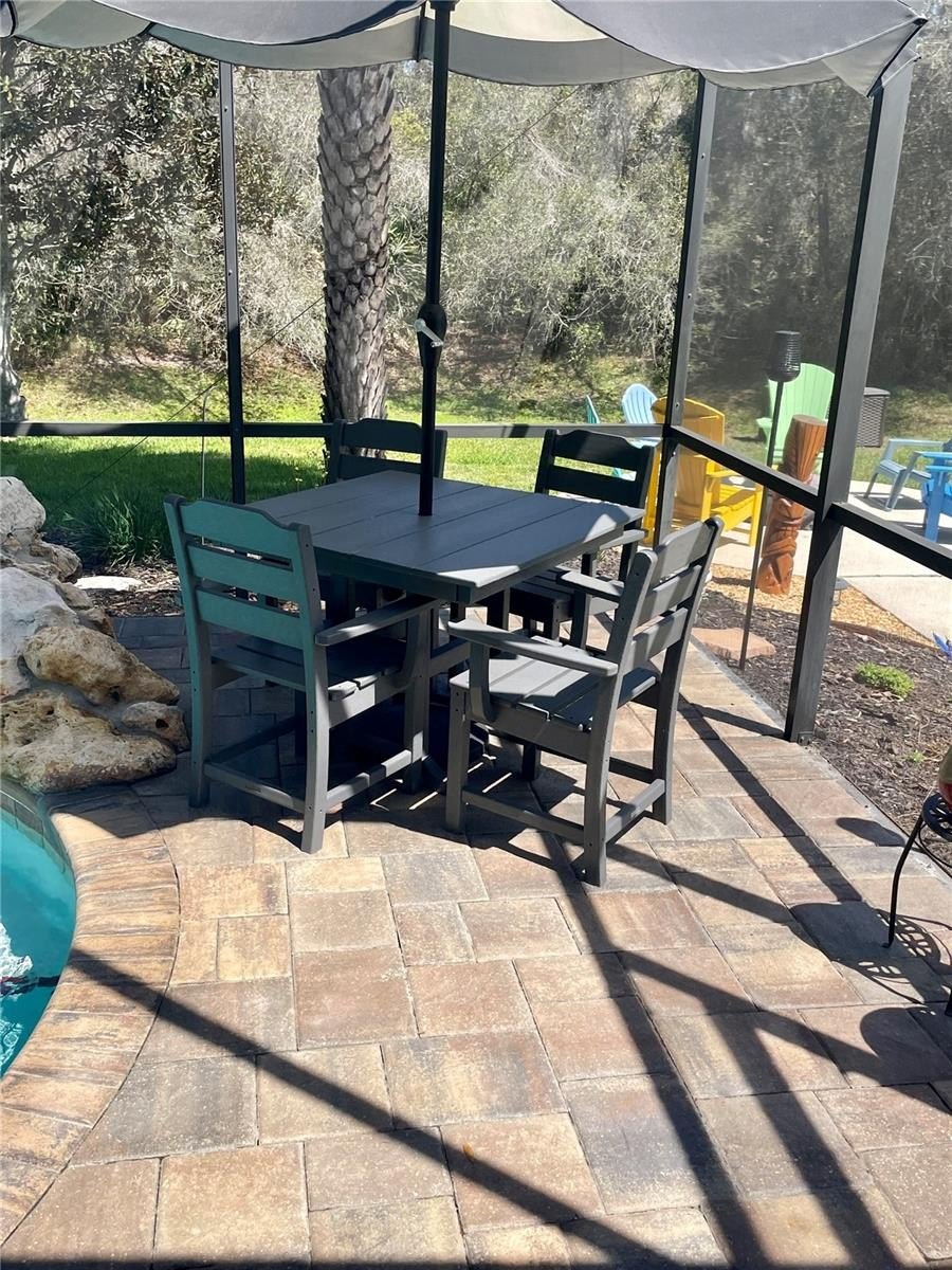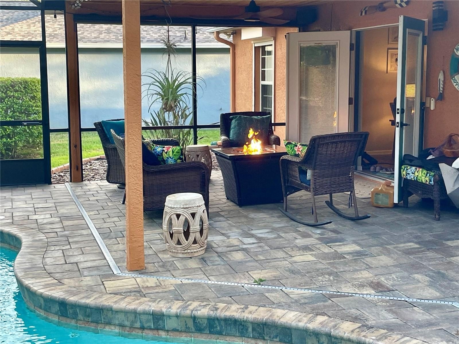 Turnkey 3-Bedroom, 2-Bath Beauty on Corner Lot - Move-In Ready! This immaculate pool home shows pride of ownership. Meticulously maintained, offering the perfect blend of comfort, style, and functionality. Situated on a beautifully landscaped corner lot, the curb appeal sets the stage for what awaits inside. As you step through the front door, you'll immediately notice the soaring cathedral ceilings and the wood plank matte porcelain tile throughout the entire home. That enhances the spacious feel of the open floor plan. The thoughtfully designed split-bedroom floor plan offers privacy between the bedrooms and there are two beautifully updated bathrooms. The neutral color palette throughout makes it easy to add your own personal touch. The renovated kitchen is a showstopper, featuring timeless cabinetry, stone countertops, a breakfast bar and ample workspace for any chef. Featuring top of the line BOSCH appliances. Blackout screened in garage gives another area to enjoy bug free. Walk through your French doors to your outside OASIS! Featuring screened-in pool area with covered seating area for comfort, with fire pit and TV. Enjoy the Salt Water heated pool with cascading water fall for relaxation. Finish your evening with a stroll to your private circular outdoor fire pit area on a perfect evening. Don't forget to rub to Totem Pole for luck! Home shows better in person. You will not be disappointed! LIST OF FEATURES:SALT WATER POOL,PUSH-BUTTON AUTOMATIC HURRICANE SHUTTERS ON ALL WINDOWS, OUTDOOR NIGHT-VISION CLOSED CIRCUIT CAMERAS, ELECTRIC FIREPLACE, FIRE-PIT, INDOOR-OUTDOOR SATELLITE XM RADIO, PLANTATION SHUTTERS ON ALL WINDOWS, SOLAR HEATED POOL, POOL ROBOT, WATERFALL, BLACKOUT GARAGE SCREEN, HURRICANE RESISTANT & ENERGY-SAVING TINTED WINDOWS, EPOXY GARAGE FLOOR.