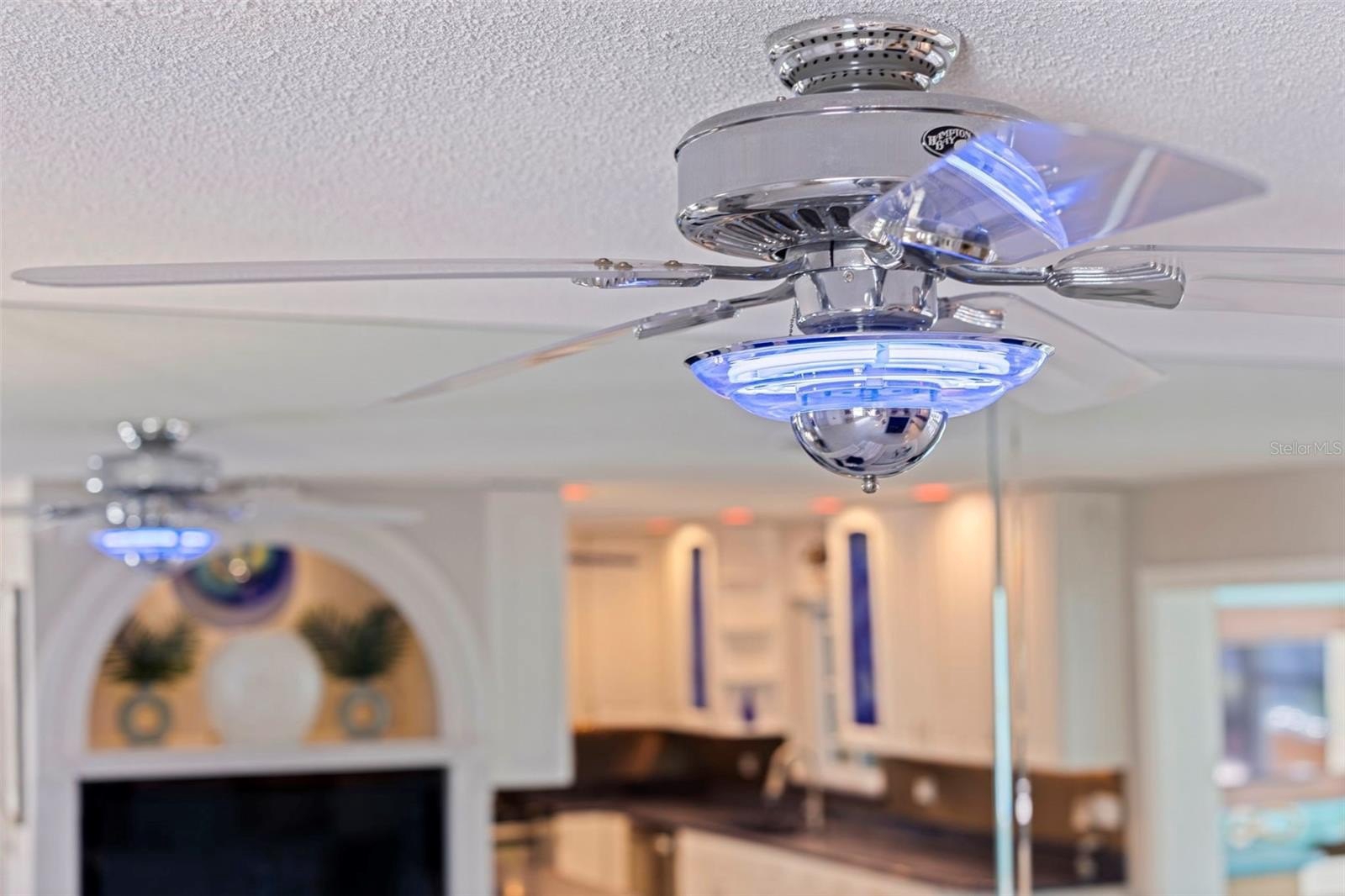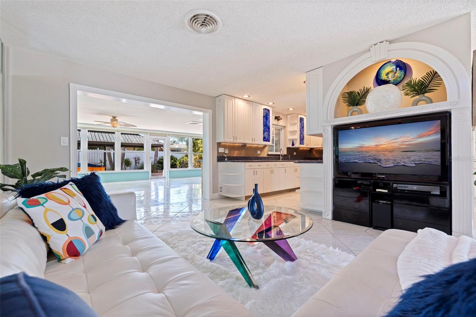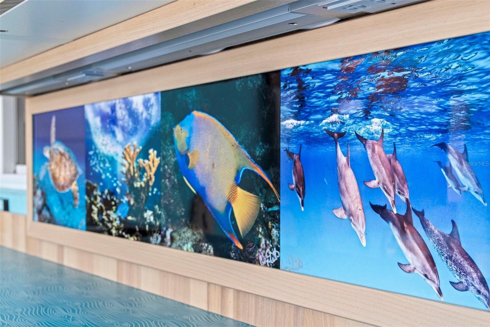 A 660 sq-ft addition to the back of the home (2017) with its own mini-split heat pump system provides tons of extra entertaining space and features a wall of windows that bring the outdoor oasis inside. The flooring is gorgeous beige honed and filled Travertine tile … beachy, beautiful and easy to maintain. A wet bar and second stainless refrigerator accompany light Ash cabinets with pull-out drawers and interior lighting, whimsical blown-glass cabinet pulls embedded with fish and coral, and sea-life art tiles to frame out the backsplash! Both full baths (the primary bath is ensuite) mirror the modern feel and celebrate the sea: Glass shower doors with fish, sea turtles and undersea foliage and unique eclectic lighting fixtures.
