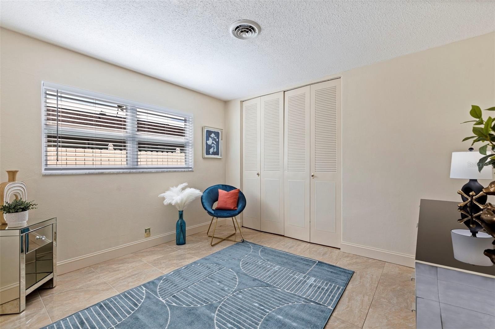 The primary bedroom in the back of the home features a laminate wall system that houses a California-King platform bed, dual nightstands with pull-out shelves, interior LED lighting and storage bins. Two other bedrooms in the front of the home have built-in closet systems and porcelain tile floors.