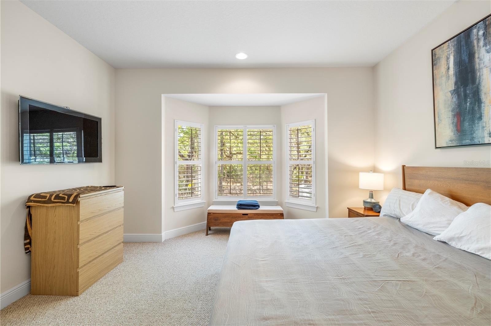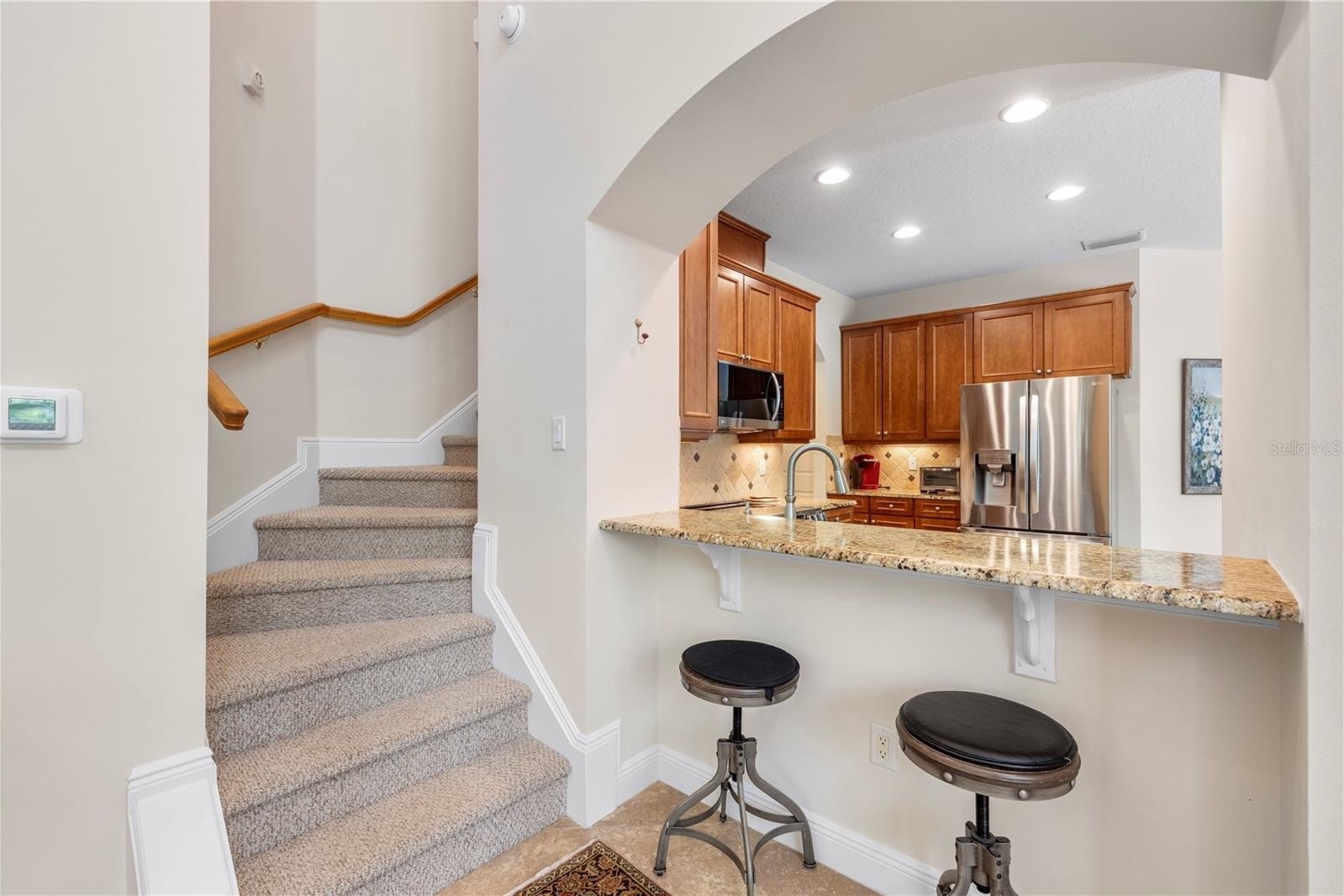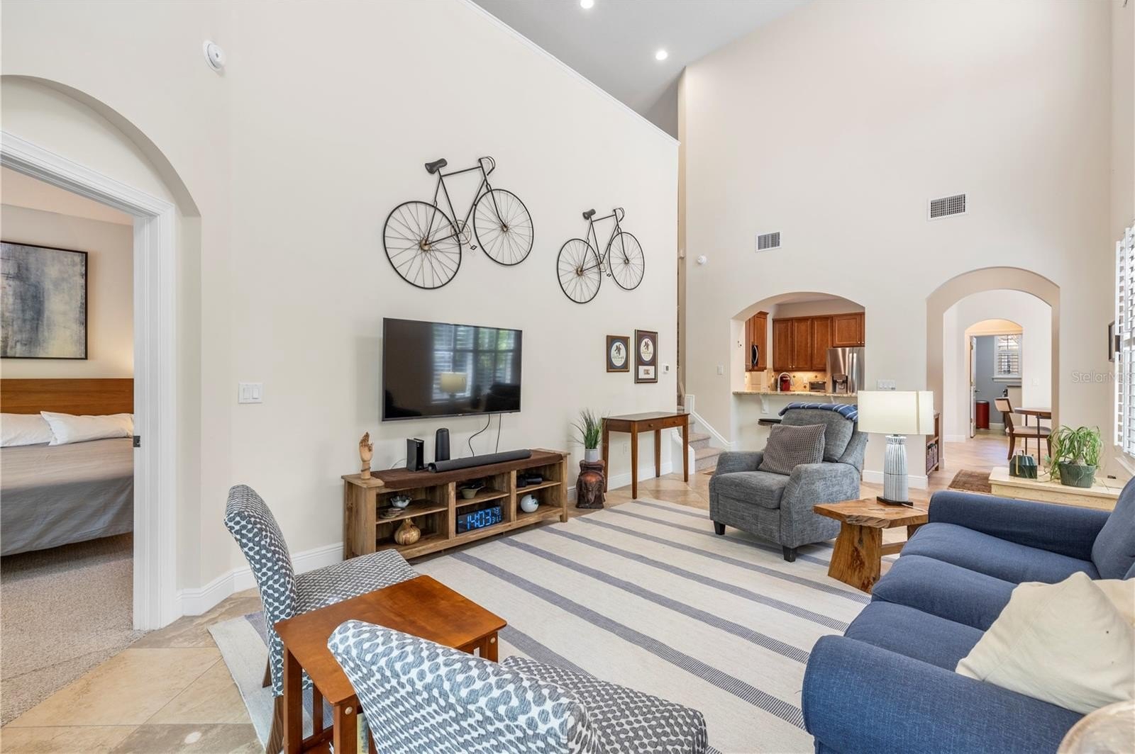 An expansive front deck creates a warm welcome and the perfect setting to enjoy morning coffee while overlooking peaceful greenery. Inside, the main level features 18x18 ceramic tile flooring, soaring ceilings in the living room, abundant natural light, and beautiful interior shutters throughout. The kitchen overlooks the main living space, creating an ideal flow for entertaining, and includes maple cabinetry with crown molding, granite countertops, custom tile backsplash, stainless steel appliances purchased in late 2024, recessed lighting, and a breakfast nook with views of the front deck and surrounding greenery. Just off the kitchen is space for a dry bar nook with additional shelving and space for a beverage cooler. A half bath for guests and a well-equipped laundry room with a full-size washer and dryer, utility sink, and folding station. To complete the main level, you conveniently have your spacious primary suite with dual vanities, a soaking tub, a separate shower, and a generous walk-in closet.