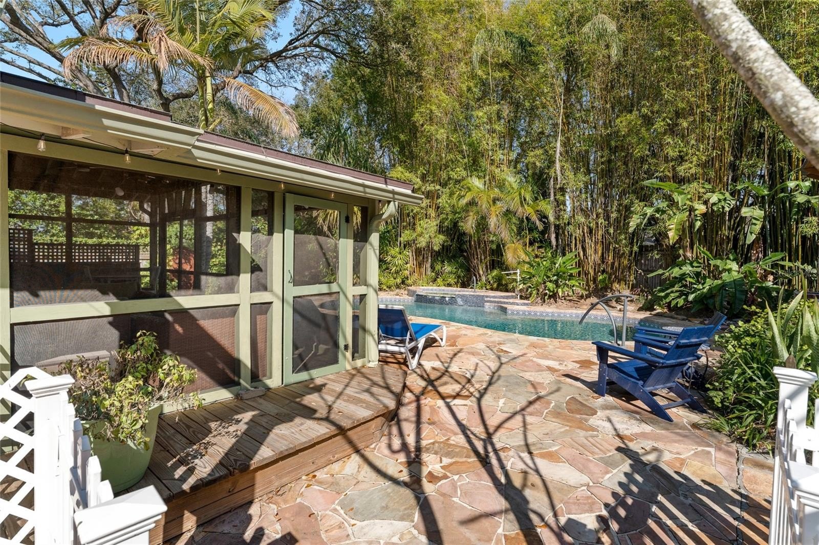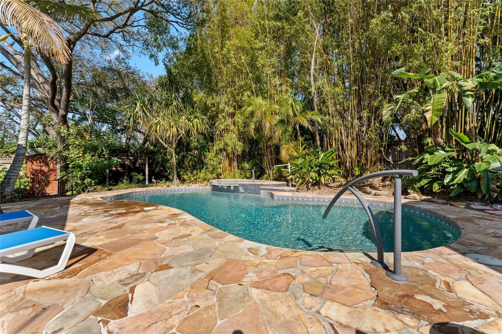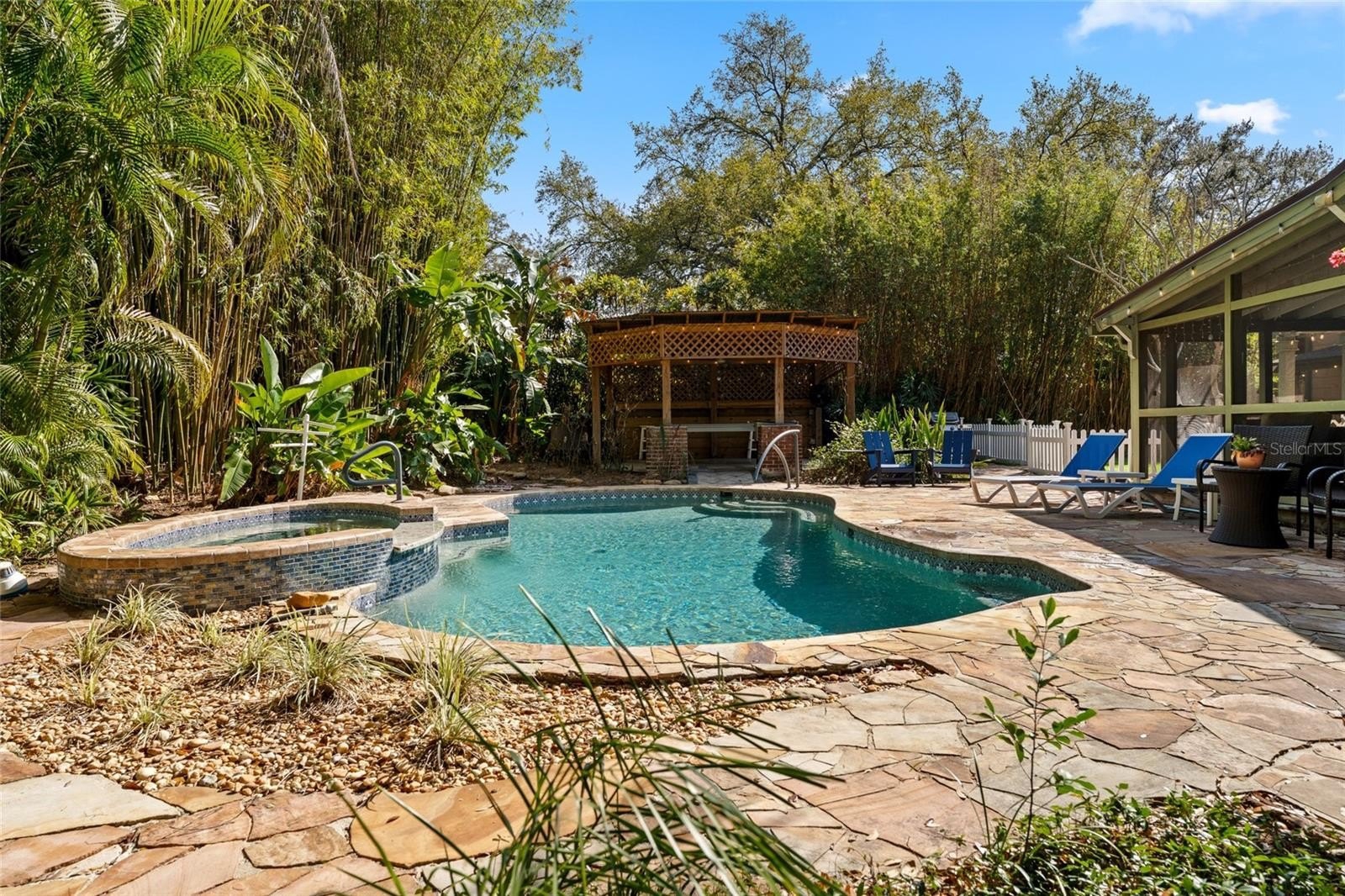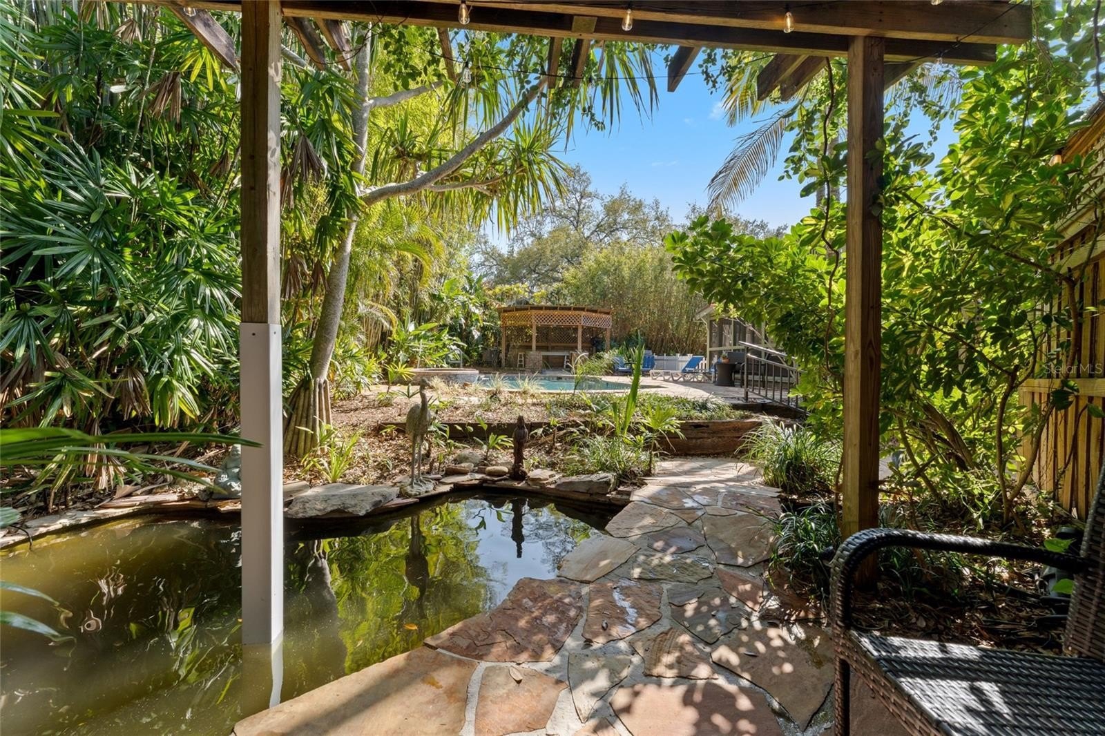 Step outside and the property truly transforms into a private retreat. The backyard is lush and immersive, surrounded by mature bamboo and tropical landscaping that creates a peaceful, secluded atmosphere. The pool has been completely redone and now serves as a stunning focal point, featuring a freeform design with a heated spillover spa, natural stone decking, and a serene, resort-like feel. A dining gazebo and multiple lounging areas make it perfect for entertaining, while a dedicated astroturf dog run adds everyday convenience.