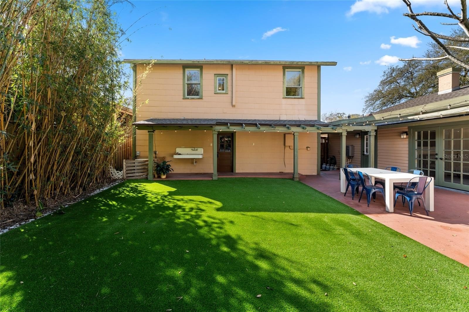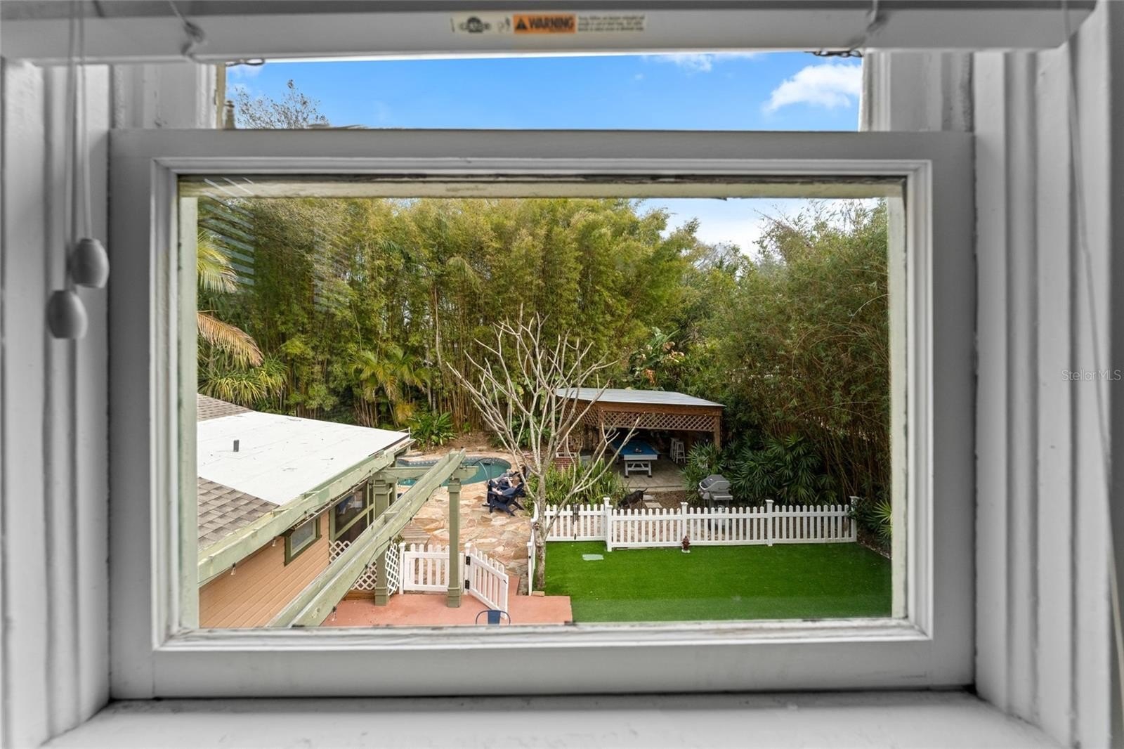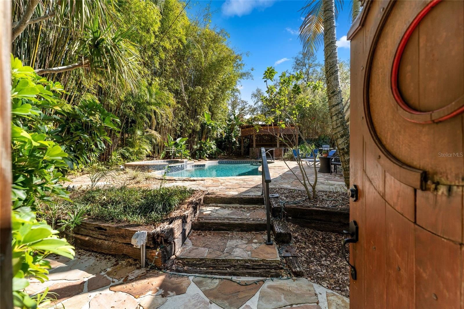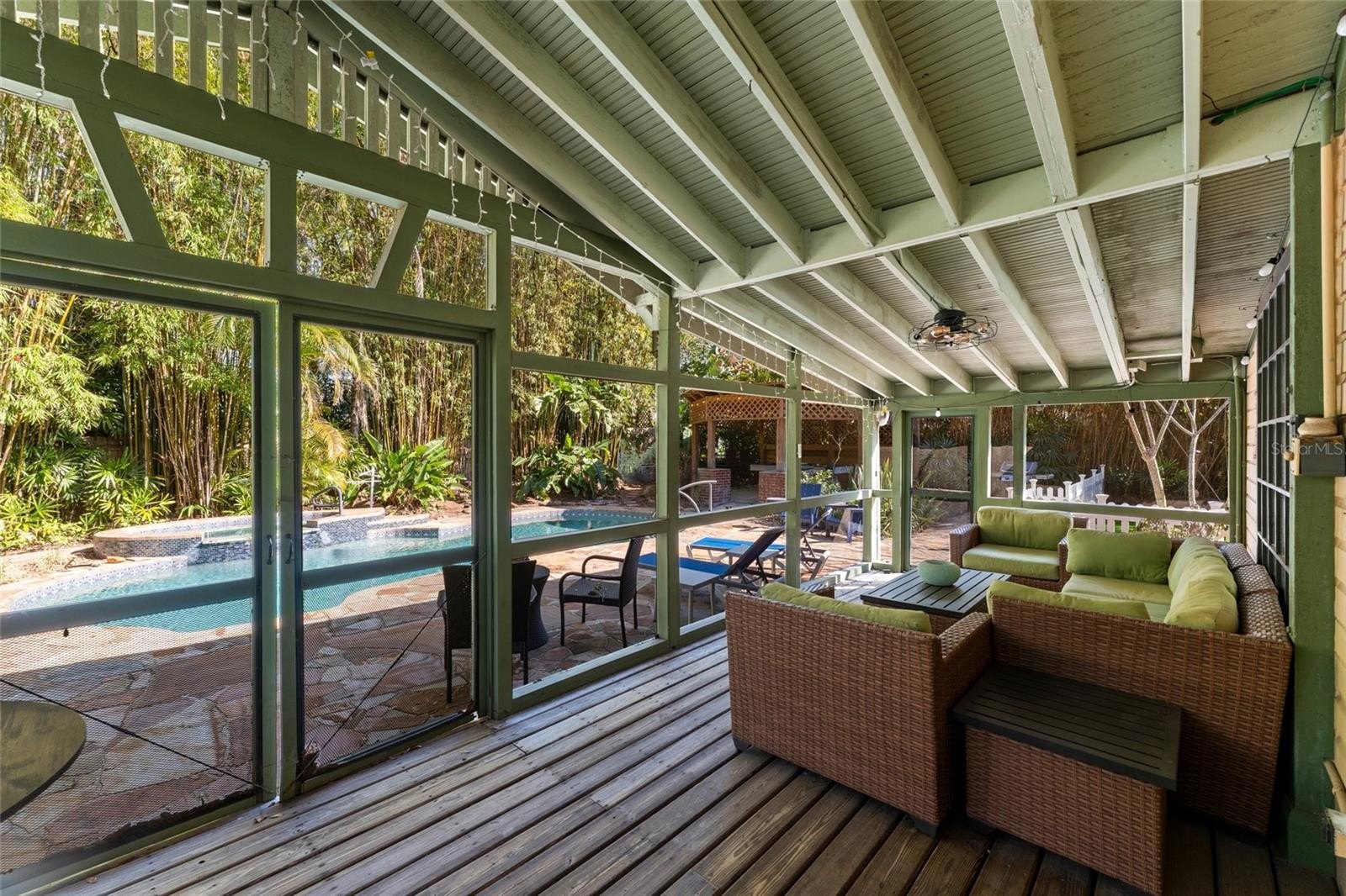 Step outside and the property truly transforms into a private retreat. The backyard is lush and immersive, surrounded by mature bamboo and tropical landscaping that creates a peaceful, secluded atmosphere. The pool has been completely redone and now serves as a stunning focal point, featuring a freeform design with a heated spillover spa, natural stone decking, and a serene, resort-like feel. A dining gazebo and multiple lounging areas make it perfect for entertaining, while a dedicated astroturf dog run adds everyday convenience.