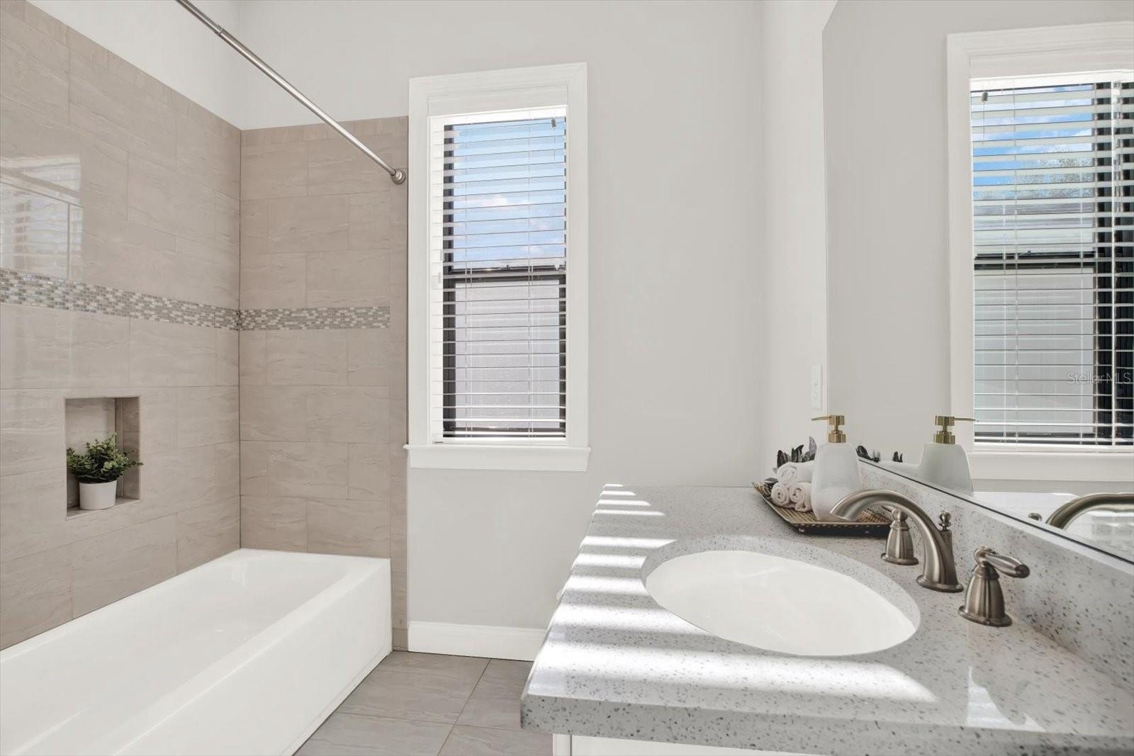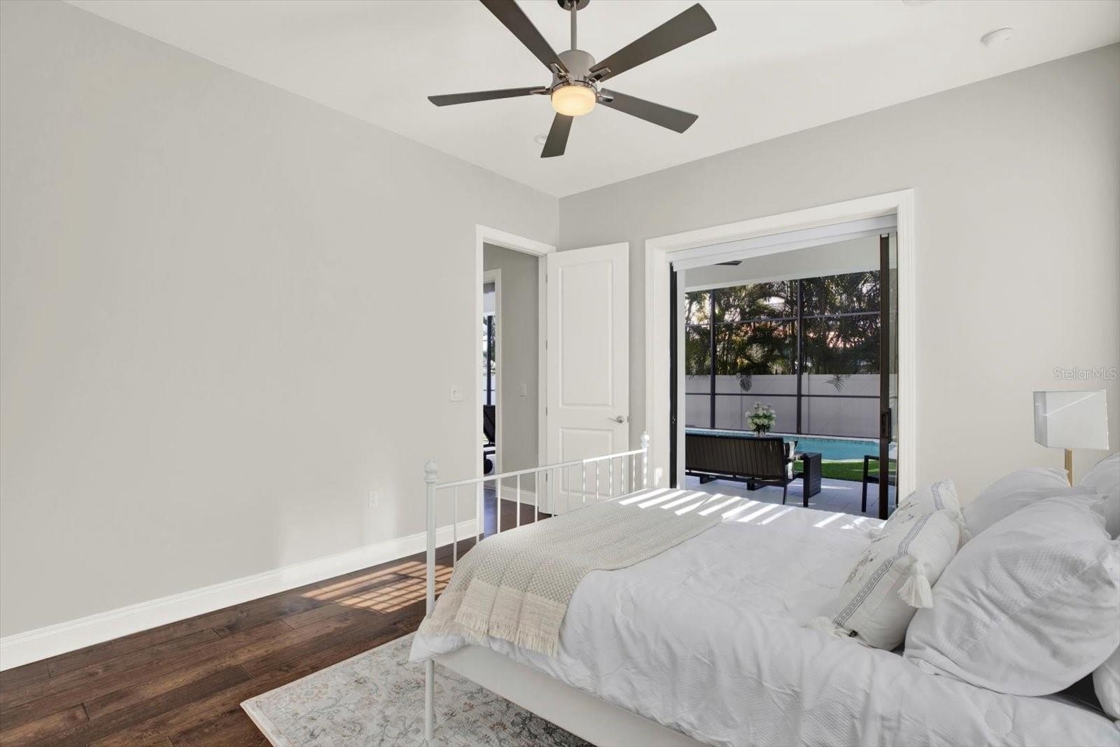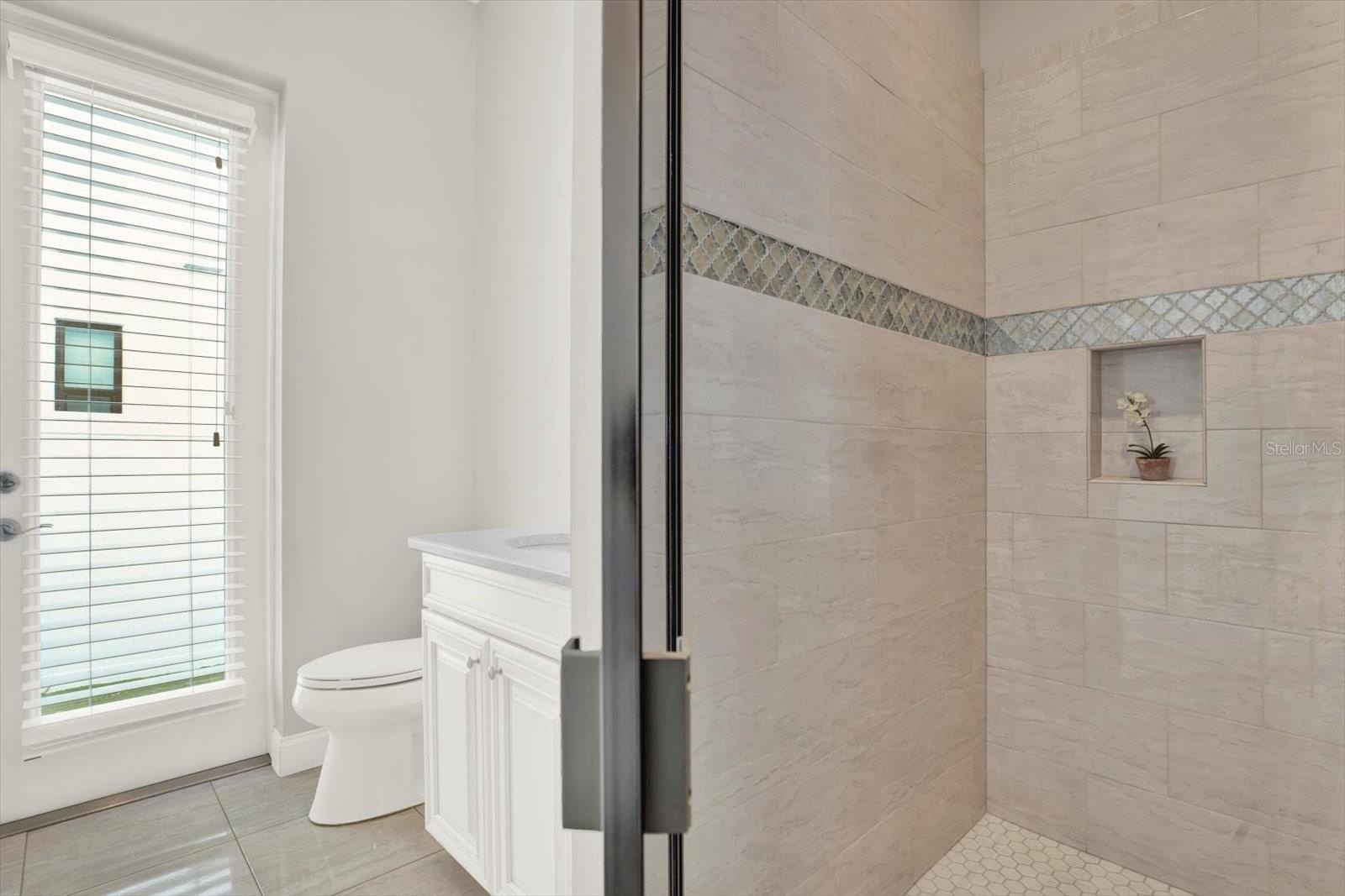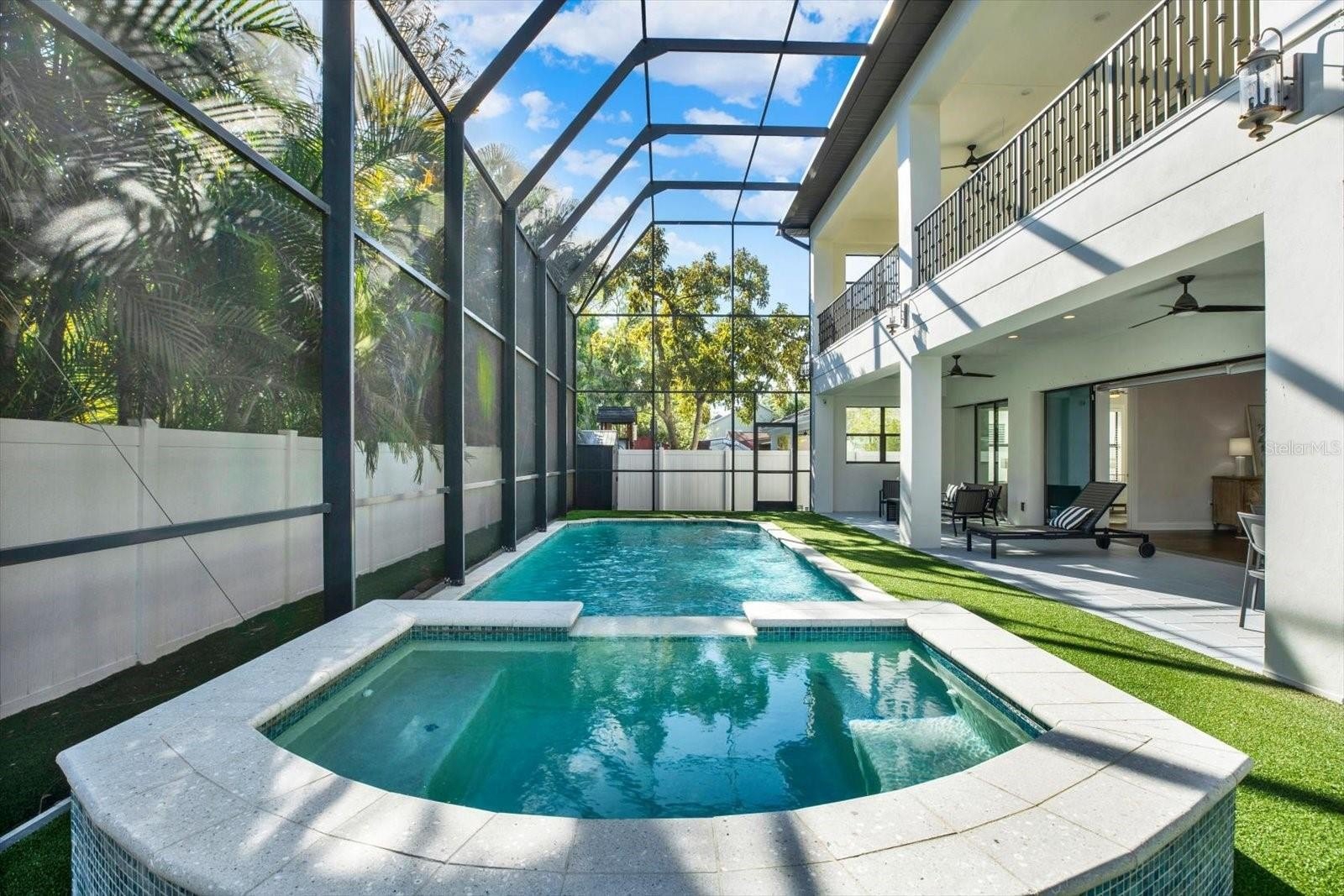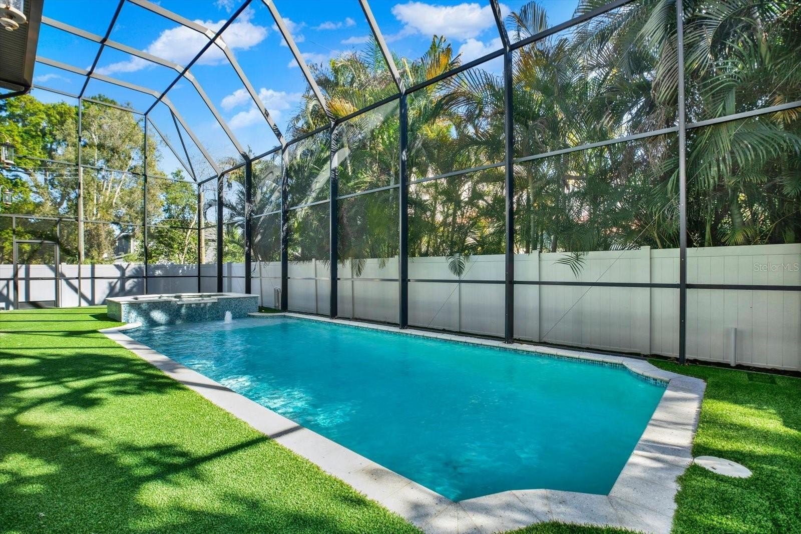 Outdoors, a private retreat awaits. The heated saltwater pool and spa are set within an enclosed lanai, complemented by an outdoor kitchen—perfect for hosting or relaxing year-round. The grounds are wrapped in 360-degree turf for a refined, low-maintenance aesthetic, while the absence of large trees allows for effortless upkeep. A durable tiled roof adds both beauty and longevity.