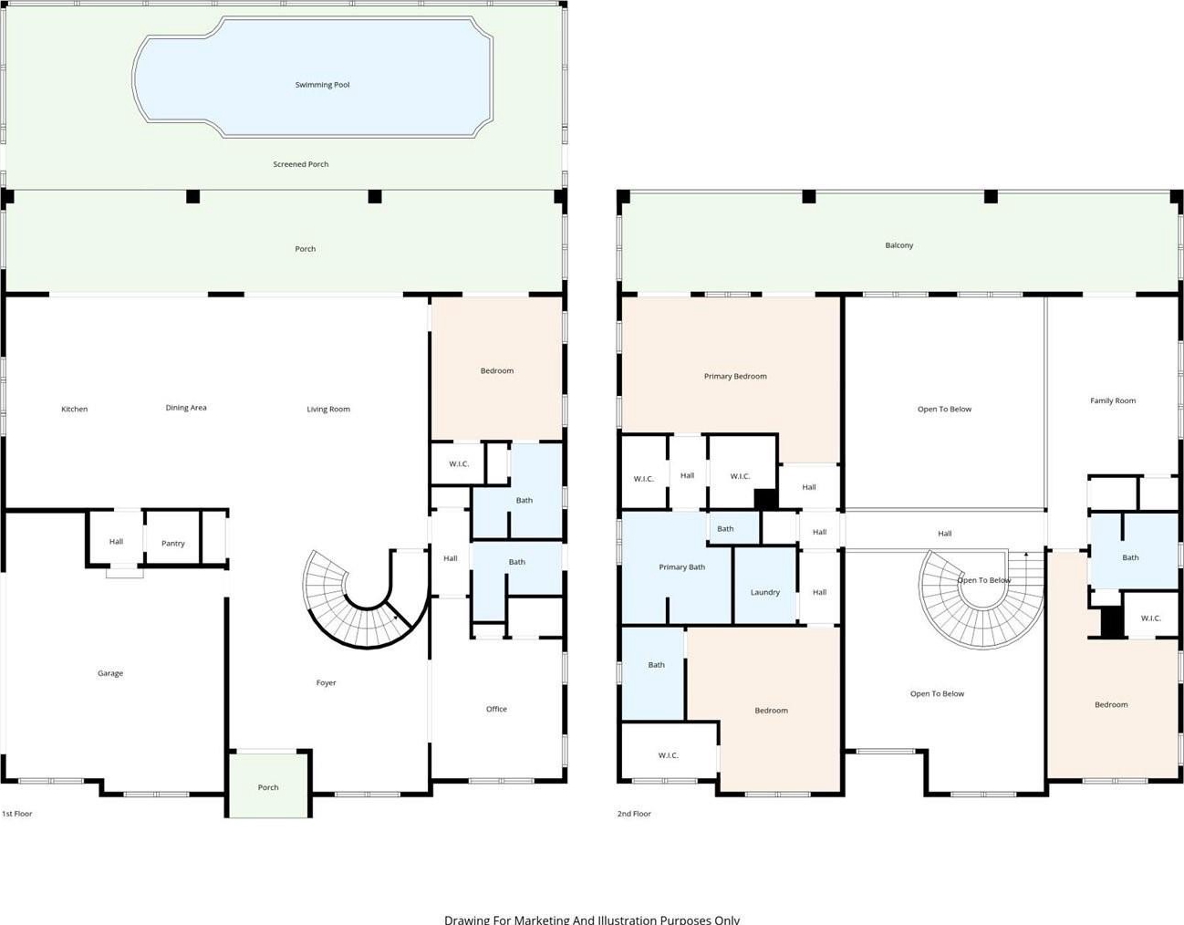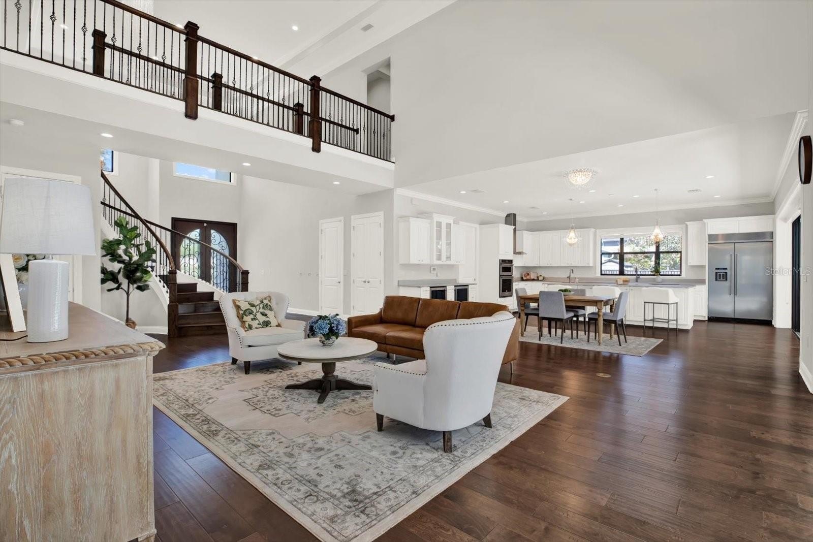A grand entry begins with dramatic double doors that open to an impressive foyer, where a sweeping spiral staircase is complemented by three chandeliers—creating a striking and sophisticated first impression. Thoughtfully designed with an emphasis on flow and balance, the home offers a seamless transition between spaces, enhancing both everyday living and entertaining.