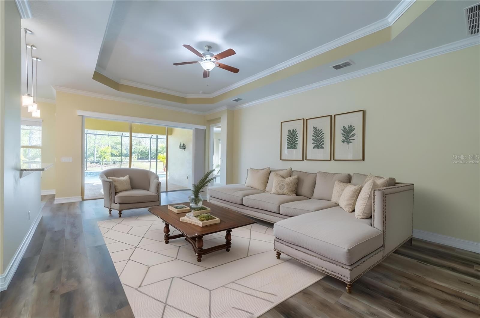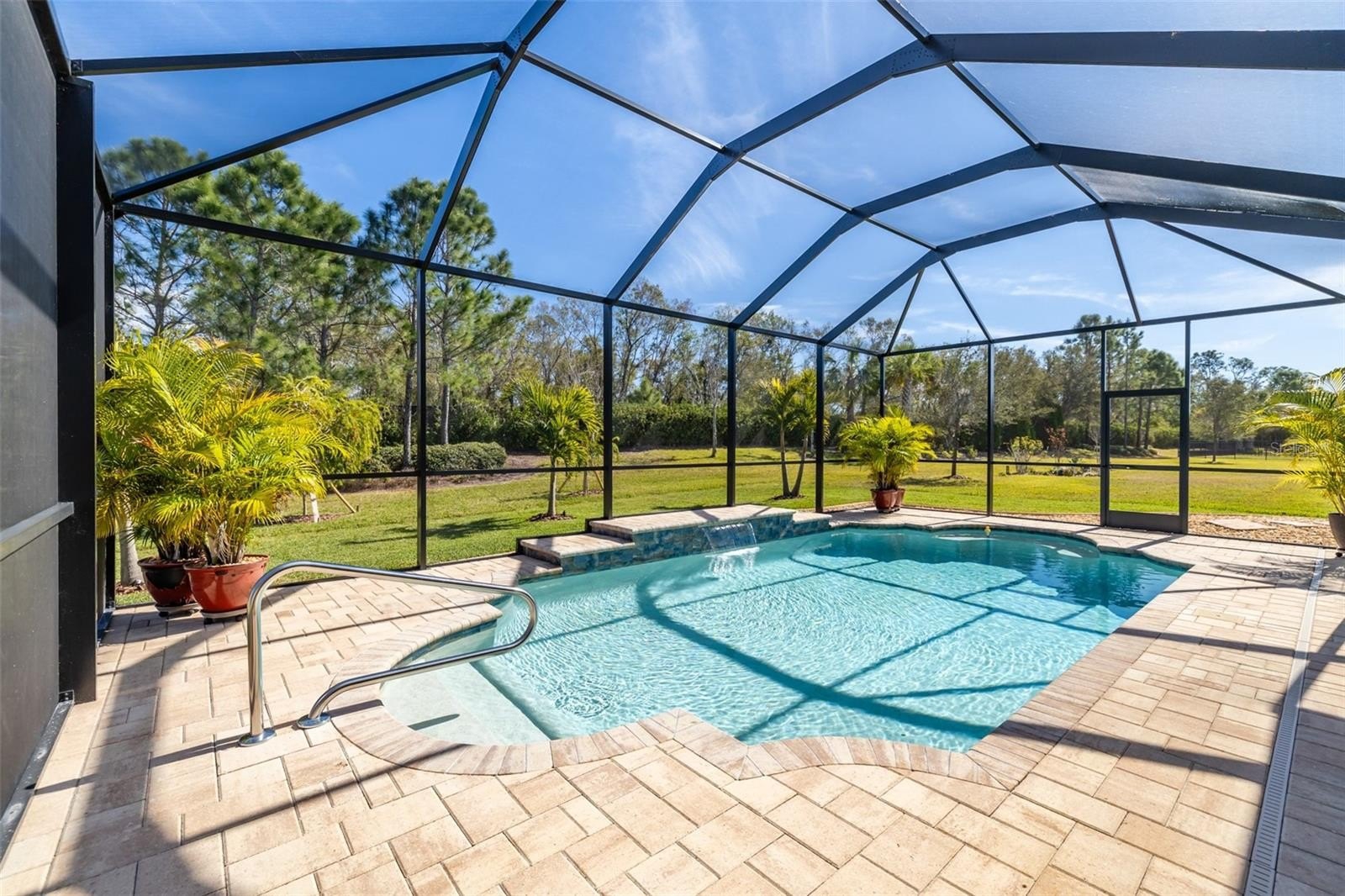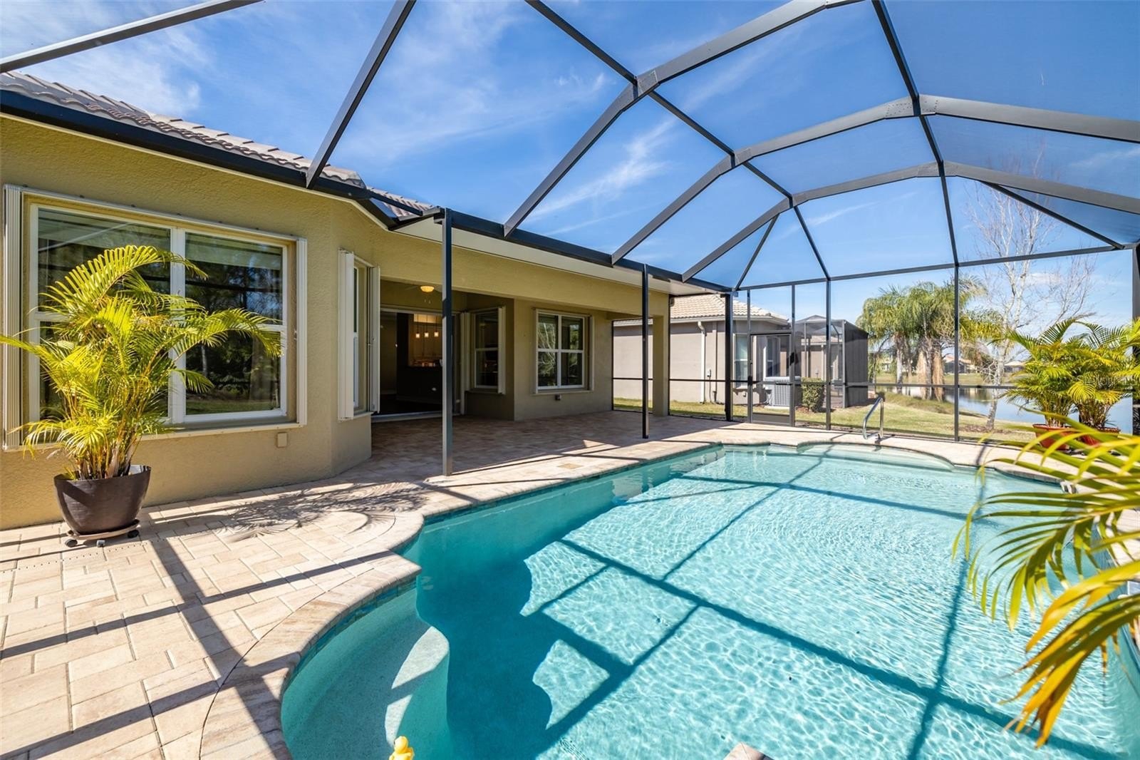 Live your idyllic life in Valencia Lakes, Tampa Bay’s premier 55+ Active Adult community. 2016 GL Homes built PALAZZO with 2,191sf under air , 3 bedrooms, an office, great room, dining room, kitchen, dinette, 2.5-car garage, and a massive backyard oasis with a gorgeous pool. Exceptionally manicured gardens with landscape lighting, and enclosed river rock surrounds the whole perimeter creating amazing curb appeal. A large screened-in front portico leads to the French double-door entrance into the spacious foyer with 10’-11’ tray ceiling. Left of the foyer the office basks in natural light from two windows providing a westerly view of the front gardens. Right of the foyer are two generously sized guest bedrooms with lighted ceiling fans and a second full bathroom with a 10mm frameless glass walk-in shower and a spacious laundry room, featuring a MAYTAG Commercial Technology washer & dryer and a practical utility sink. Adjacent to the foyer is the powder room and a built-in linen closet & abundant storage.The superbly well-appointed Kitchen features 42” solid maple chiffon white cabinetry with soft-close drawers and doors and stainless-steel sliding shelves, over & under cabinet lighting, luxurious granite counters topped by a discrete mosaic glass and stainless-steel backsplash, stainless appliances and a single basin sink. Aft of the kitchen is a dinette with two windows overlooking the lanai and pool.The dinette also has a large pantry replete with sliding shelves. A bar-height counter separates the kitchen and the great room.The expansive great room has a 10’-11’ tray ceiling with ceiling fan and 12’ wide glass sliders providing a truly incredible view of the backyard oasis. The roomy primary bedroom features an expansive bay window to capture magnificent sunrises, a high tray-ceiling with a lighted ceiling fan, two custom walk-in closets, and a very large ensuite bathroom. The ensuite bathroom has two separated vanities with Corian counters with integrated sinks capped by wall-to-wall mirrors, a large walk-in shower, linen closet, and a water-closet for the luxury height commode.The backyard features a 330sf lanai with an additional 5’ solid cover and a stunning 30’x15’ gunite pool with a linear fountain, led lighting, and a JANDY heat pump. The pool is enclosed within a 38’x 24 screen room with doors on both sides and the backyard extends another 30 feet to the East. An amazing water view lies North of the property. Signature Collection 9”x60” LVP throughout the home (no transitions), and crown molding graces the roof line. Environmental comforts are assured by a 2022 4-Ton COMFORTMAKER HVAC with a germicidal UV light and MERV 8 filter and a MICROAIR EasyStart Flex Soft Starter on the compressor, Culligan high efficiency water softener system, a Rheem 50-gal water heater with a GRUNDFOS recirculation pump, TECO Zap Cap, Accordion hurricane shutters, and whole-house gutters. This property is exceptional. Valencia Lakes offers a vibrant, resort-style lifestyle centered around a spectacular 40,000 sq.ft.clubhouse featuring live entertainment, dances, more than 100 clubs and a newly renovated Cafe. Residents enjoy 7 pickleball courts, 6 lighted Har-Tru tennis courts, softball field, bocce, shuffleboard, basketball half court, miles of walking paths, craft studio, card & billiards rooms, community garden, dog park, resort-style pool, resistance and lap pools, sauna and steam rooms, and a 5,000 sq. ft. state-of-the-art fitness center.