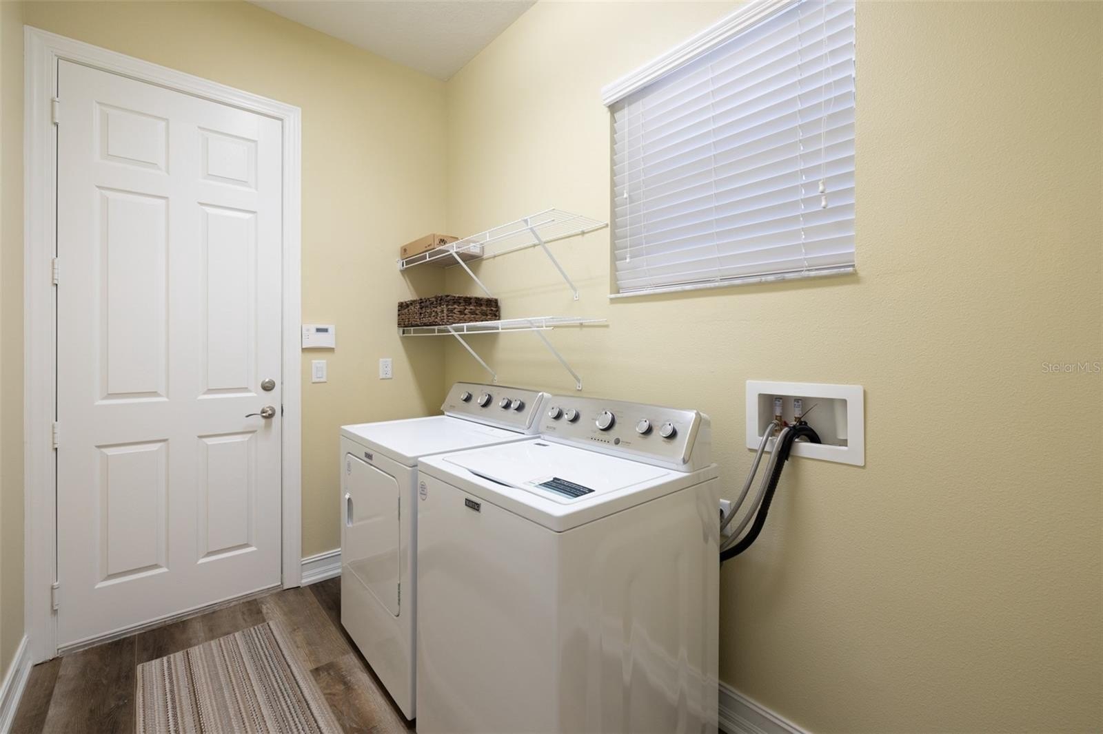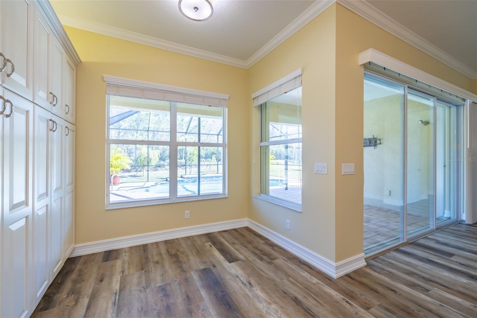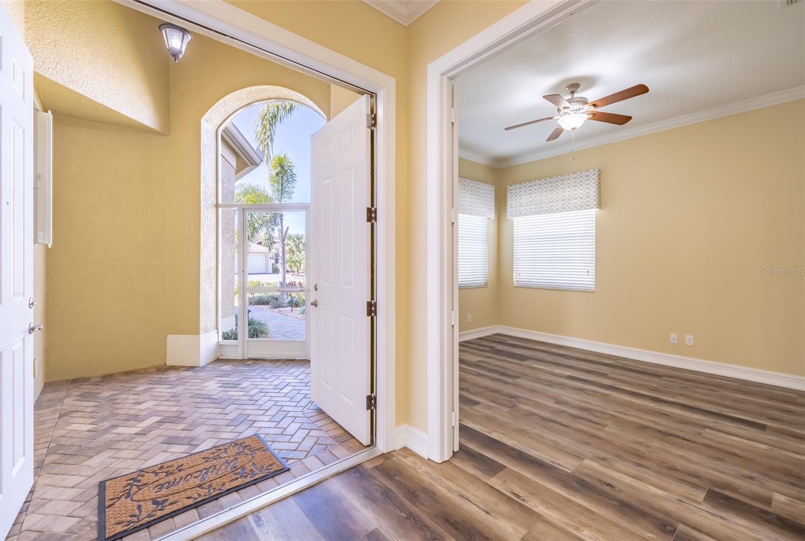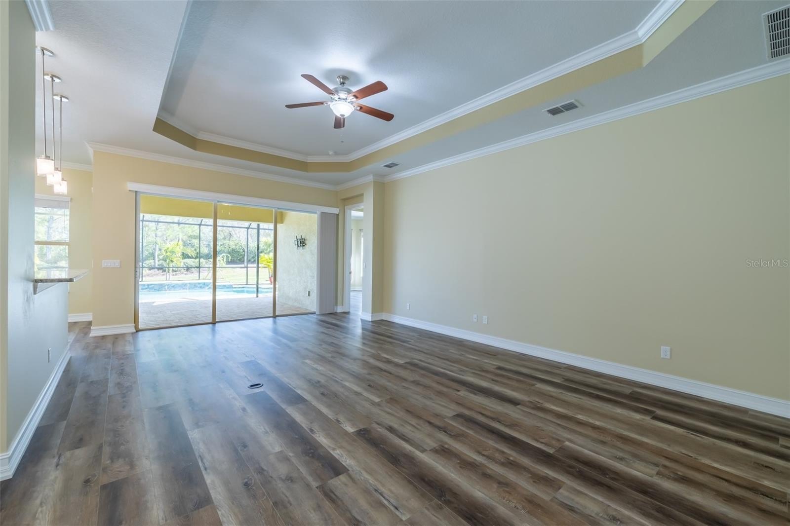 Live your idyllic life in Valencia Lakes, Tampa Bay’s premier 55+ Active Adult community. 2016 GL Homes built PALAZZO with 2,191sf under air , 3 bedrooms, an office, great room, dining room, kitchen, dinette, 2.5-car garage, and a massive backyard oasis with a gorgeous pool. Exceptionally manicured gardens with landscape lighting, and enclosed river rock surrounds the whole perimeter creating amazing curb appeal. A large screened-in front portico leads to the French double-door entrance into the spacious foyer with 10’-11’ tray ceiling. Left of the foyer the office basks in natural light from two windows providing a westerly view of the front gardens. Right of the foyer are two generously sized guest bedrooms with lighted ceiling fans and a second full bathroom with a 10mm frameless glass walk-in shower and a spacious laundry room, featuring a MAYTAG Commercial Technology washer & dryer and a practical utility sink. Adjacent to the foyer is the powder room and a built-in linen closet & abundant storage.The superbly well-appointed Kitchen features 42” solid maple chiffon white cabinetry with soft-close drawers and doors and stainless-steel sliding shelves, over & under cabinet lighting, luxurious granite counters topped by a discrete mosaic glass and stainless-steel backsplash, stainless appliances and a single basin sink. Aft of the kitchen is a dinette with two windows overlooking the lanai and pool.The dinette also has a large pantry replete with sliding shelves. A bar-height counter separates the kitchen and the great room.The expansive great room has a 10’-11’ tray ceiling with ceiling fan and 12’ wide glass sliders providing a truly incredible view of the backyard oasis. The roomy primary bedroom features an expansive bay window to capture magnificent sunrises, a high tray-ceiling with a lighted ceiling fan, two custom walk-in closets, and a very large ensuite bathroom. The ensuite bathroom has two separated vanities with Corian counters with integrated sinks capped by wall-to-wall mirrors, a large walk-in shower, linen closet, and a water-closet for the luxury height commode.The backyard features a 330sf lanai with an additional 5’ solid cover and a stunning 30’x15’ gunite pool with a linear fountain, led lighting, and a JANDY heat pump. The pool is enclosed within a 38’x 24 screen room with doors on both sides and the backyard extends another 30 feet to the East. An amazing water view lies North of the property. Signature Collection 9”x60” LVP throughout the home (no transitions), and crown molding graces the roof line. Environmental comforts are assured by a 2022 4-Ton COMFORTMAKER HVAC with a germicidal UV light and MERV 8 filter and a MICROAIR EasyStart Flex Soft Starter on the compressor, Culligan high efficiency water softener system, a Rheem 50-gal water heater with a GRUNDFOS recirculation pump, TECO Zap Cap, Accordion hurricane shutters, and whole-house gutters. This property is exceptional. Valencia Lakes offers a vibrant, resort-style lifestyle centered around a spectacular 40,000 sq.ft.clubhouse featuring live entertainment, dances, more than 100 clubs and a newly renovated Cafe. Residents enjoy 7 pickleball courts, 6 lighted Har-Tru tennis courts, softball field, bocce, shuffleboard, basketball half court, miles of walking paths, craft studio, card & billiards rooms, community garden, dog park, resort-style pool, resistance and lap pools, sauna and steam rooms, and a 5,000 sq. ft. state-of-the-art fitness center.