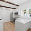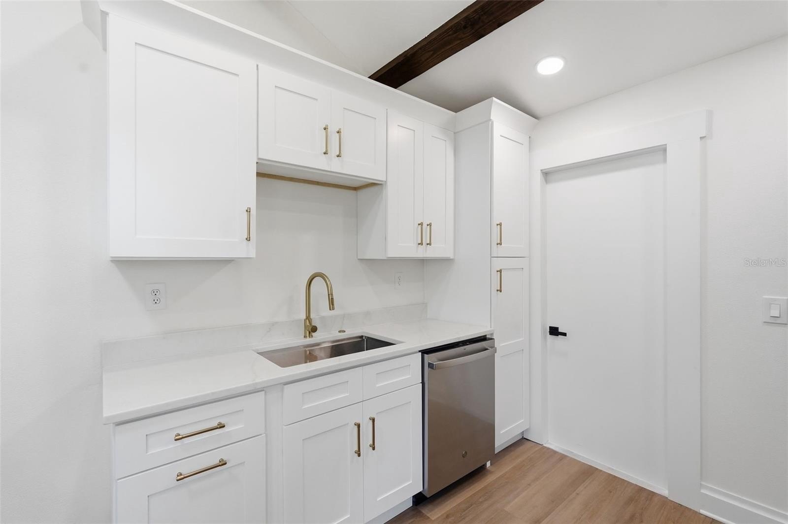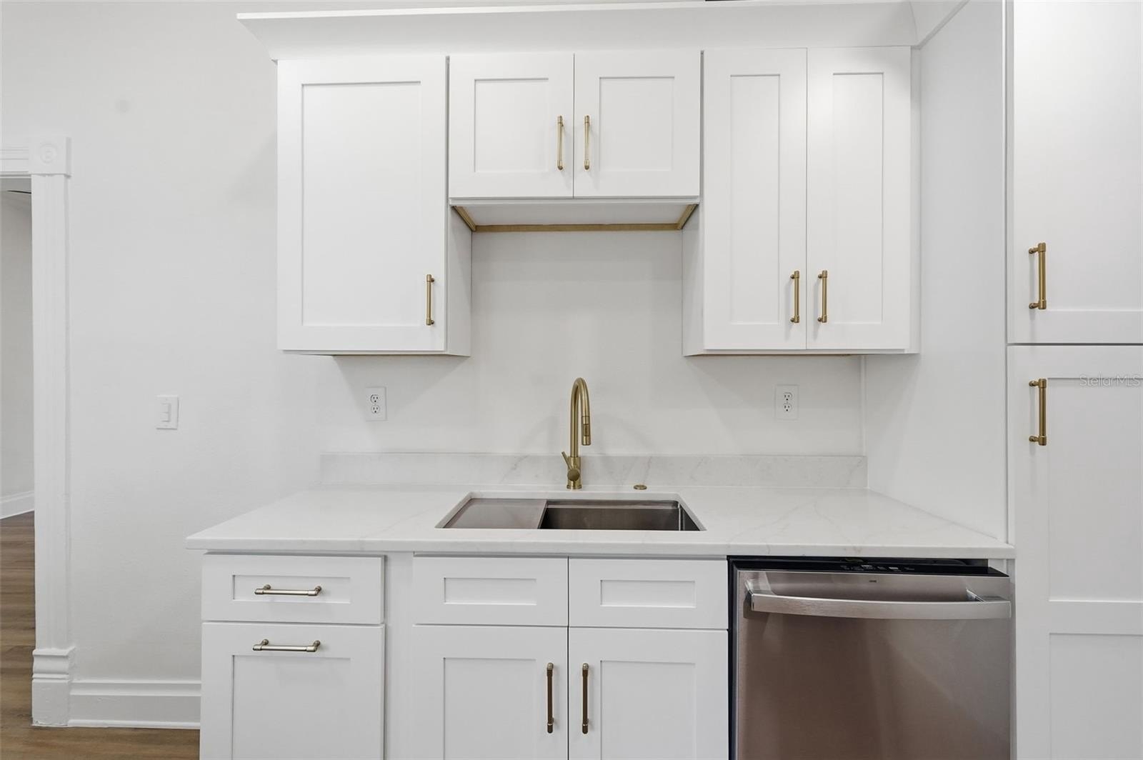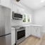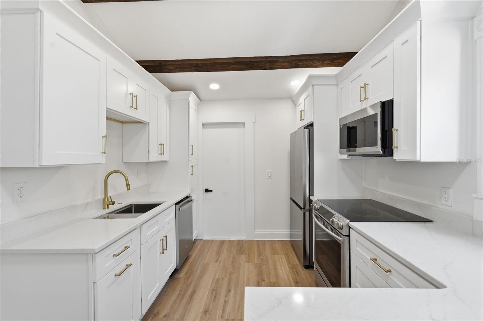 The kitchen has been redesigned with quartz countertops featuring a waterfall edge, modern cabinetry, and a full suite of appliances, including Samsung refrigerator, range, and microwave, along with a GE dishwasher.
