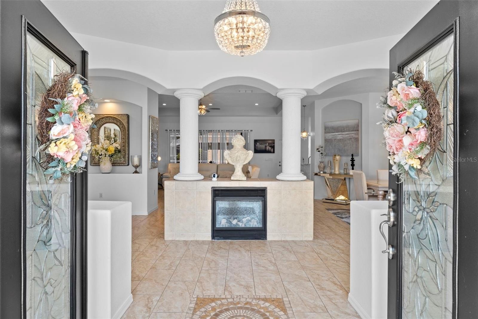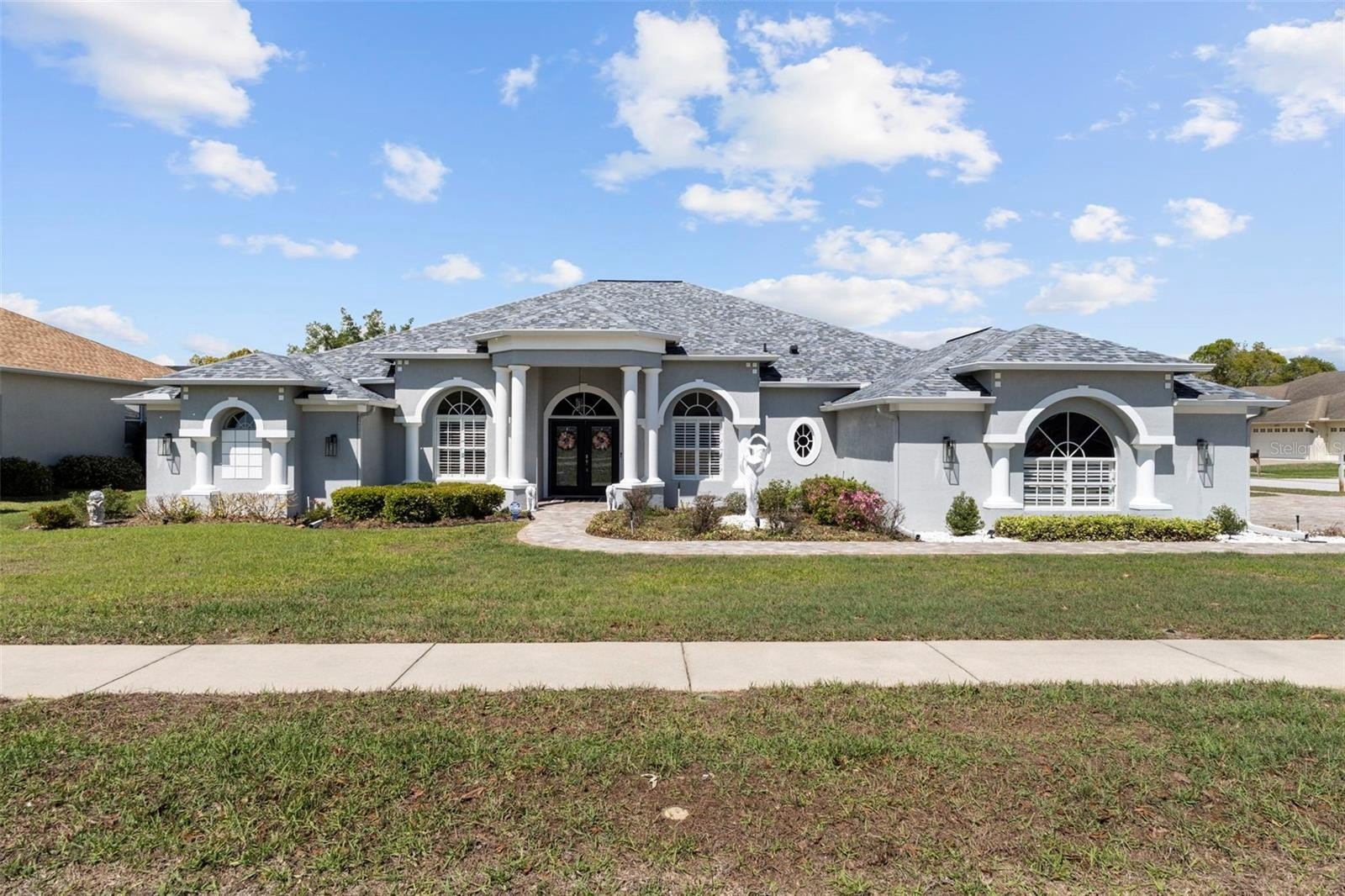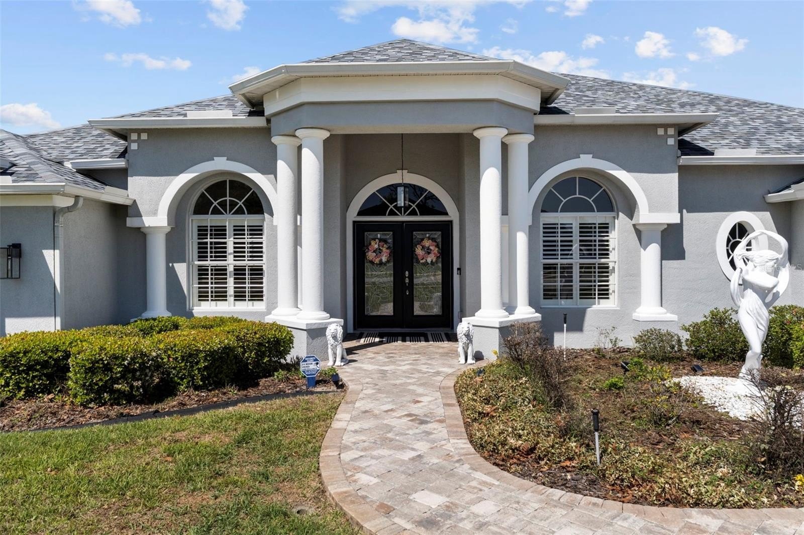 Homes of this caliber--offering privacy, space, and resort-style amenities--are rare to market. Welcome to this exceptional 4-bedroom, 3-bath, 3-car garage estate in the gated community of Pristine Place, perfectly positioned on a premium corner lot with tranquil views of a private retention area. From the moment you arrive, the home sets the tone with double glass entry doors, a grand tiled foyer, decorative columns, and elevated architectural details throughout--including plantation shutters, custom niches, rounded corners, and designer lighting. Thoughtfully designed for elevated living and effortless entertaining, the layout offers a formal dining space, a versatile den or office, and an expansive family room with tray ceilings and triple sliding glass doors that open seamlessly to the outdoor retreat. The chef-inspired kitchen is both refined and functional, featuring dolomite countertops, stainless steel appliances, custom cabinetry, stone accents, and an oversized breakfast bar, complemented by a sunlit breakfast nook overlooking the pool and natural backdrop. The owner's suite is a true sanctuary, complete with a private sitting area, dual closets, and a spa-style bathroom showcasing a garden tub, triple-head walk-in shower, and soaring cathedral ceilings. Spacious guest bedrooms provide flexibility for multi-generational living, work-from-home setups, or additional lifestyle space. Step outside to your private resort-style oasis--a 30-ft heated saltwater pool, separate heated spa with waterfall feature, expansive pavered lanai, and a fully equipped outdoor bar and grill station. Multiple covered seating areas and a screened enclosure create the ultimate setting for year-round luxury living and unforgettable entertaining. Additional highlights include a 15-ft laundry room with abundant storage, epoxy-finished 3-car garage, and meticulous updates throughout, reflecting true pride of ownership. Schedule your private showing today and experience the lifestyle this exceptional home delivers.