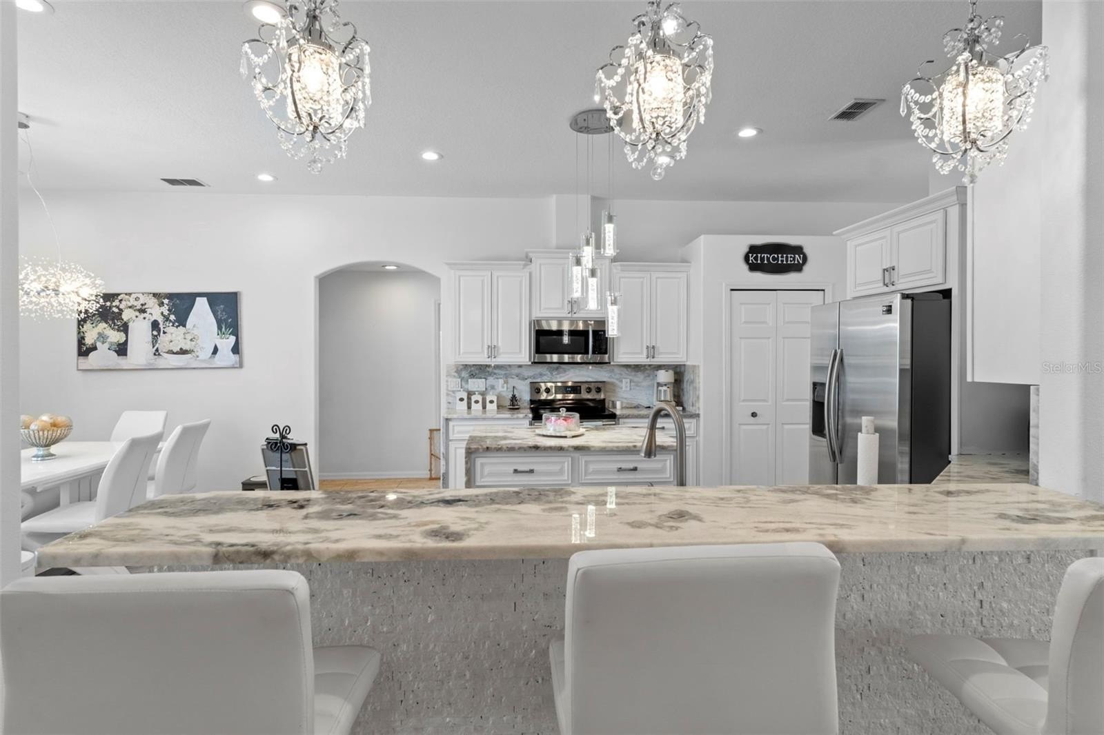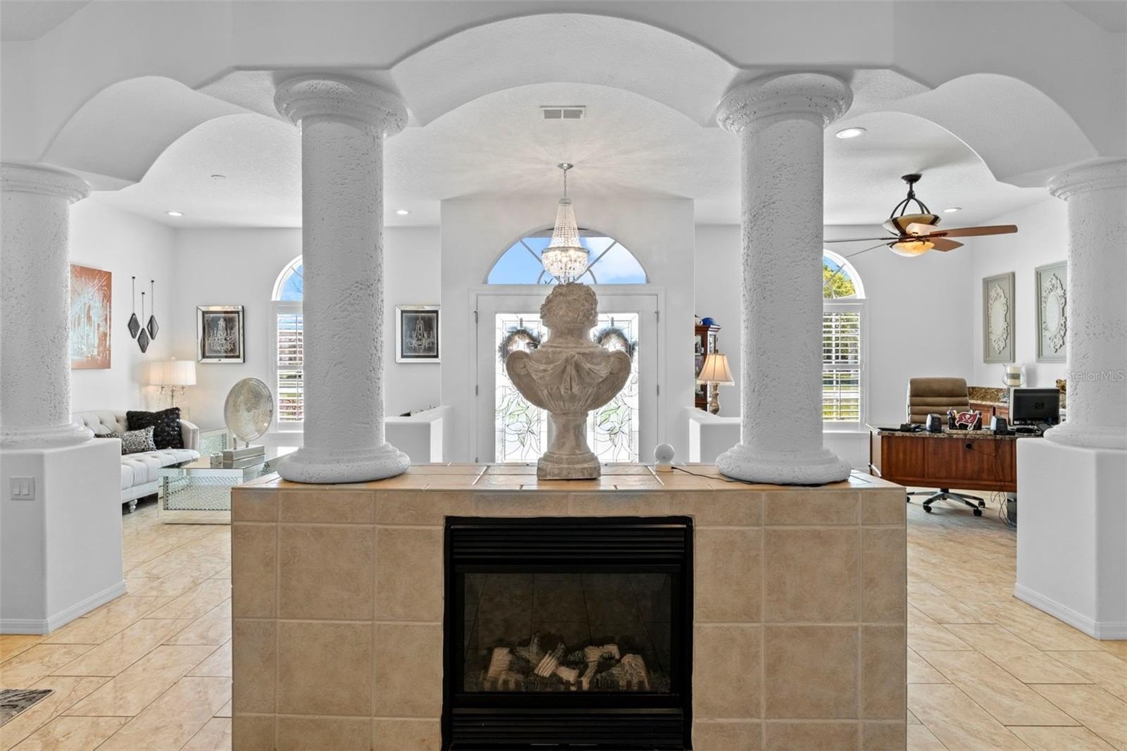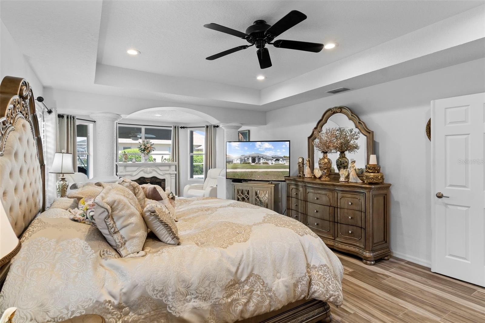 Homes of this caliber--offering privacy, space, and resort-style amenities--are rare to market. Welcome to this exceptional 4-bedroom, 3-bath, 3-car garage estate in the gated community of Pristine Place, perfectly positioned on a premium corner lot with tranquil views of a private retention area. From the moment you arrive, the home sets the tone with double glass entry doors, a grand tiled foyer, decorative columns, and elevated architectural details throughout--including plantation shutters, custom niches, rounded corners, and designer lighting. Thoughtfully designed for elevated living and effortless entertaining, the layout offers a formal dining space, a versatile den or office, and an expansive family room with tray ceilings and triple sliding glass doors that open seamlessly to the outdoor retreat. The chef-inspired kitchen is both refined and functional, featuring dolomite countertops, stainless steel appliances, custom cabinetry, stone accents, and an oversized breakfast bar, complemented by a sunlit breakfast nook overlooking the pool and natural backdrop. The owner's suite is a true sanctuary, complete with a private sitting area, dual closets, and a spa-style bathroom showcasing a garden tub, triple-head walk-in shower, and soaring cathedral ceilings. Spacious guest bedrooms provide flexibility for multi-generational living, work-from-home setups, or additional lifestyle space. Step outside to your private resort-style oasis--a 30-ft heated saltwater pool, separate heated spa with waterfall feature, expansive pavered lanai, and a fully equipped outdoor bar and grill station. Multiple covered seating areas and a screened enclosure create the ultimate setting for year-round luxury living and unforgettable entertaining. Additional highlights include a 15-ft laundry room with abundant storage, epoxy-finished 3-car garage, and meticulous updates throughout, reflecting true pride of ownership. Schedule your private showing today and experience the lifestyle this exceptional home delivers.