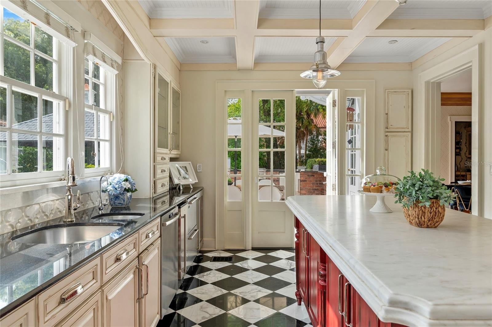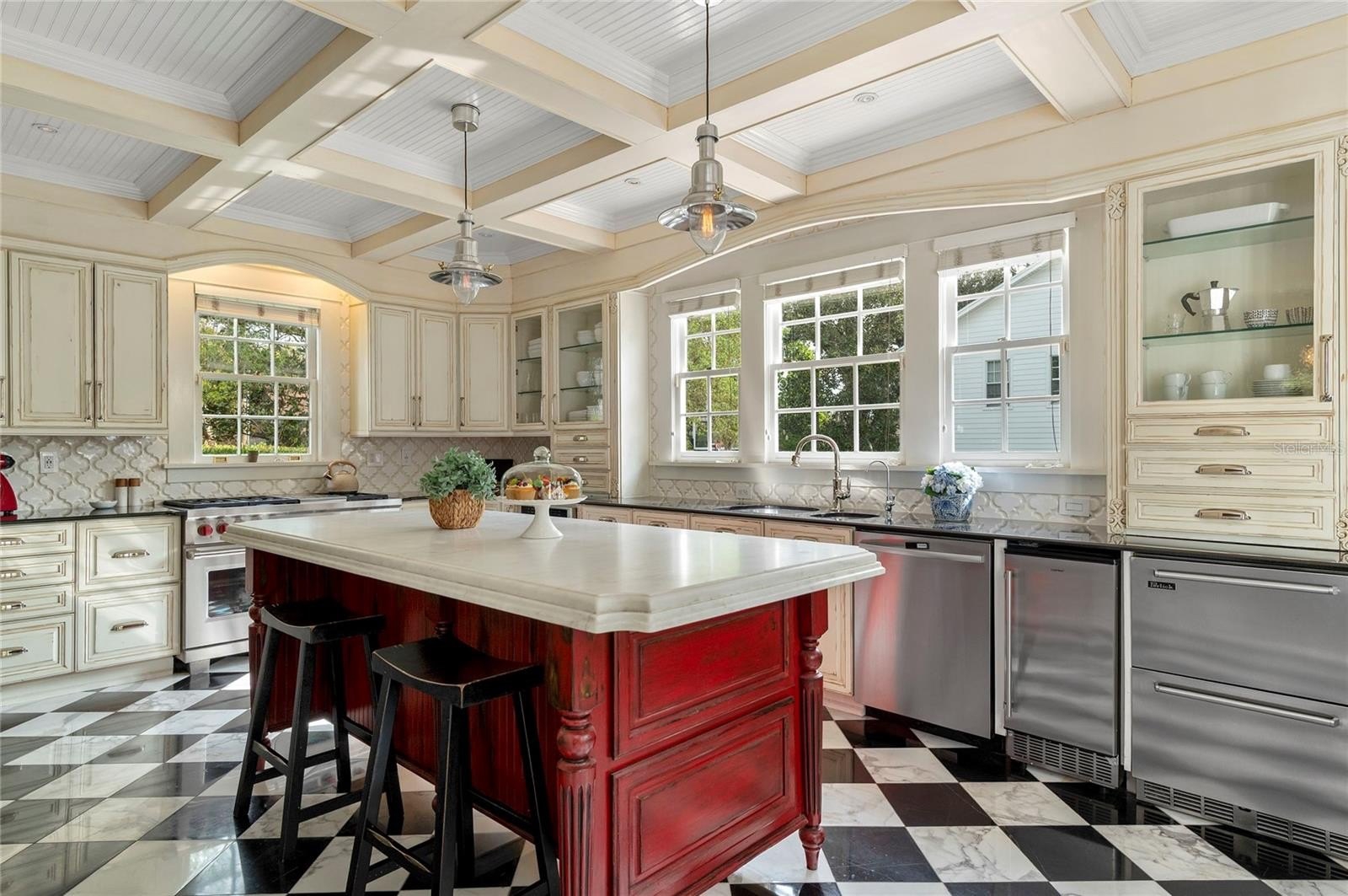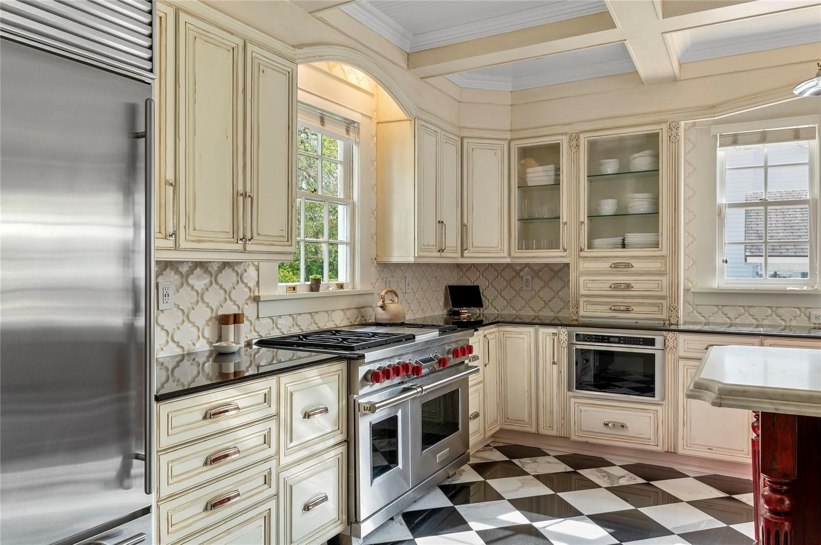 The chef’s kitchen is both functional and refined, featuring an oversized island, Wolf convection gas range, Sub-Zero refrigeration with additional drawer units, custom cabinetry, and purified drinking water. Overlooking the beautifully refinished pool and outdoor entertaining areas, the kitchen flows effortlessly into a well-appointed summer kitchen, perfect for hosting.