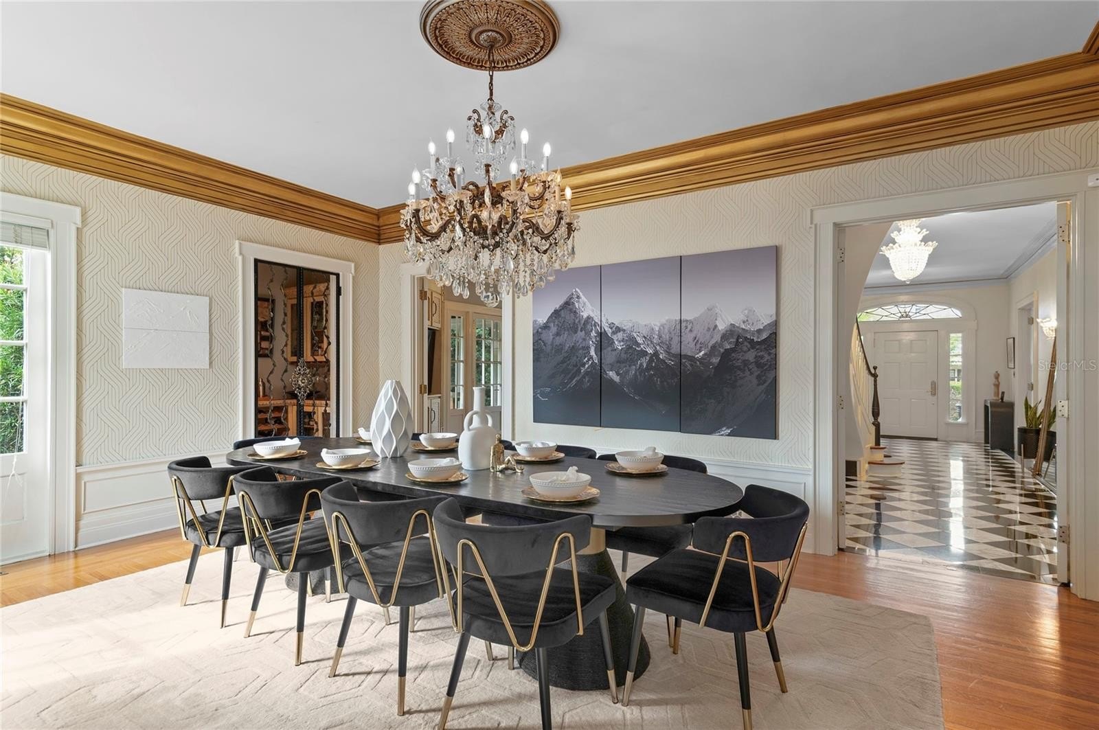 Set on an oversized lot (.56 acres), this stately three-story, 18-room residence offers an impressive blend of scale, craftsmanship and thoughtful updates. A dramatic oval, handcrafted three-story staircase creates a striking first impression in the grand black-and-white marble foyer, flanked by formal living and family rooms designed for both elegant entertaining and comfortable living. The living room extends into a light-filled sunroom, ideal as a private office or studio, while the family room opens to a screened porch with slate flooring, seamlessly connecting indoor and outdoor spaces.
