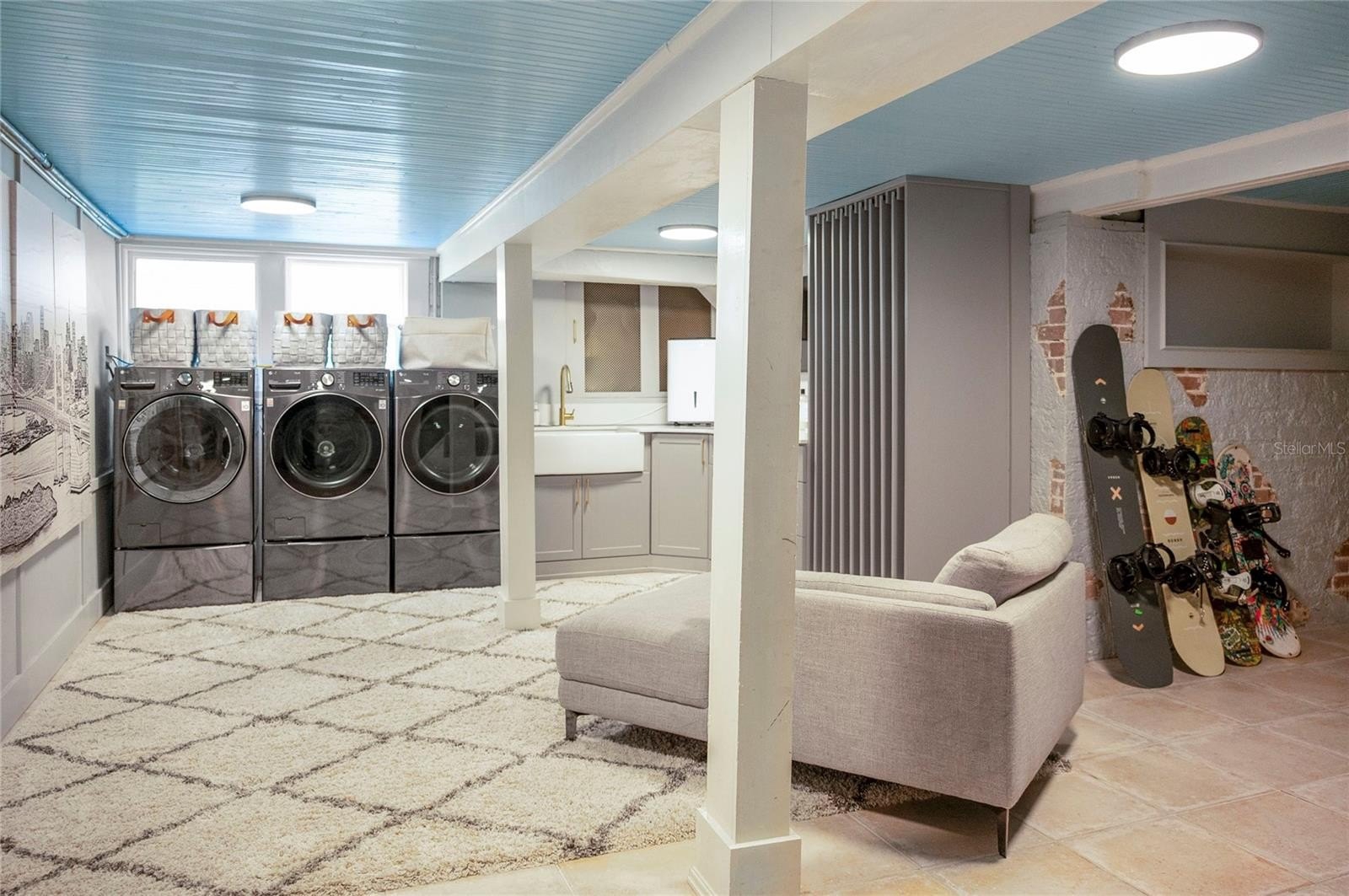 Interior details reflect exceptional character and craftsmanship, including wood flooring throughout most of the home, decorative ceiling elements, picture rails, brass antique light switches, and a wood-burning fireplace. The spacious primary suite features soaring ceilings and a large bath with an oversized shower and distinctive metal sinks. A secondary staircase and basement level-with updated laundry, dual washers, drying area, and laundry chute-add both charm and functionality.