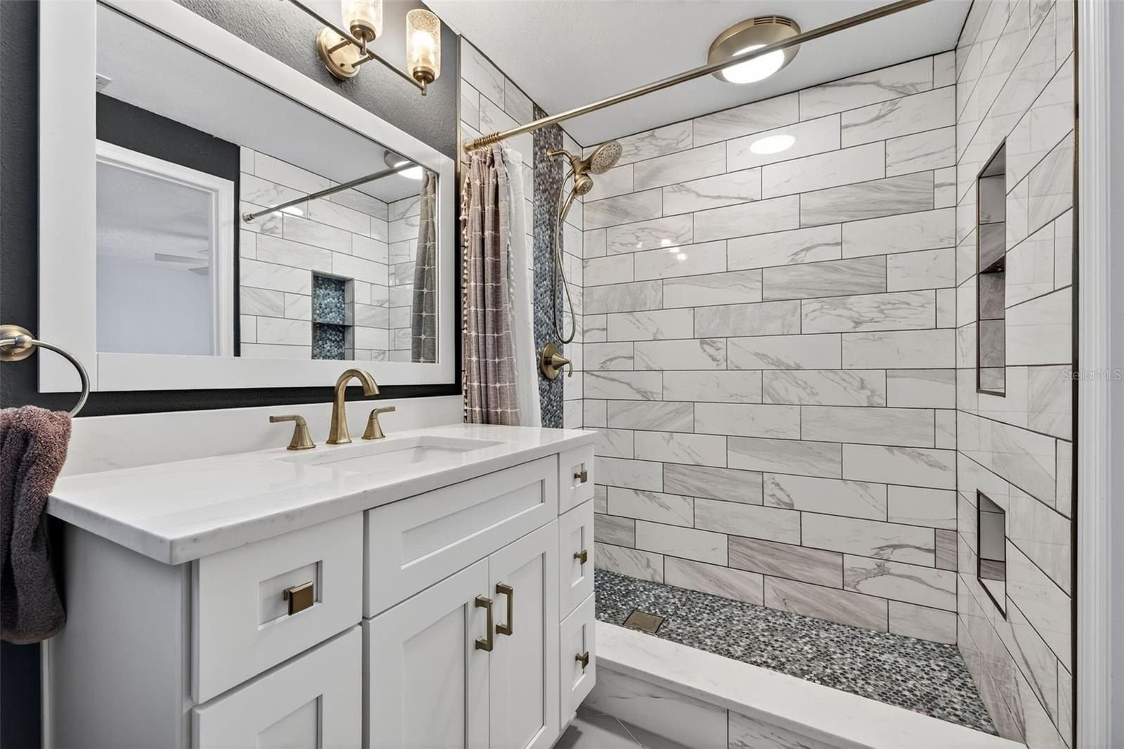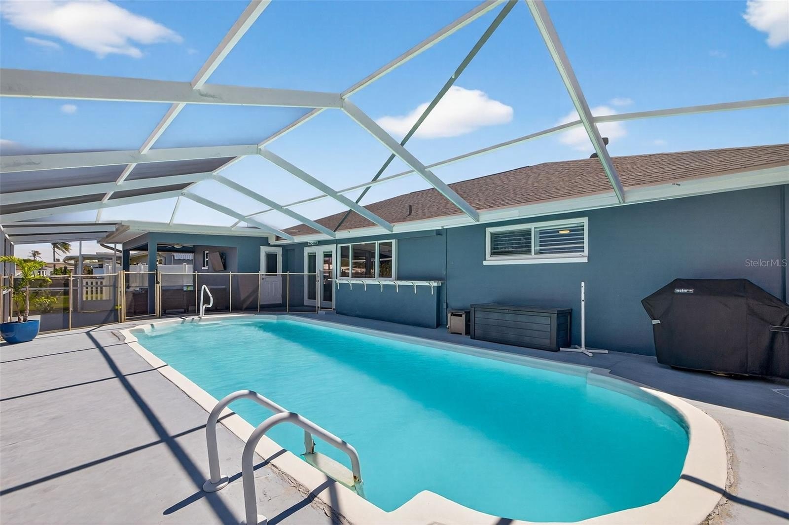 With almost 2000 square feet of interior living space this home offers both a formal living and family room, split floor plan with double primary suites, new flooring throughout, updated bathrooms, and hurricane impact windows. The heart of the home is the spacious chef's kitchen. The oversized island is perfect for easy conversations while preparing family meals. Complete with gas range, new appliances, luxury leather finish countertops, coffee bar and ample storage. Imagine hosting your friends and family for holidays with room for everyone to relax. The french doors open to a covered lanai with pool cage, crystal blue pool (resurfaced 2025) with safety fence, turfed side yard for low maintenance.