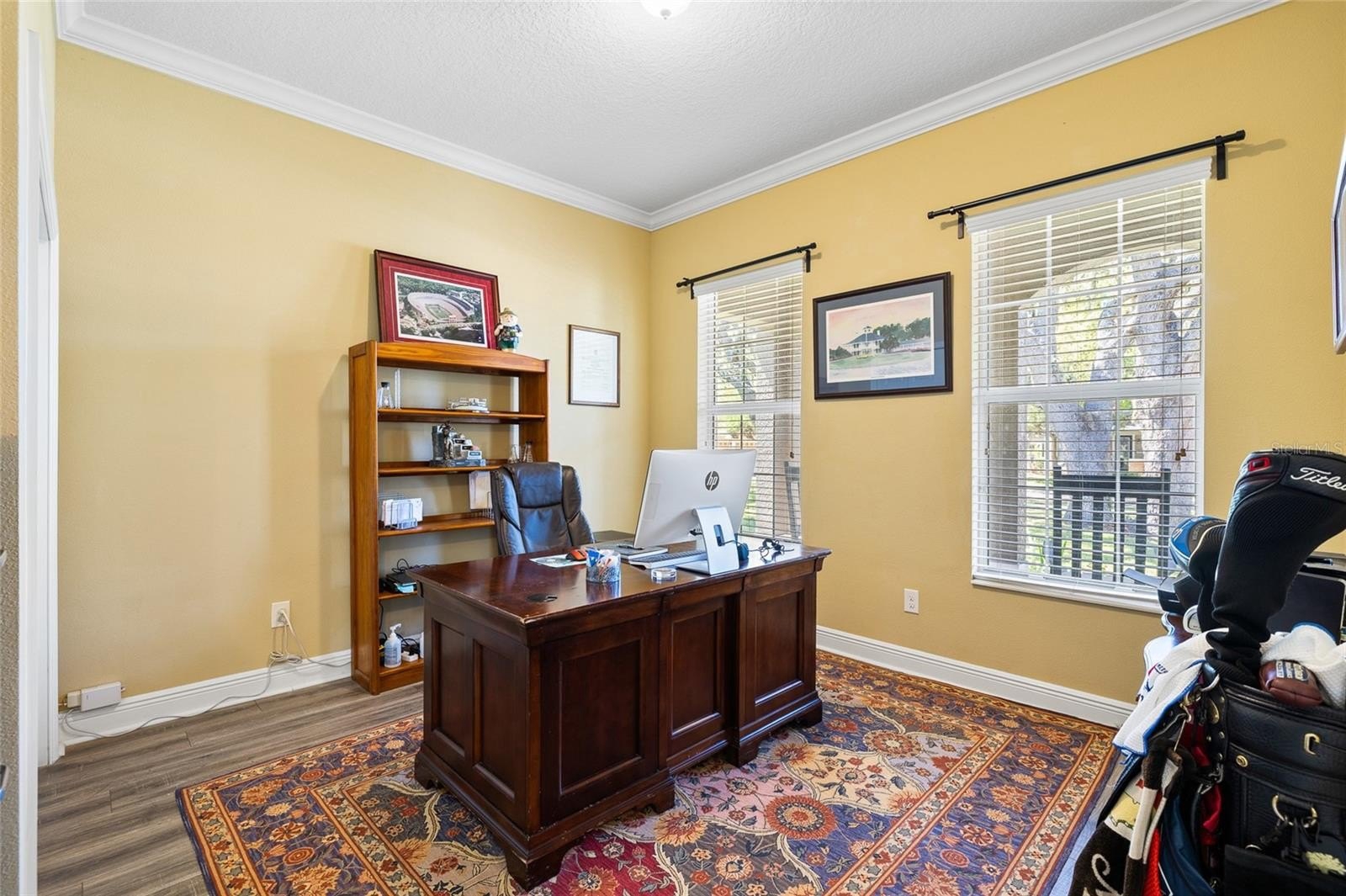 Inside, you are welcomed by 10-foot ceilings on the main level, elegant crown molding, and an open-concept layout designed for both everyday living and effortless entertaining. The entire first floor offers no carpet, providing both style and easy maintenance. At the front of the home, a private office offers the perfect space for working from home, studying, or creating a quiet retreat. The spacious main living areas flow seamlessly, making gatherings with family and friends feel natural and inviting. Additional upgrades include a central vacuum system for added convenience.