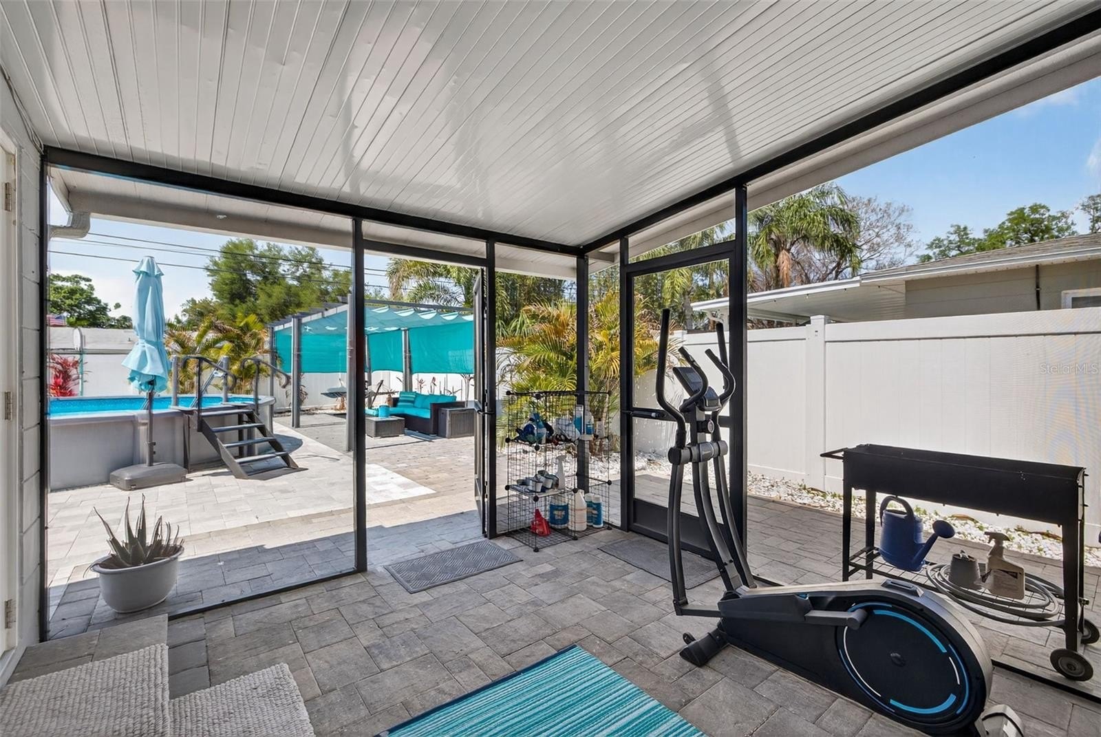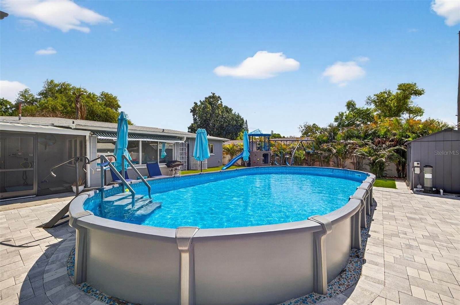 Welcome to your own private Florida oasis. This beautifully updated 2-bedroom, 1-bath solid block home with a Florida room offers the perfect blend of comfort, style, and peace of mind. Every inch of the home has been thoughtfully updated, and the backyard is truly a showstopper with a semi-inground, custom-built, 15'x30' saltwater pool, artificial turf, pavers, mature landscaping, a built-in weatherproof Lifetime swing set, outdoor solar shower, screened-in porch, and covered pergola. Designed for easy living, the rear of the home features mirror-tinted windows to help reduce energy costs and keep summer electric bills low. Inside, both bedrooms are generously sized enough for king beds, and the Florida room provides flexible space for an additional living area, office, or potential third bedroom. Major updates include the roof, A/C, and windows in 2022, and water heater in 2024. Additional highlights include epoxy garage floors, an Amazon smart thermostat with Alexa connectivity, whole-yard irrigation, and a 360-degree Ring camera alarm system. Ideally located near Downtown St. Pete and the Gulf beaches, this home truly has it all.