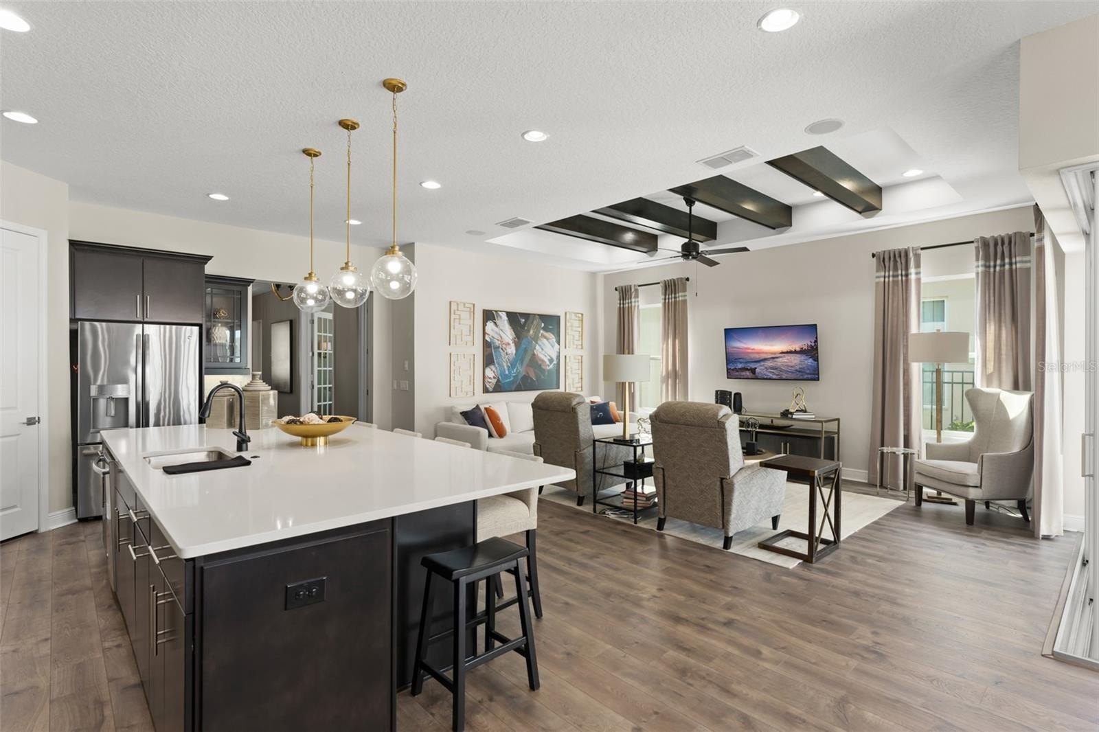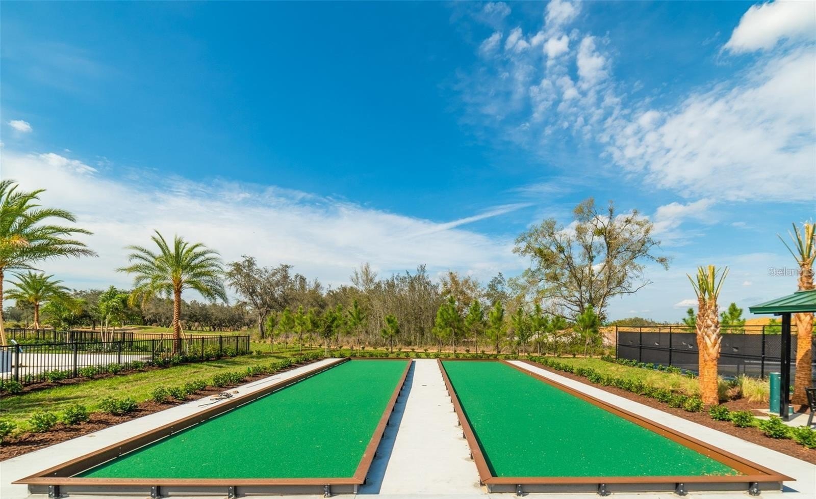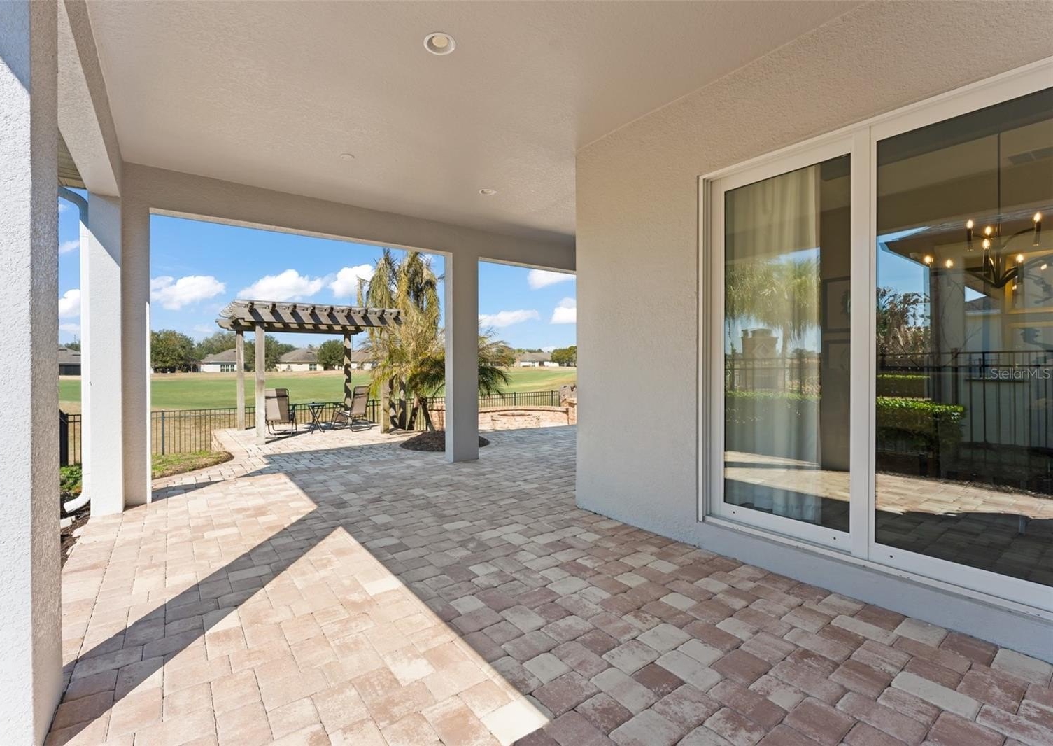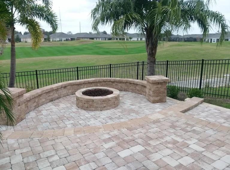Presenting the builder’s showcase home, featuring the very best of the Four Seasons at Orlando 55+ community. This former model is perched along hole #17 (par 3) of the Mystic Dunes Golf Course and stands supreme for its long list of upgrades and has been barely lived in. This Dominica model features 3 bedrooms (or 2 bedrooms plus den), custom-built wine bar, spectacular chef’s kitchen with giant island, gas cooktop, GE Profile oven and Advantium oven/microwave, glass tile backsplash, and custom cabinetry. The owner’s suite offers a sanctuary of its own with bright windows, porch entry door, tray ceiling, double vanities, and walk in glass-framed shower with multiple-headed jets. Collapsing sliding glass doors open to reveal a brick paver patio with gazebo, gas fire pit, fully fenced yard, and an unobstructed view of the golf course. Plumbing is already in place to create a summer kitchen of your dreams. This home is one of the few available homes featuring longer lasting and highly upgraded luxury tile roofing vs shingles. Plus, a three-car tandem parking garage, with a just-completed and beautiful concrete flooring coating. Four Seasons is a 55+ resort-style community offering 24-hour guarded gated access, a 13,000 square foot clubhouse, two in-ground pools, hot tub, and fitness center, plus tennis, pickleball, and bocce ball courts. Enjoy the carefree lifestyle as all exterior landscaping is included in the HOA fees. Located just minutes from Walt Disney World® and all of Central Florida’s famed attractions. (Note: Exterior & community aerial photos show damage from the recent hard freeze in the area; green and lush landscaping will return very soon!)