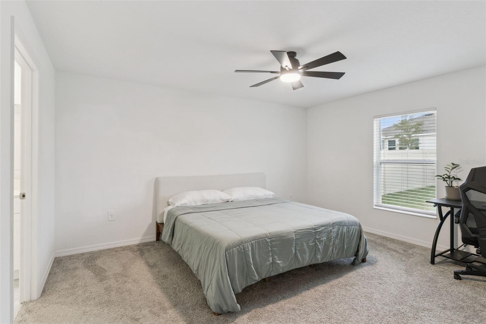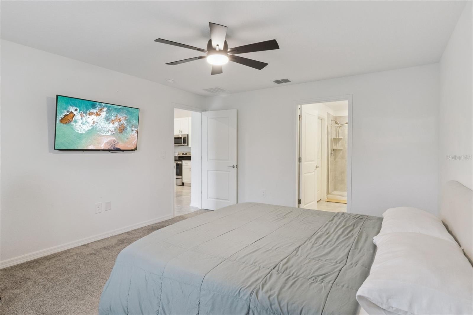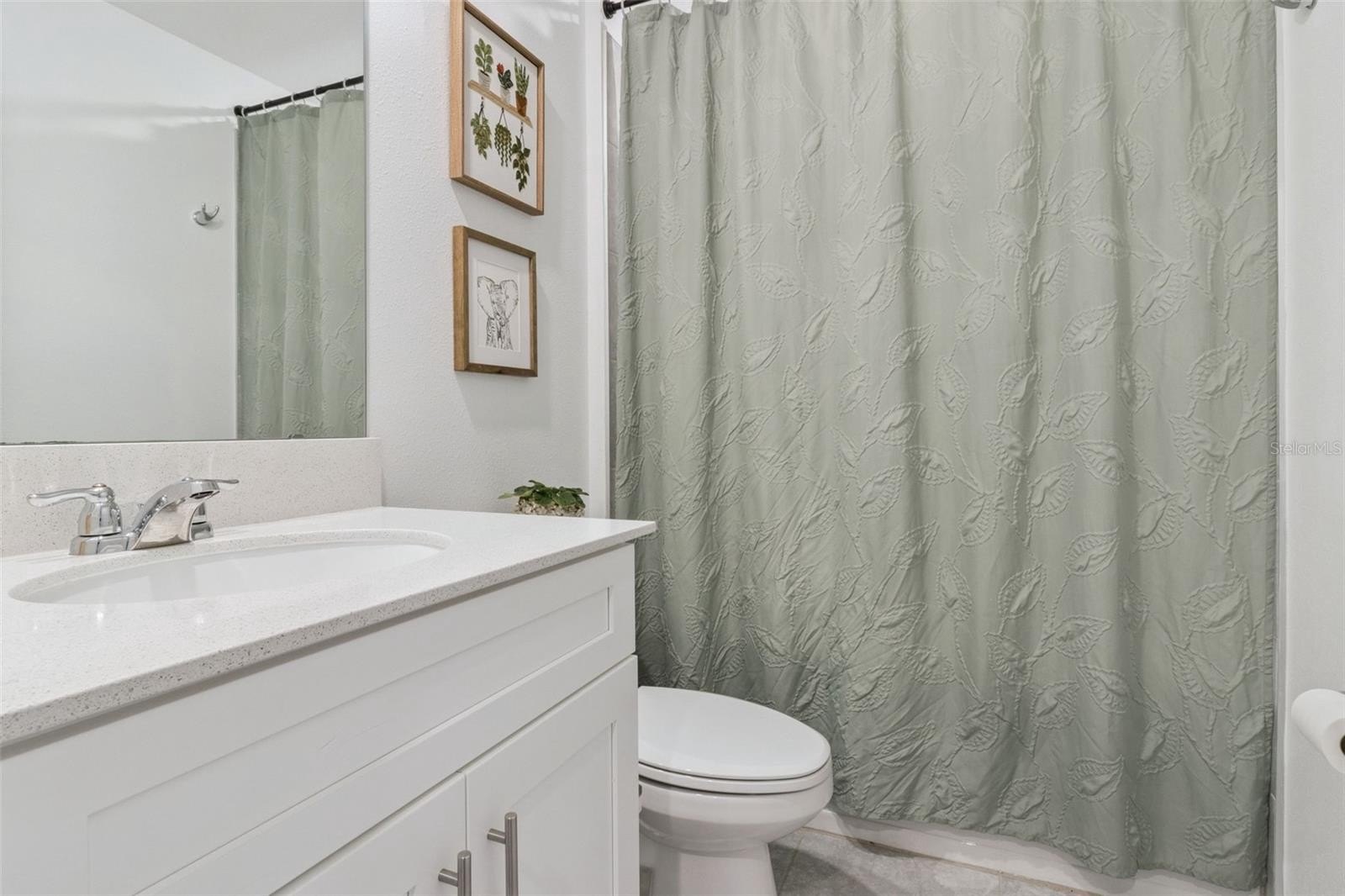 The split bedroom layout provides privacy, with the primary suite located toward the rear of the home and secondary bedrooms positioned near the front. The primary bedroom includes a private bathroom with updated finishes and generous closet space. Both bathrooms feature contemporary vanities and quartz countertops, giving the home a modern clean look buyers are searching for.