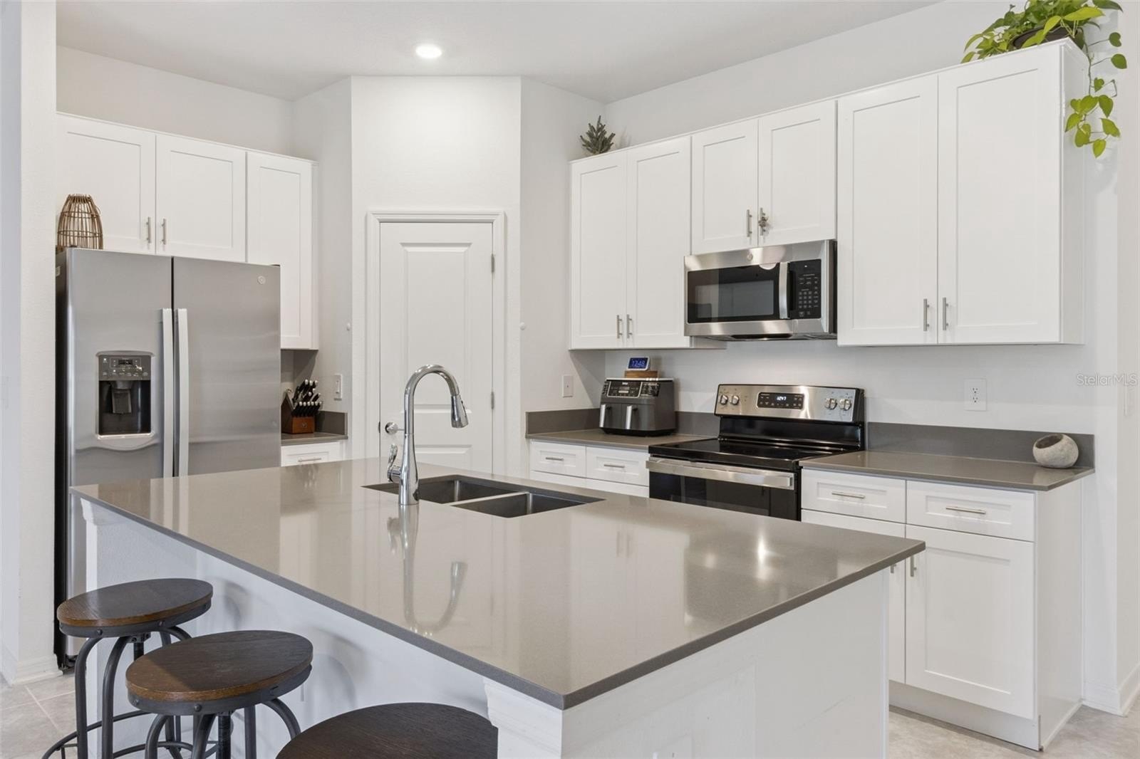 Located in the desirable Inman Grove solar community in Winter Haven, this 3 bedroom, 2 bathroom home with a fully fenced backyard offers the perfect combination of energy efficiency, modern design, and convenient Central Florida living. Built in 2023, NO CDD, LOW HOA of less than $50.00 a month, LOW ELECTRIC BILL MONTHLY..averaging $30-$83 a month ***=SAVINGS***, this newer construction home features solar power to help reduce monthly utility costs, making it an excellent option for buyers searching for energy-efficient homes in Polk County. ****Inside, the home offers a bright open floor plan with tile flooring throughout the main living areas and carpet in the bedrooms for added comfort. The kitchen overlooks the living and dining space and features quartz countertops, stainless steel appliances, modern cabinetry, and plenty of counter space, ideal for everyday living or entertaining guests. Natural light fills the main living area, creating a clean and inviting feel throughout the home.