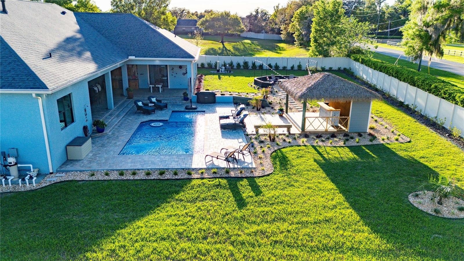 Built by a luxury builder with 40+ years of experience, this home showcases quality craftsmanship and thoughtful design throughout. Featuring a bright open layout with spacious living areas and custom upgrades throughout, including rustic wood beams, custom barn doors, and a live-edge wood indoor bar creating both comfort and elegance. The chef’s kitchen is a standout feature, equipped with a premium Viking gas stovetop and stainless steel appliances, plus a pantry coffee bar with filtered water system. Designed for privacy, the expansive primary suite is thoughtfully positioned on its own side of the home, offering a true retreat away from the additional bedrooms, while a flexible bonus space provides endless possibilities for a home office, craft room, or pet haven. Step outside and experience the ultimate outdoor entertainer’s paradise. The backyard features a stunning saltwater pool with a sun shelf and in water table and stools, along with a cozy fire pit area, tiki bar, multiple lounging areas, and a custom outdoor kitchen with a mini fridge, ice maker and sink area perfect for hosting gatherings or enjoying quiet evenings at home. Conveniently located just minutes from shopping, dining, and major roadways, this property offers the perfect balance of luxury, privacy, and accessibility.