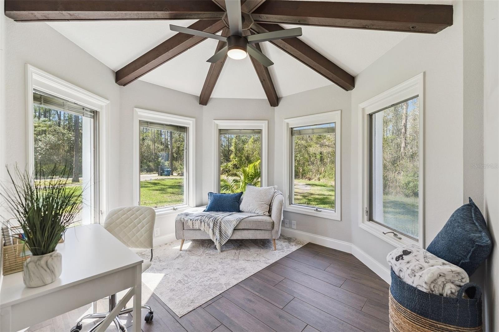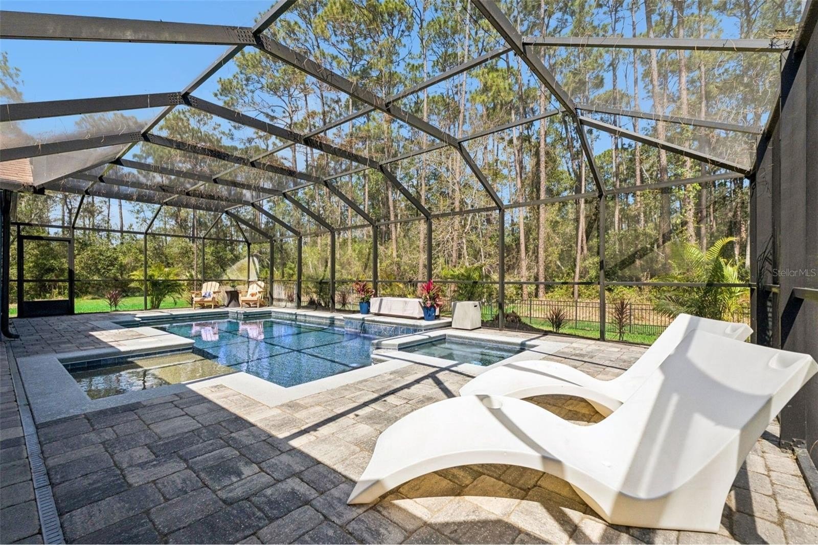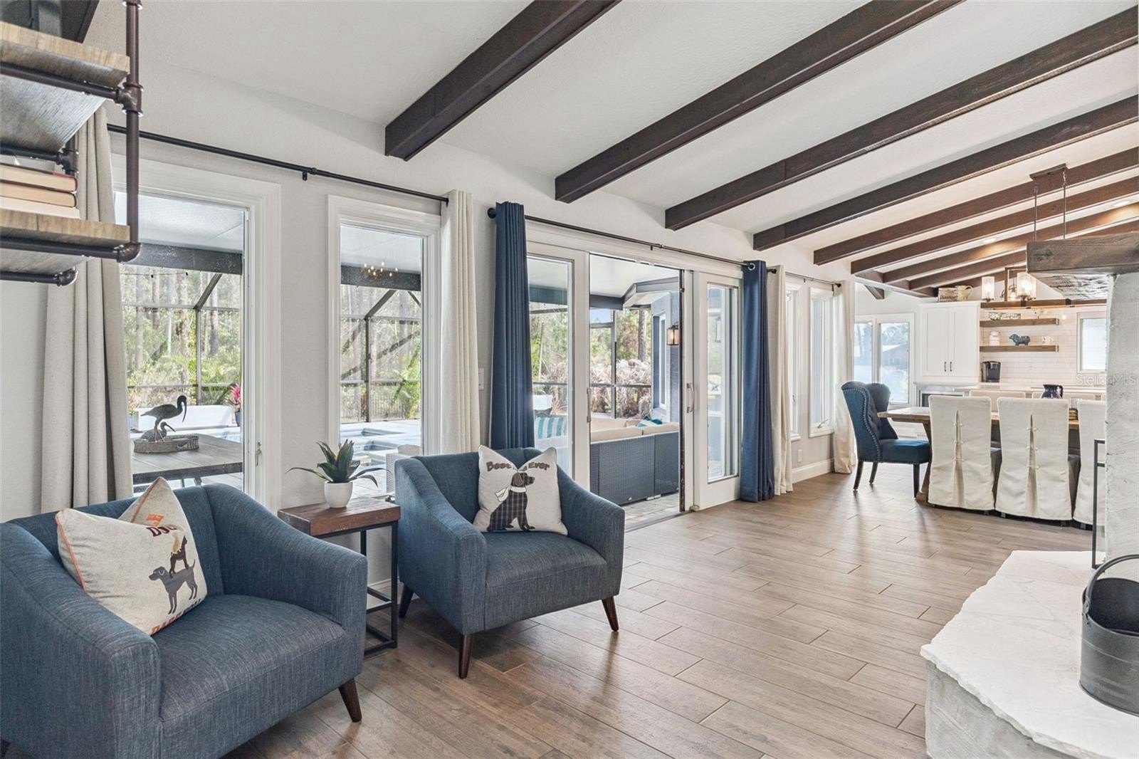 Tucked away on a peaceful dirt road, this fully renovated single-story retreat offers the best of both worlds—privacy and convenience—set on a sprawling 5-acre lot with no HOA. Originally custom-built with distinctive character and thoughtfully enhanced with recent updates that elevate both style and functionality, the home showcases 8” wood-look Shaw tile flooring, crisp white cabinetry, Calacatta quartz countertops, subway tile backsplash and shower surrounds, shiplap and barn door accents, custom lighting, and upgraded fixtures throughout—creating a seamless blend of charm and modern sophistication. Cathedral ceilings with attractive wood beams add warmth and architectural interest, enhancing the open and airy feel of the home. The open-concept kitchen, dining, and great room are designed for gathering, complete with a double-sided fireplace, an oversized island, and a coffee bar. Start your mornings in the charming dinette, sipping coffee while wildlife wanders by. This thoughtfully designed home includes two primary suites, a dedicated home office, spacious closets throughout, an oversized mudroom with a dog shower, and an extended-bay workshop garage. Step outside to your year-round oasis—cool off poolside in the summer or unwind in the heated spa on crisp winter nights. With 5 acres of land, there’s ample room for horses, farm animals, recreational toys, gardens, or simply space to breathe. Ideal as a primary residence, secondary home, or investment opportunity, this property also offers excellent potential with the option to subdivide the lot. All appliances, water softener, and whole-home generator convey, with furnishings available separately. Owner relocating—quick move-in available. Enjoy the perfect blend of peaceful country living while being just minutes from the beaches, dining, and shopping of New Smyrna Beach, with convenient access to the greater Central Florida area!