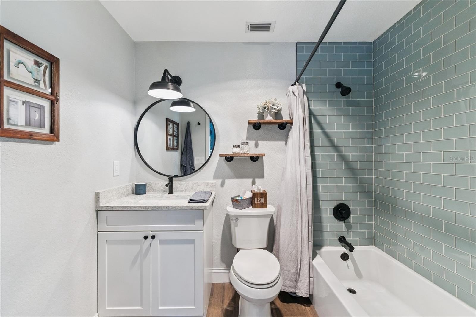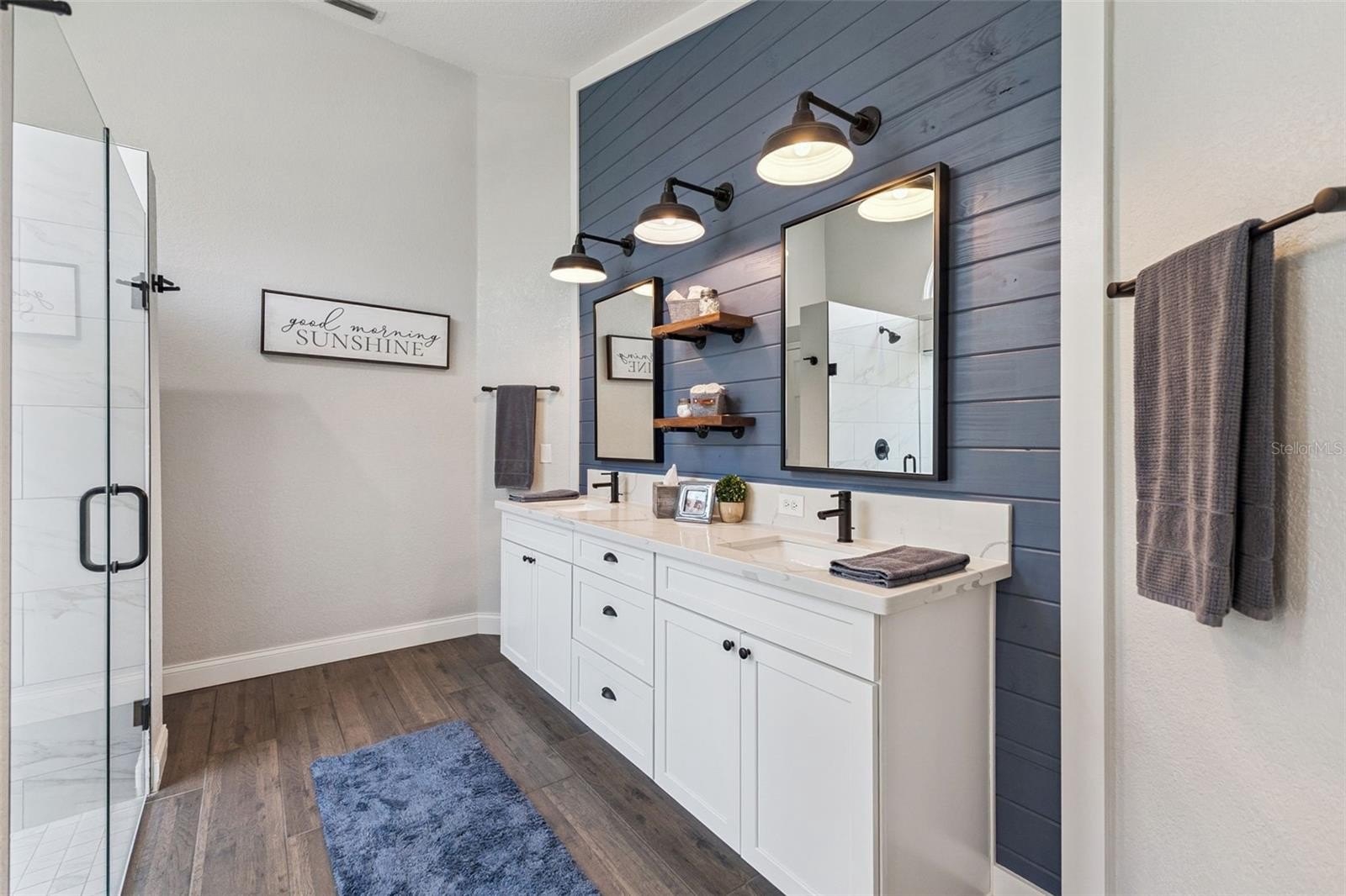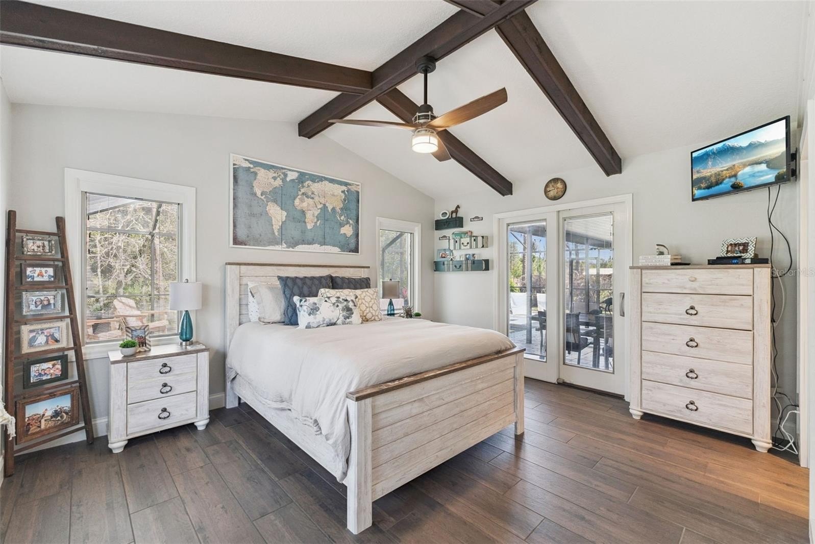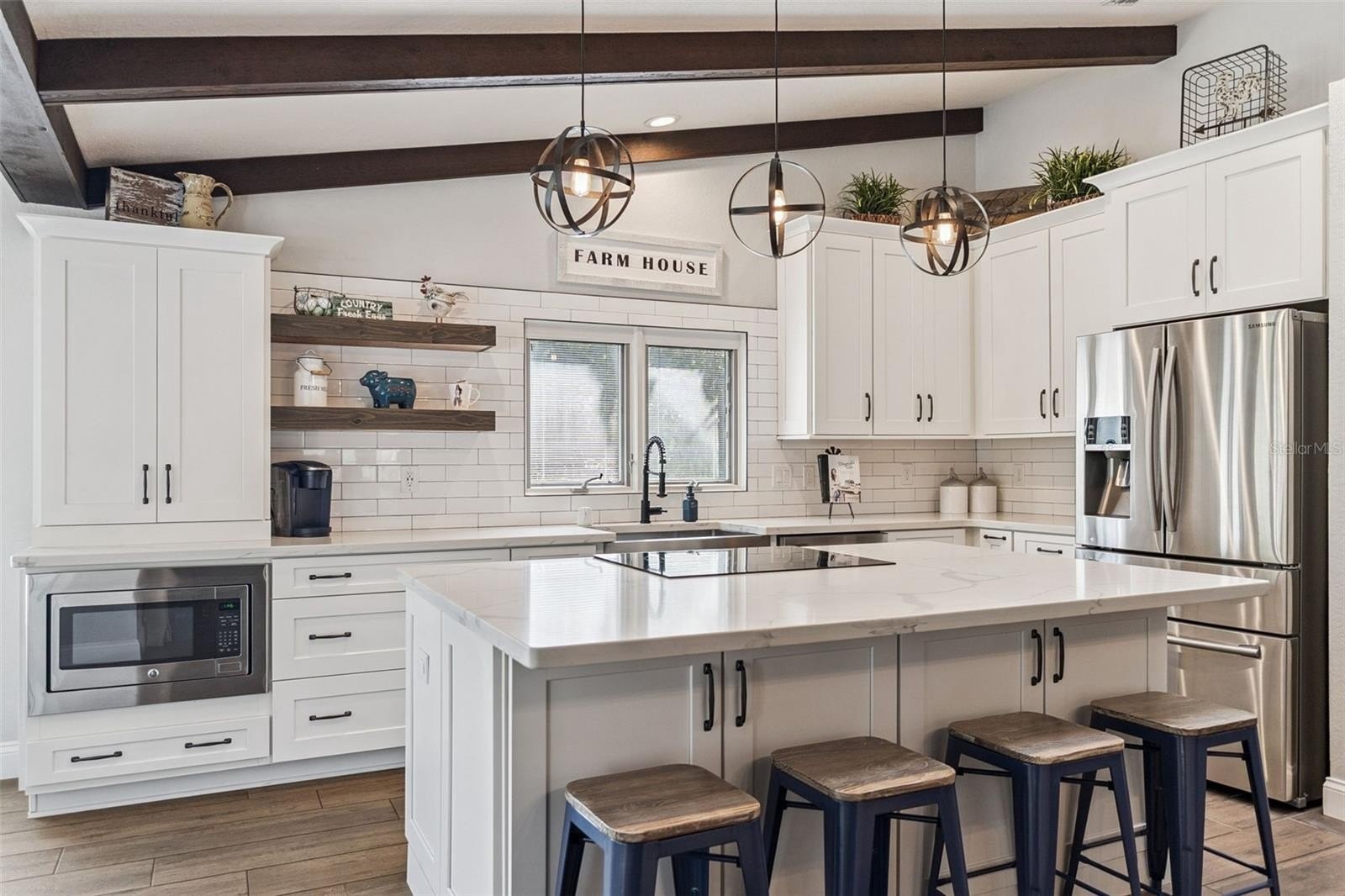 Tucked away on a peaceful dirt road, this fully renovated single-story retreat offers the best of both worlds—privacy and convenience—set on a sprawling 5-acre lot with no HOA. Originally custom-built with distinctive character and thoughtfully enhanced with recent updates that elevate both style and functionality, the home showcases 8” wood-look Shaw tile flooring, crisp white cabinetry, Calacatta quartz countertops, subway tile backsplash and shower surrounds, shiplap and barn door accents, custom lighting, and upgraded fixtures throughout—creating a seamless blend of charm and modern sophistication. Cathedral ceilings with attractive wood beams add warmth and architectural interest, enhancing the open and airy feel of the home. The open-concept kitchen, dining, and great room are designed for gathering, complete with a double-sided fireplace, an oversized island, and a coffee bar. Start your mornings in the charming dinette, sipping coffee while wildlife wanders by. This thoughtfully designed home includes two primary suites, a dedicated home office, spacious closets throughout, an oversized mudroom with a dog shower, and an extended-bay workshop garage. Step outside to your year-round oasis—cool off poolside in the summer or unwind in the heated spa on crisp winter nights. With 5 acres of land, there’s ample room for horses, farm animals, recreational toys, gardens, or simply space to breathe. Ideal as a primary residence, secondary home, or investment opportunity, this property also offers excellent potential with the option to subdivide the lot. All appliances, water softener, and whole-home generator convey, with furnishings available separately. Owner relocating—quick move-in available. Enjoy the perfect blend of peaceful country living while being just minutes from the beaches, dining, and shopping of New Smyrna Beach, with convenient access to the greater Central Florida area!