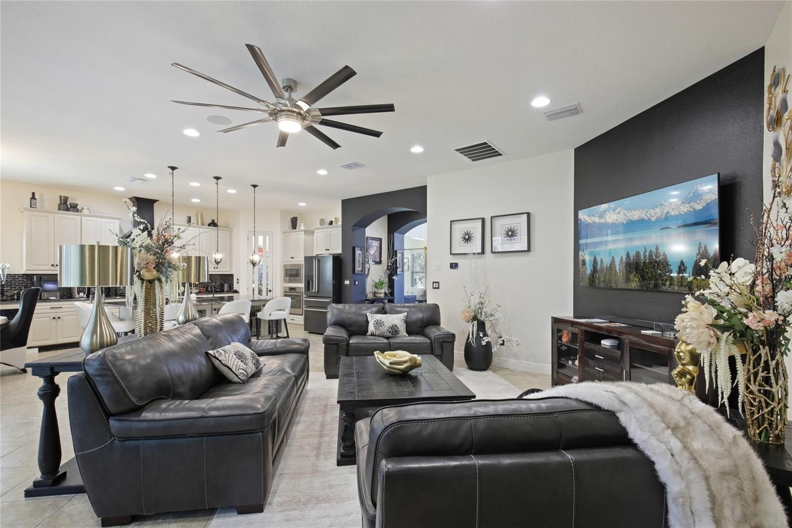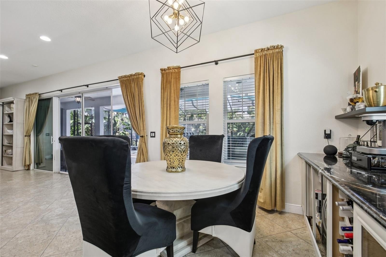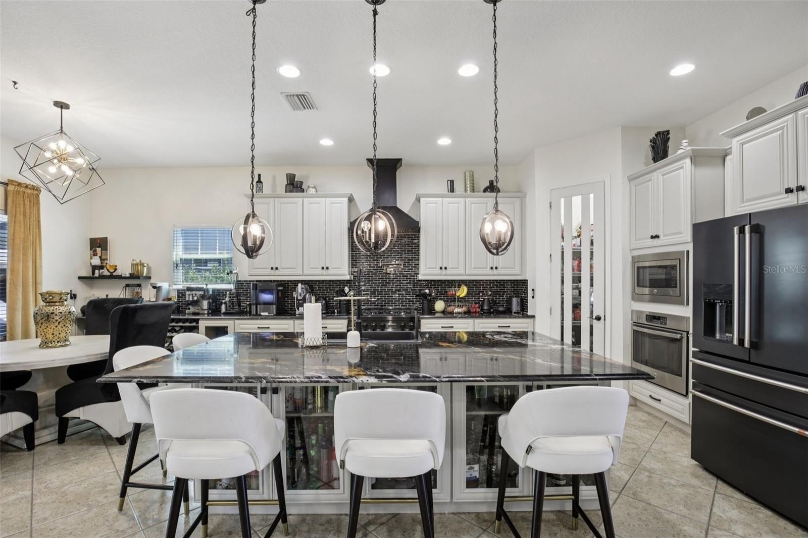 The main level boasts soaring 12-foot ceilings, while upstairs features 10-foot ceilings, giving the entire home an open and welcoming feel. The recently renovated kitchen is equipped with premium granite countertops, high-end appliances, and pot-filler, making it both stylish and ideal for cooking and entertaining. Thanks to four-panel sliding patio doors, the open floor plan blends indoor living areas seamlessly with a custom-landscaped backyard oasis. The first of five bedrooms is located on the main level—perfect for guests, in-laws, or use as a home office. Upstairs, the “west wing” offers a large bedroom and an adjoining bathroom. Two more accommodating bedrooms share a convenient jack - and - jill bathroom. The upstairs owner’s suite stands out with its newly updated walk-in luxury closet and a spacious bathroom featuring dual vanities, a stand-alone shower, and a soaking tub.