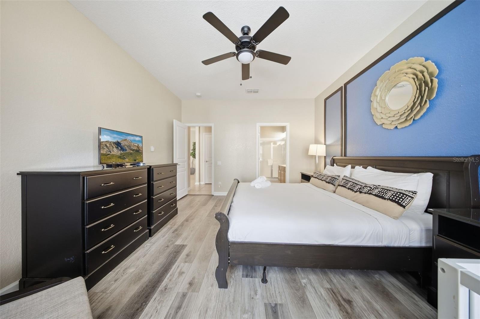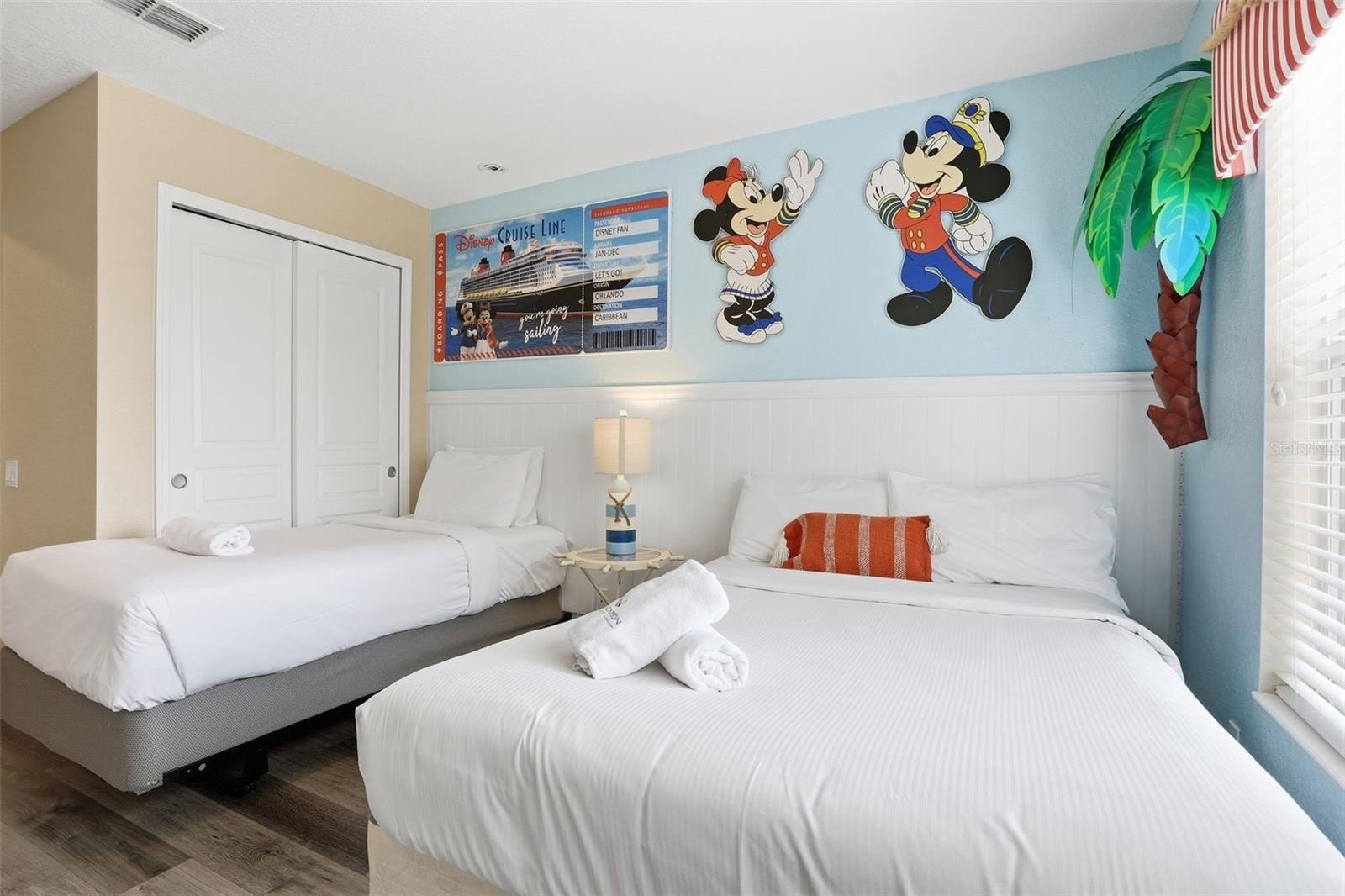 The first floor includes a primary suite with private ensuite bath, along with two additional guest bedrooms—each with their own bathroom. Upstairs you’ll find two themed bedrooms, both with private baths. Upgraded vinyl flooring (2022) enhances all bedrooms.