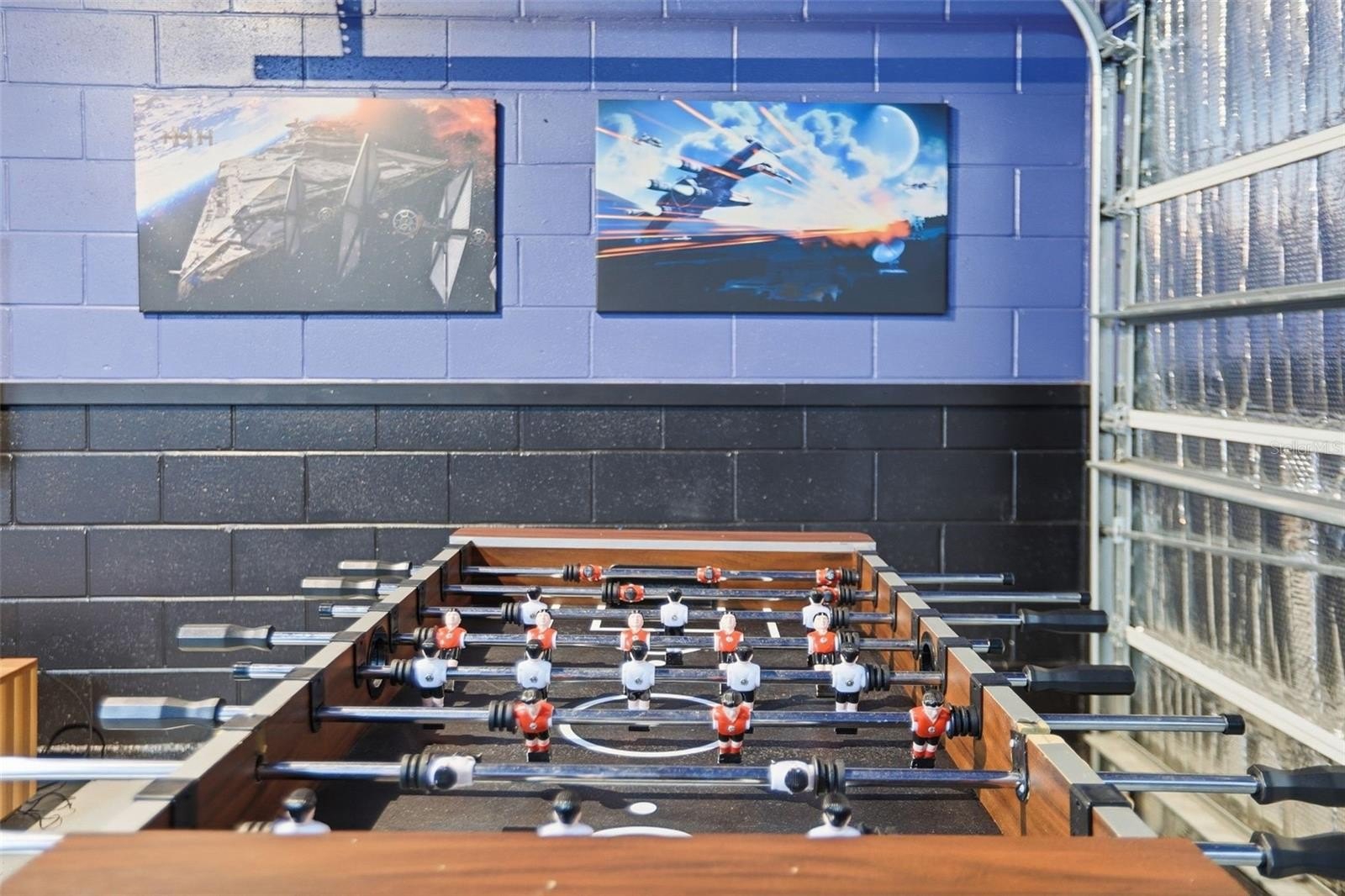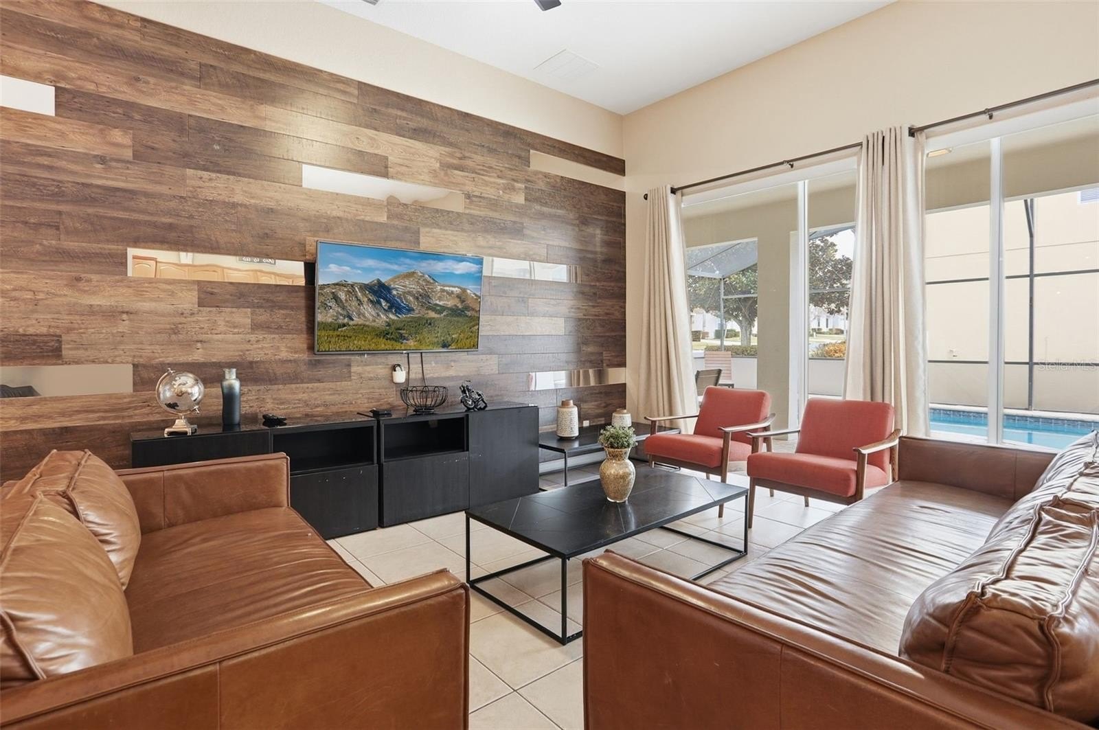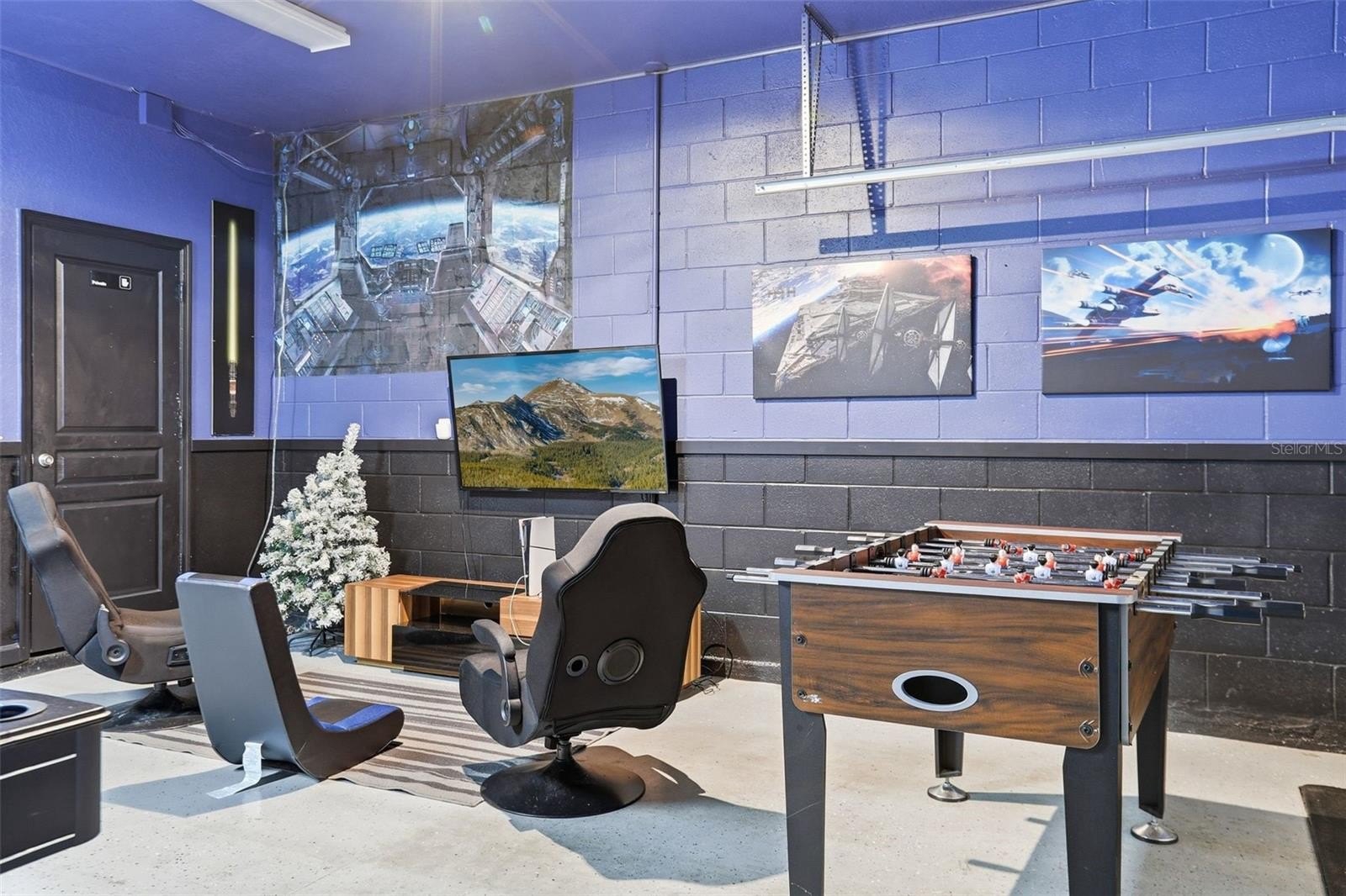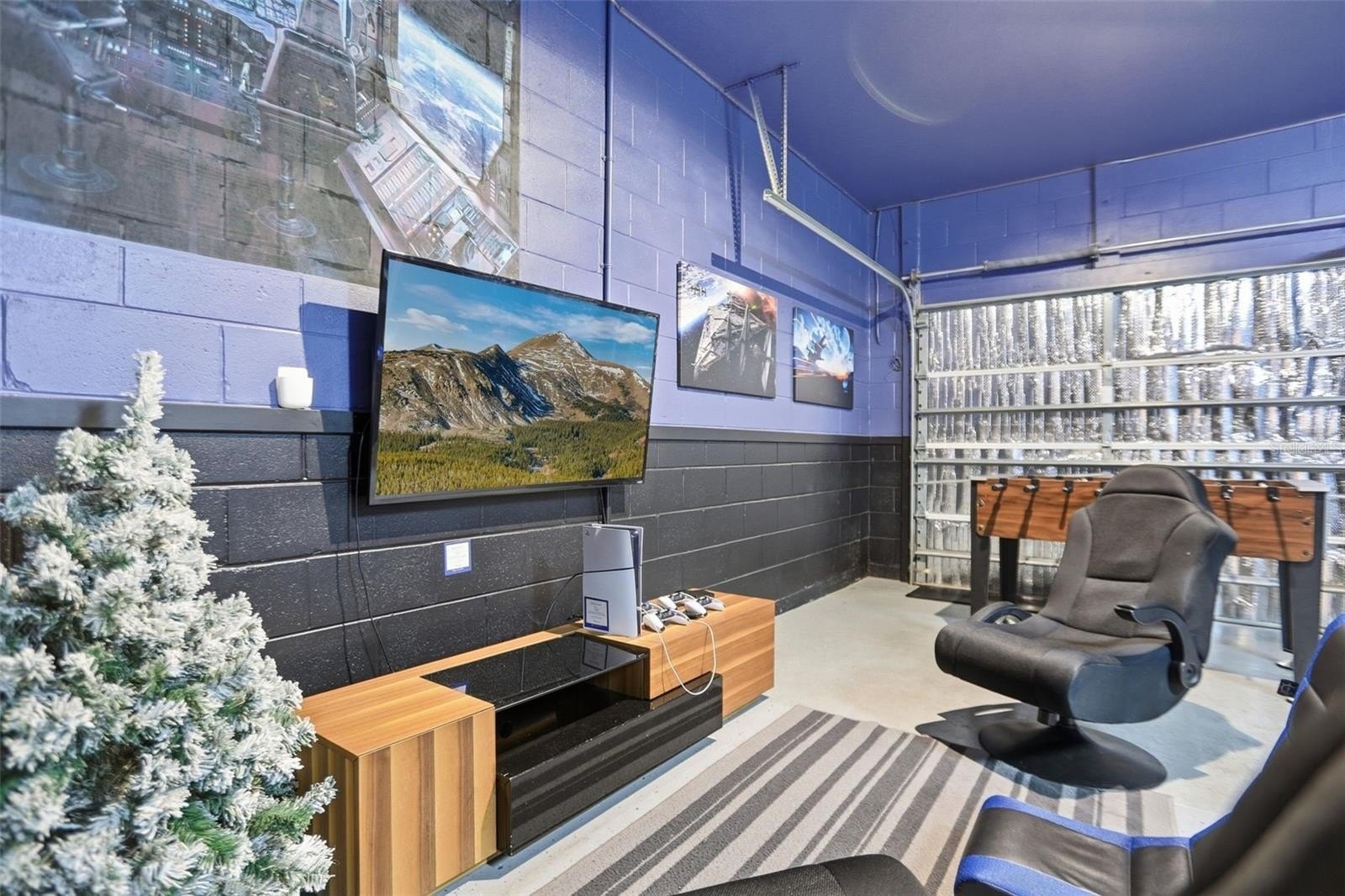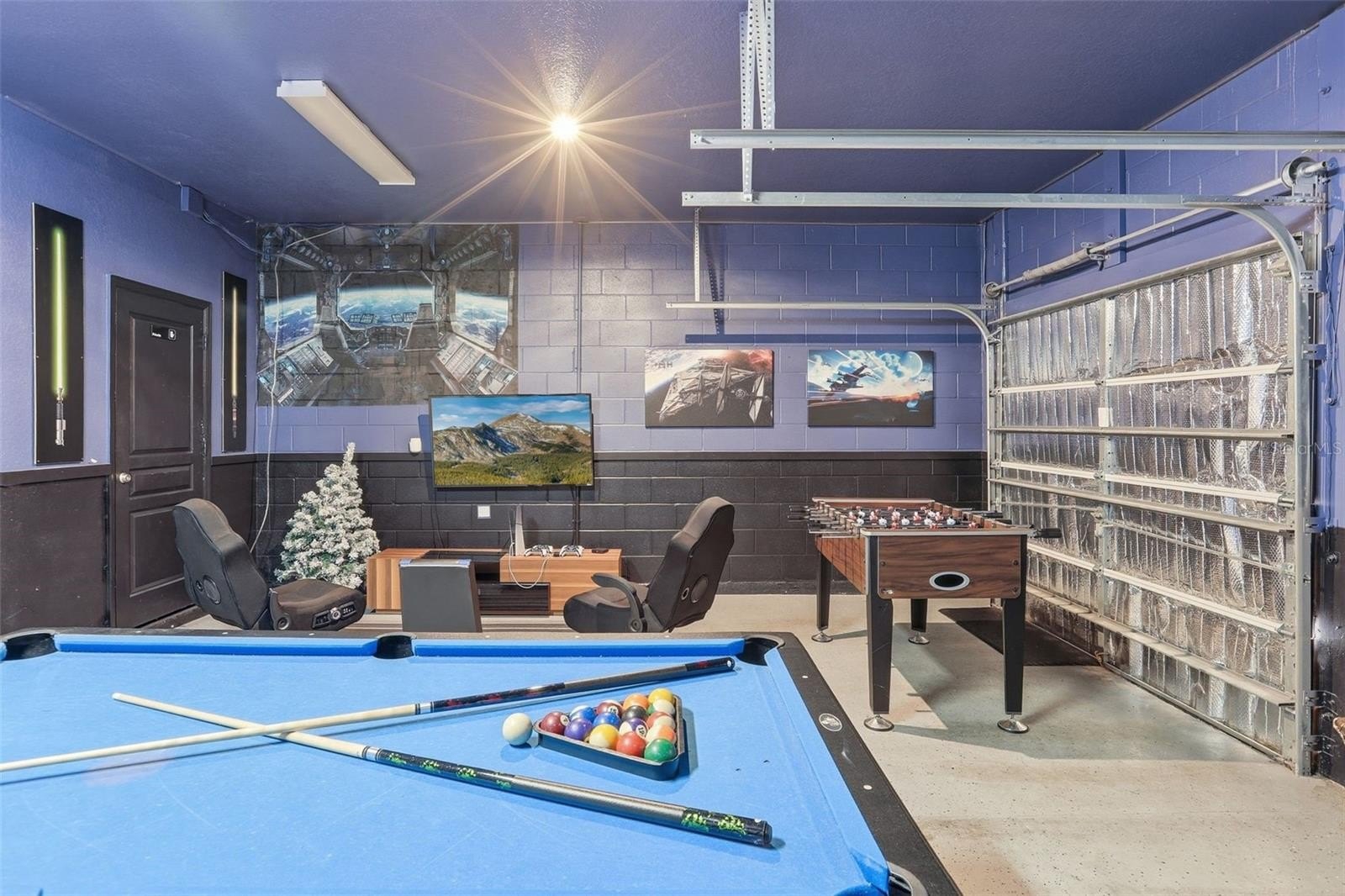 The open floor plan features a spacious central living area with multiple dining options including a formal 8-seat dining table, breakfast nook, and kitchen bar seating. The fully equipped kitchen overlooks the main living space, creating an ideal setup for entertaining. The converted garage has been transformed into a game room complete with a pool table and gaming area, perfect for those days lounging around.