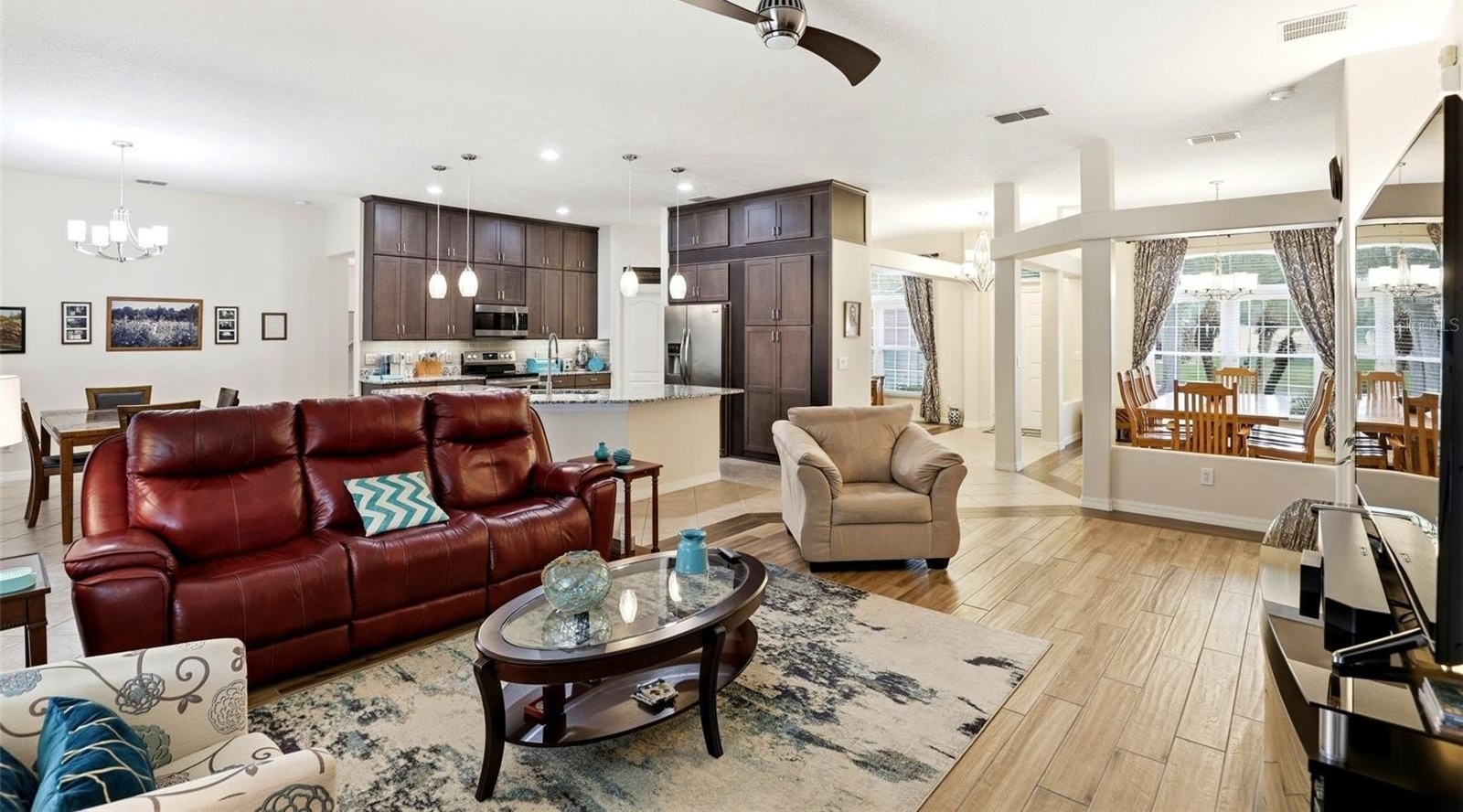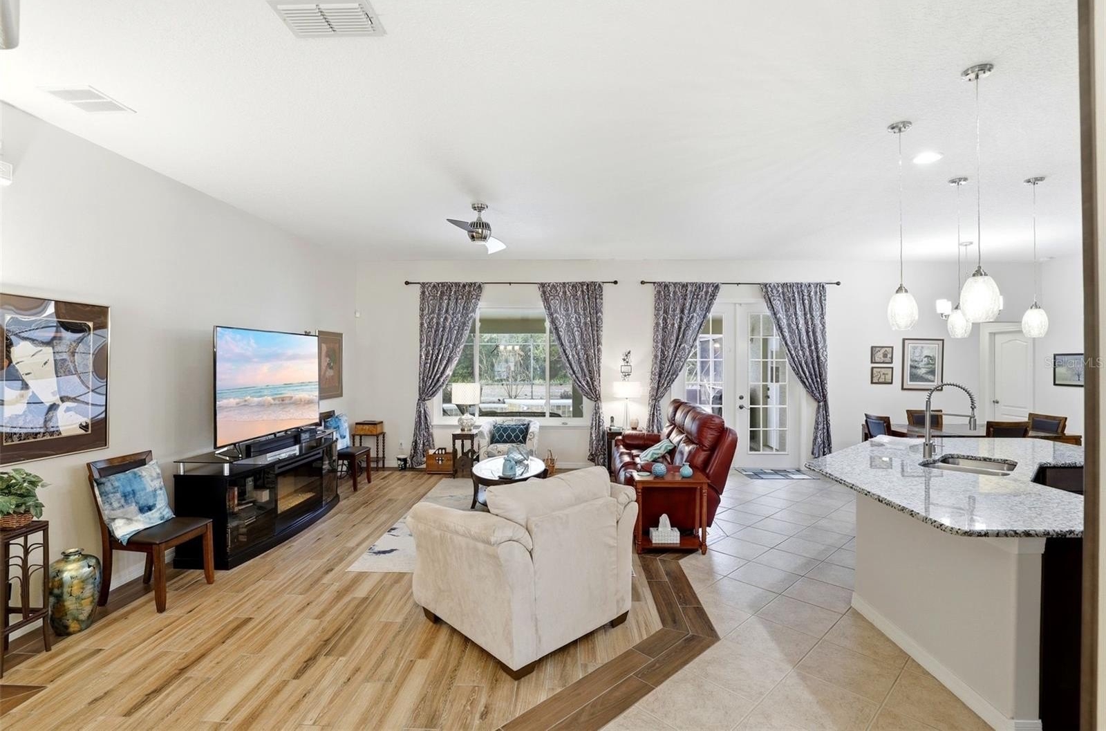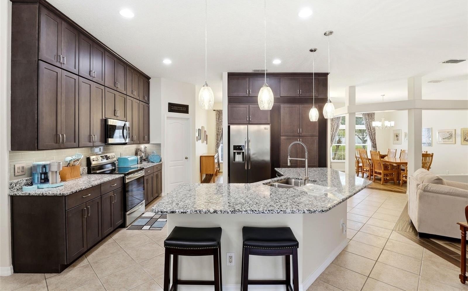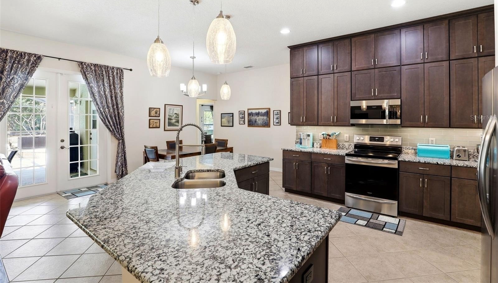 GATED COMMUNITY, PRIVATE POOL, CONSERVATION AND POND VIEW, NO REAR NEIGHBORS. This gorgeous pool home is located in the desirable gated community of East Lake Cove in beautiful St Cloud. You’ve found everything you desire in this 5 bedroom, 3 full bath home with over 2,700 square feet, a large lot with a covered lanai and a screened in private pool overlooking a pond and conservation area. This spacious home features a three way split floor plan with wood look tile flooring throughout the main living areas and one of the bedrooms, creating a warm and modern feel. Upon entering, you’ll find formal living and dining rooms that lead into a bright and inviting family room with beautiful windows overlooking the pool, allowing plenty of natural light to fill the space. The updated kitchen is perfect for entertaining and everyday living featuring 42 inch cabinets with an additional cabinet extension above, granite countertops, stainless steel appliances, and a breakfast area with views of the pool plus a large island with seating capability for bar stools and additional cabinet storage. The downstairs owner’s suite provides a relaxing retreat with tray ceilings, a sitting area, walk in closet, access to the pool and a beautifully renovated bathroom with dual sinks, upgraded lighting, gorgeous tile floor, tile showers to the ceiling and a spacious shower with a relaxing rain shower head. Upstairs, the fifth bedroom or bonus room features plenty of space for your ideas plus vaulted ceilings and a full bathroom, making it ideal for a guest room, home office, or private suite. Step outside through the rear French doors and enjoy Florida living at its best with a screened in pool and large covered lanai with two ceiling fans for your comfort, featuring a solar heated pool and a fully upgraded pool bathroom with a tile to ceiling shower, perfect for convenience after a swim. Additional features include driveway pavers, epoxy coated garage floor, a whole house water filtration system, inside laundry room, and many more. Residents of East Lake Cove enjoy gated security and wonderful amenities, including a tennis/basketball court, a playground, two ponds and a community walking dock with beautiful views of Lake Toho. Conveniently located just minutes from Lake Nona, Medical City, Orlando Airport, VA Hospital, Nemours Hospital, Amazon, shopping, restaurants, Walmart, Publix, and easy access to main highways such as 417 and 528. Home is also located near Narcoossee Elementary and Narcoossee Middle! Come see the rest!