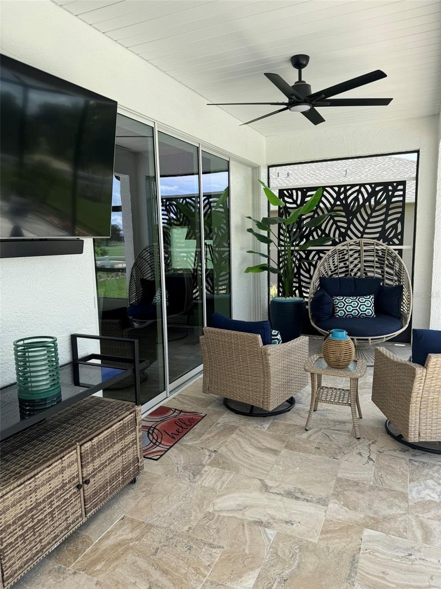 Your nearly 2,000 sq ft screened outdoor oasis is the crown jewel. Enjoy a 36 ft heated saltwater pool, tanning ledge, and waterfall spa—all LED lit for evening ambiance. Whether you’re hosting neighbors for sunset cocktails or enjoying quiet mornings with panoramic golf course views, this space delivers the ultimate in relaxation. 20 ft of sliding pocket doors create a seamless indoor outdoor flow, perfect for Florida living.