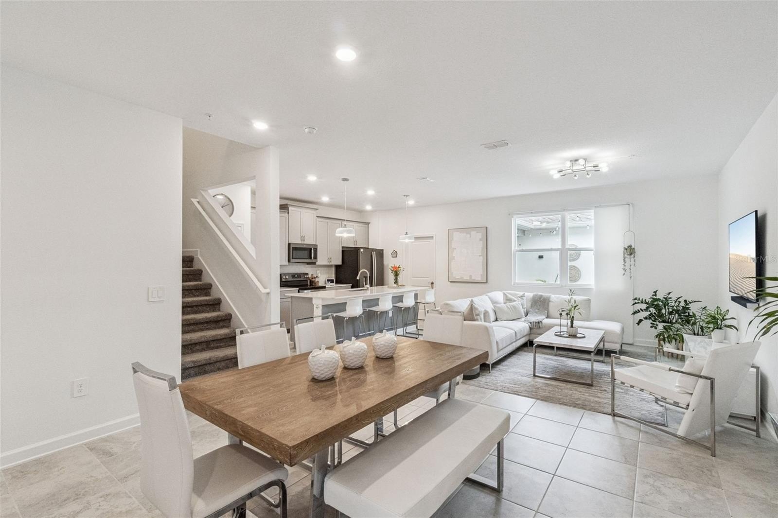As you enter, you’re welcomed by a bright and open living space where the kitchen, dining, and living areas flow seamlessly together, creating an inviting atmosphere.