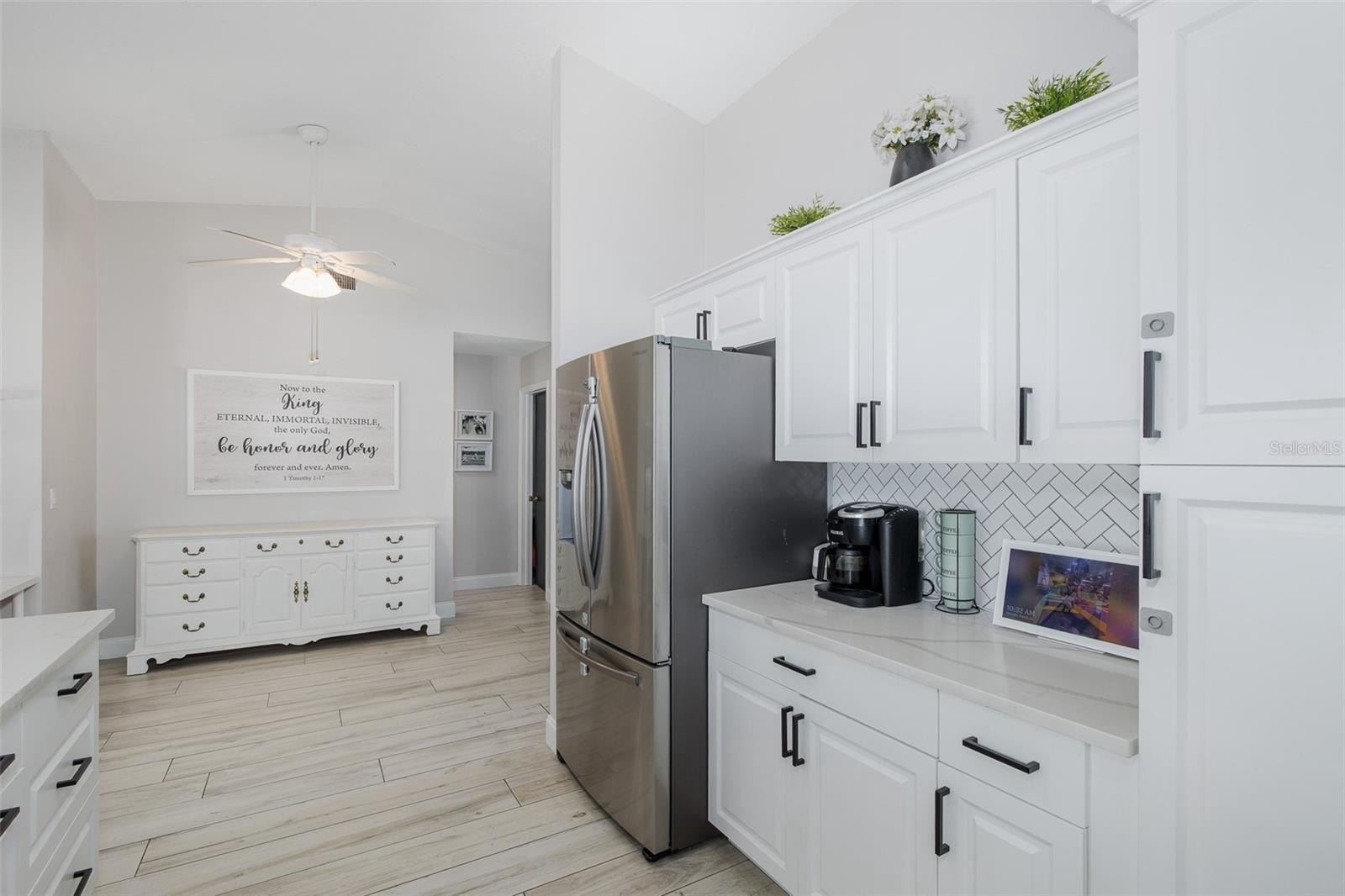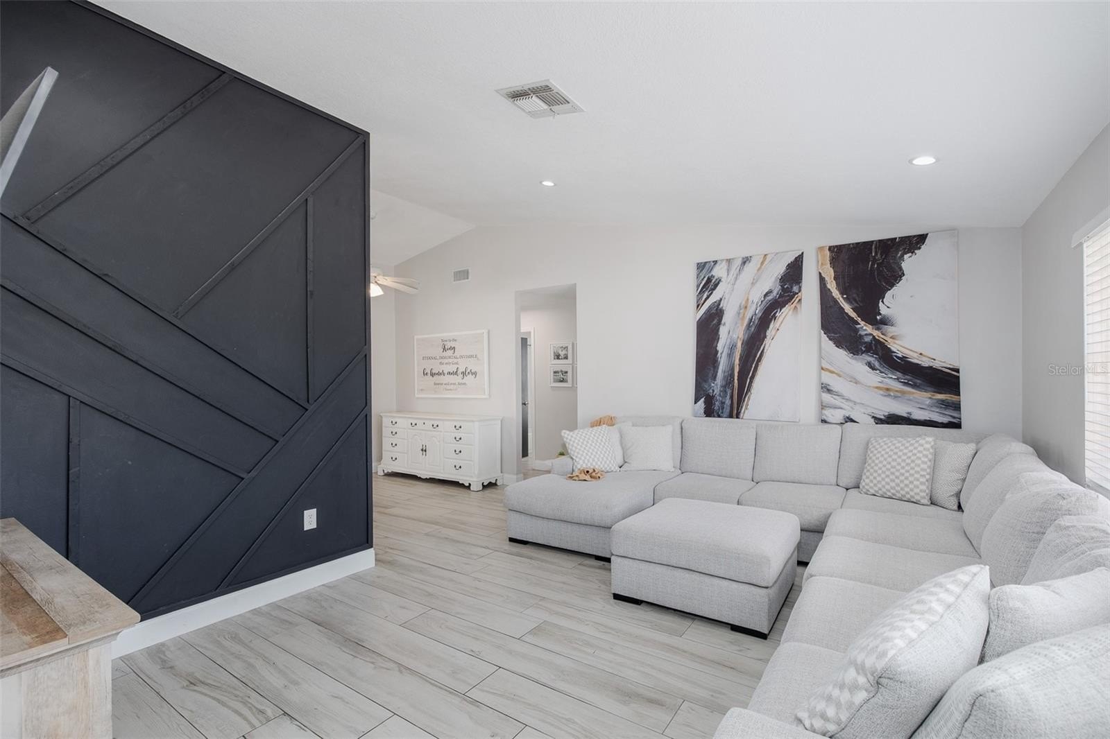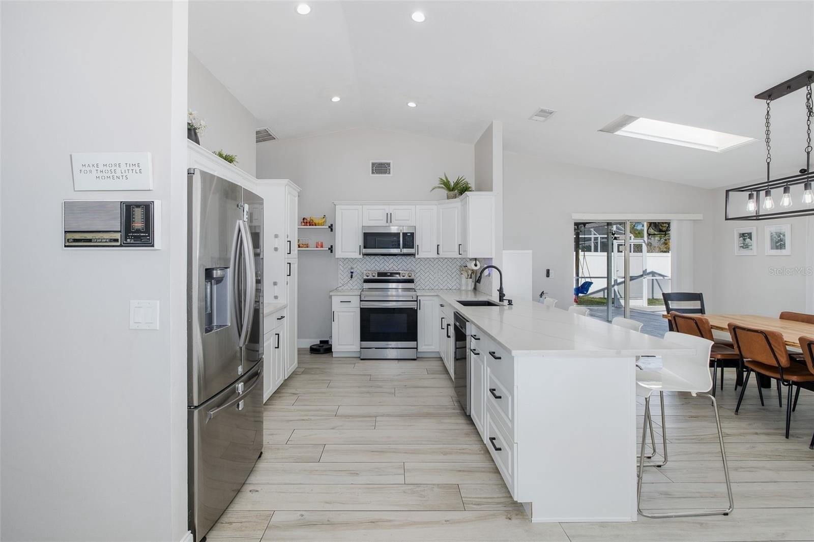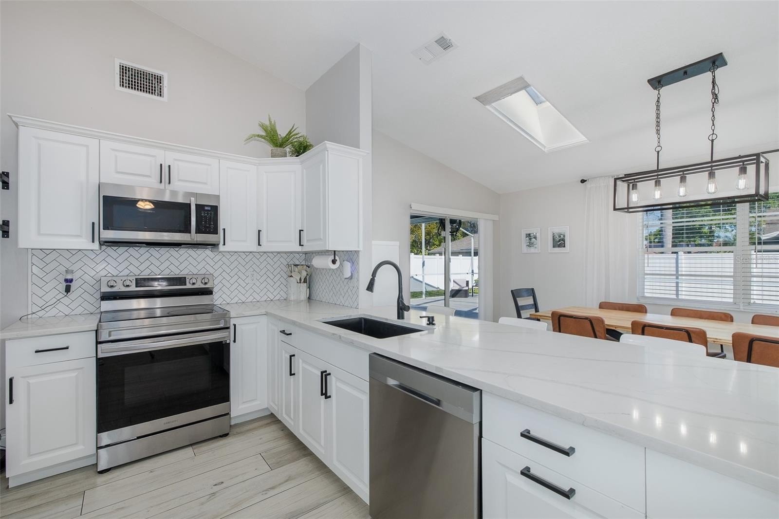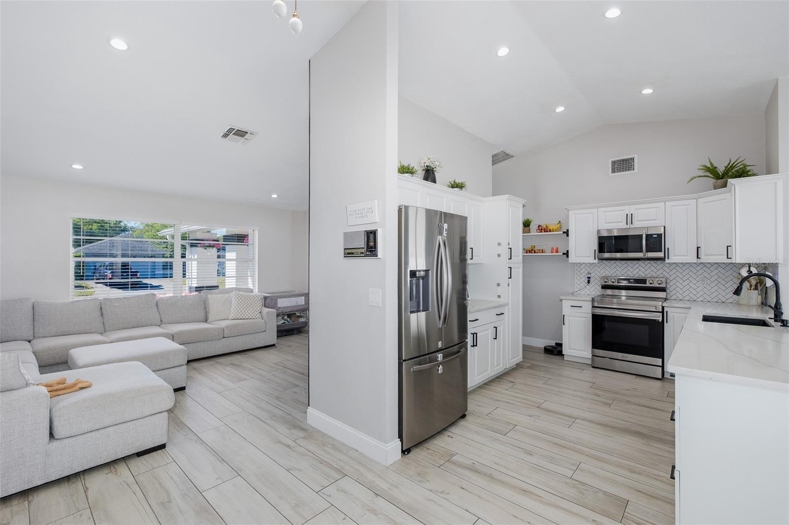 Welcome to this beautifully remodeled 3-bedroom, 2-bath pool home located in the highly desirable River Crossing community. Thoughtfully updated and move-in ready, this home offers both style and functionality with major improvements already completed, including a new roof (2019) and A/C (2020). Inside, you’ll find a modern, open layout featuring durable tile flooring throughout. The updated kitchen is a standout, showcasing white shaker cabinetry, quartz countertops, stainless steel appliances, and a spacious breakfast bar that flows seamlessly into the dining area—perfect for entertaining or everyday living. The flexible dining space can also serve as a second living area or family room. The primary suite offers a comfortable retreat with a generous walk-in closet and a beautifully updated en-suite bath featuring dual sinks and a stunning walk-in shower. Two additional bedrooms are well-sized and share a tastefully renovated guest bathroom. A bonus room adds even more versatility, ideal for a home office, den, or playroom. Step outside to your private backyard oasis, complete with a covered patio and an inviting in-ground pool—perfect for relaxing or hosting gatherings. The fully fenced yard provides added privacy and peace of mind. Ideally located just minutes from Starkey Wilderness Park, where you can enjoy miles of scenic trails for biking, jogging, and outdoor recreation, as well as nearby shopping, dining, and golf. This home offers the perfect blend of comfort, convenience, and Florida living at its finest.