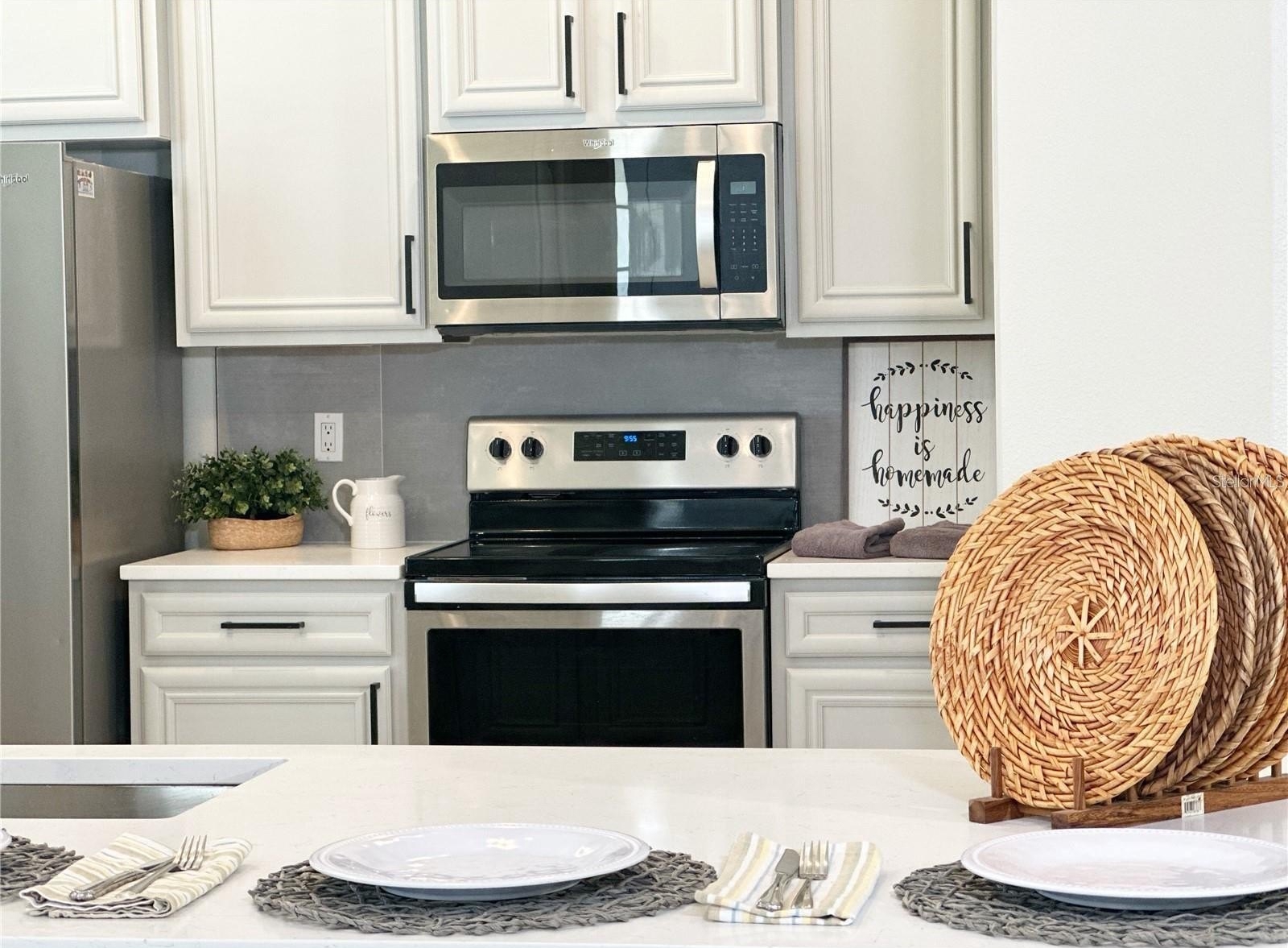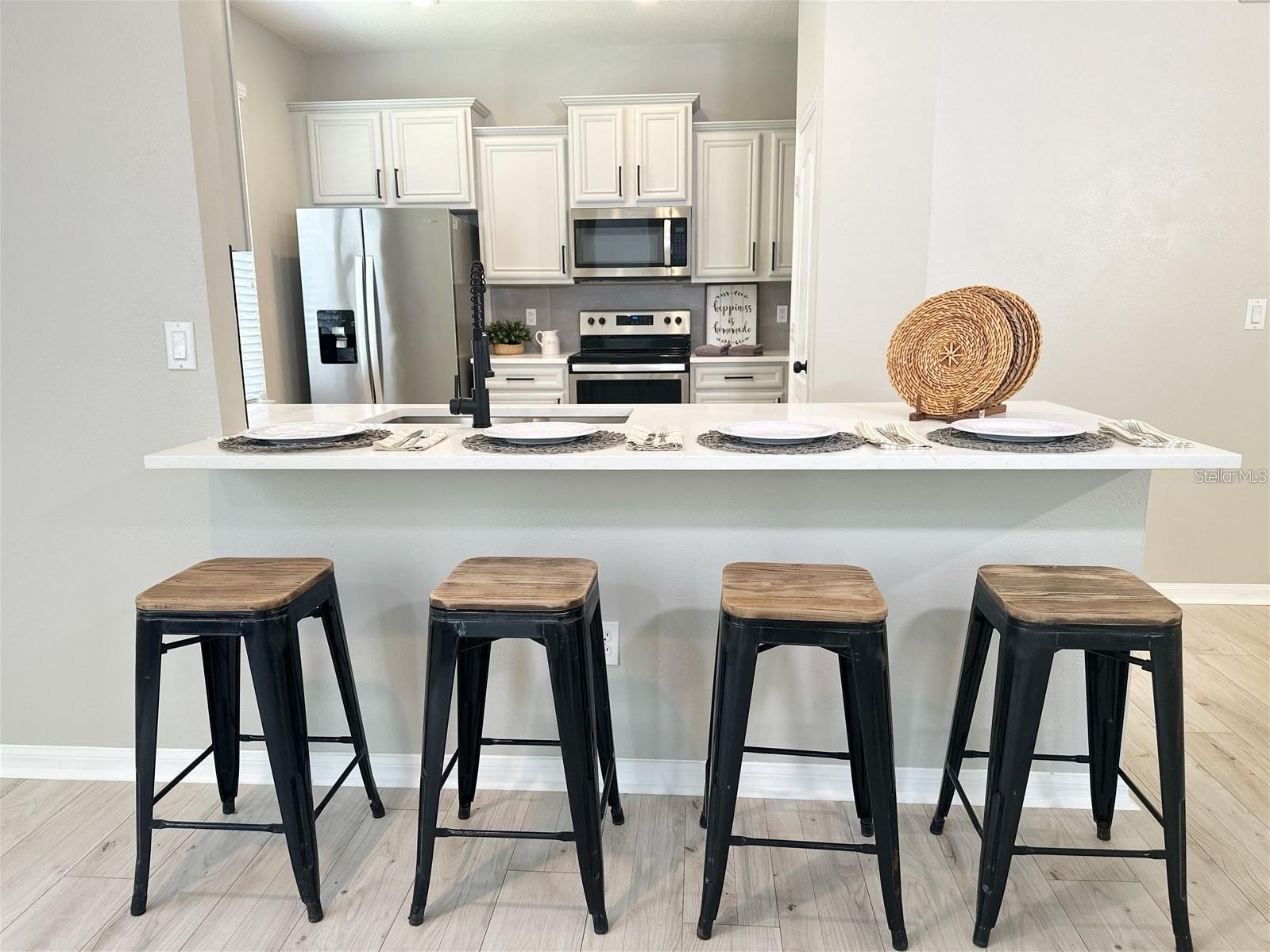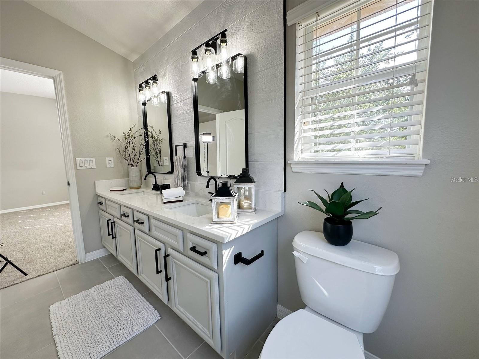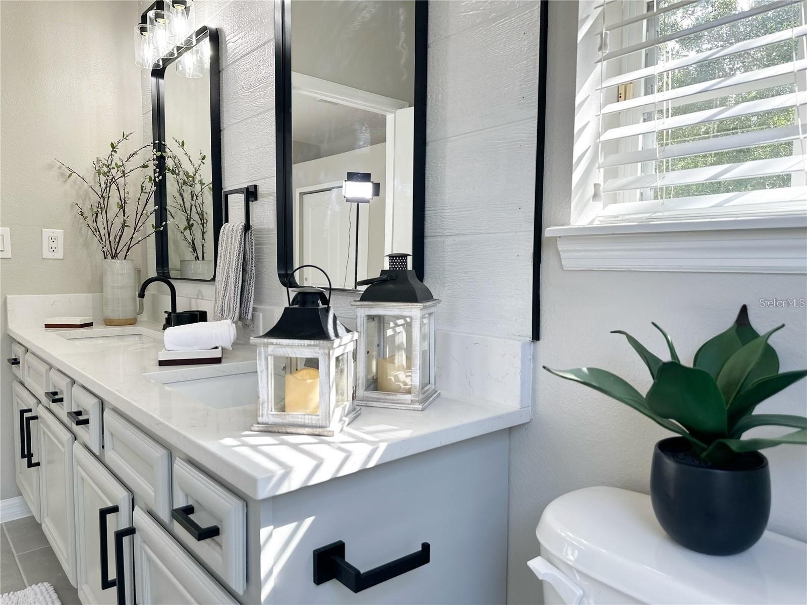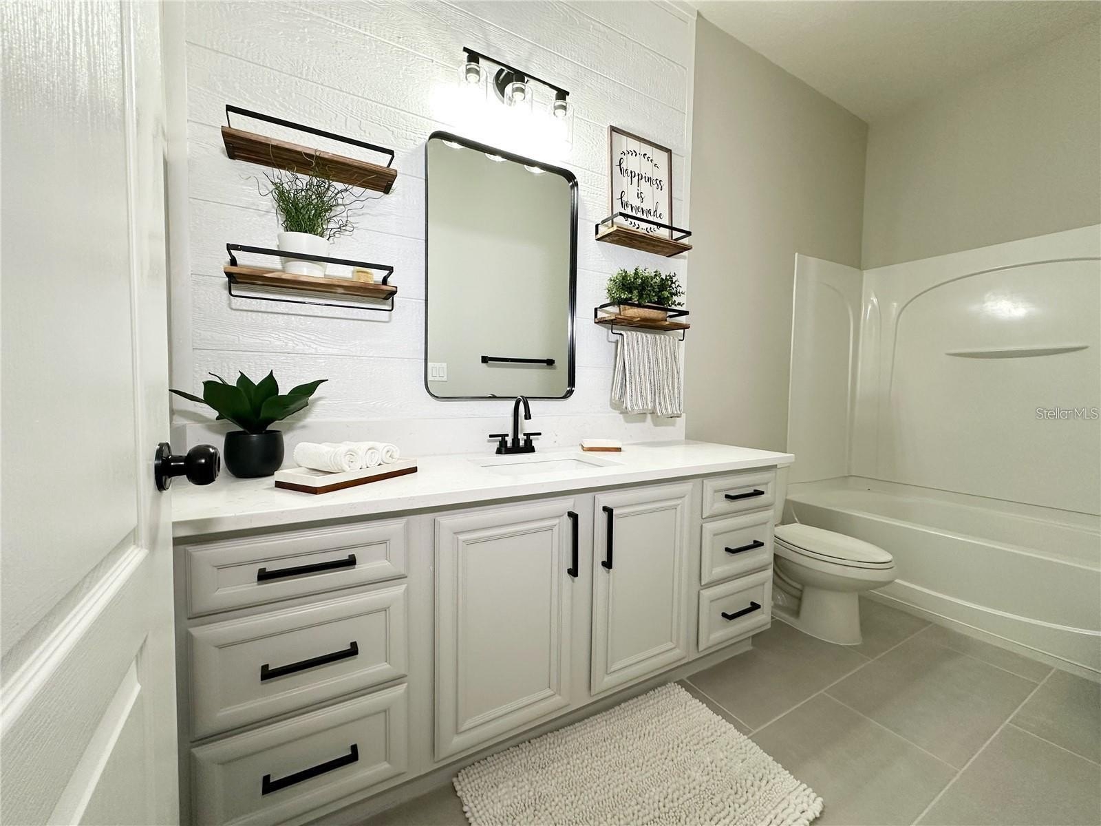 From the moment you enter, you’ll notice the upgraded plank flooring, abundant natural light, and a layout that flows effortlessly for both everyday living and entertaining. The home has been thoughtfully enhanced with modern upgrades throughout, including professionally painted cabinetry in a stylish gray palette, quartz countertops, and sleek black hardware in both the kitchen and bathrooms. Bathrooms are fully tiled, adding durability and a clean, modern finish.