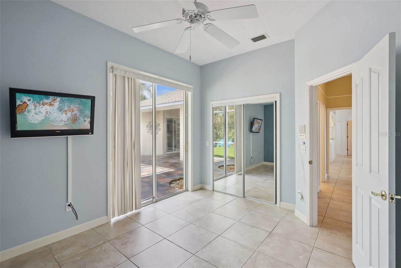 The oversized primary suite is a true retreat, featuring an additional seating area perfect for a private sitting room or home office, with direct access to the tiled patio. Step outside and unwind to the peaceful sound of the waterfall, part of a beautifully designed water feature currently maintained as a chlorine treated koi pond, creating a serene and relaxing backyard escape.