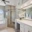 The primary bathroom showcases detailed tile work, a soaking tub, walk in shower, and a custom vanity with added cabinetry, along with a walk in closet featuring an organized system.