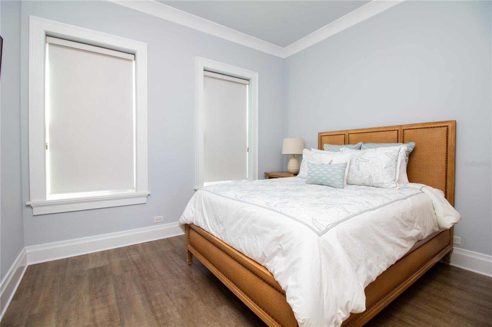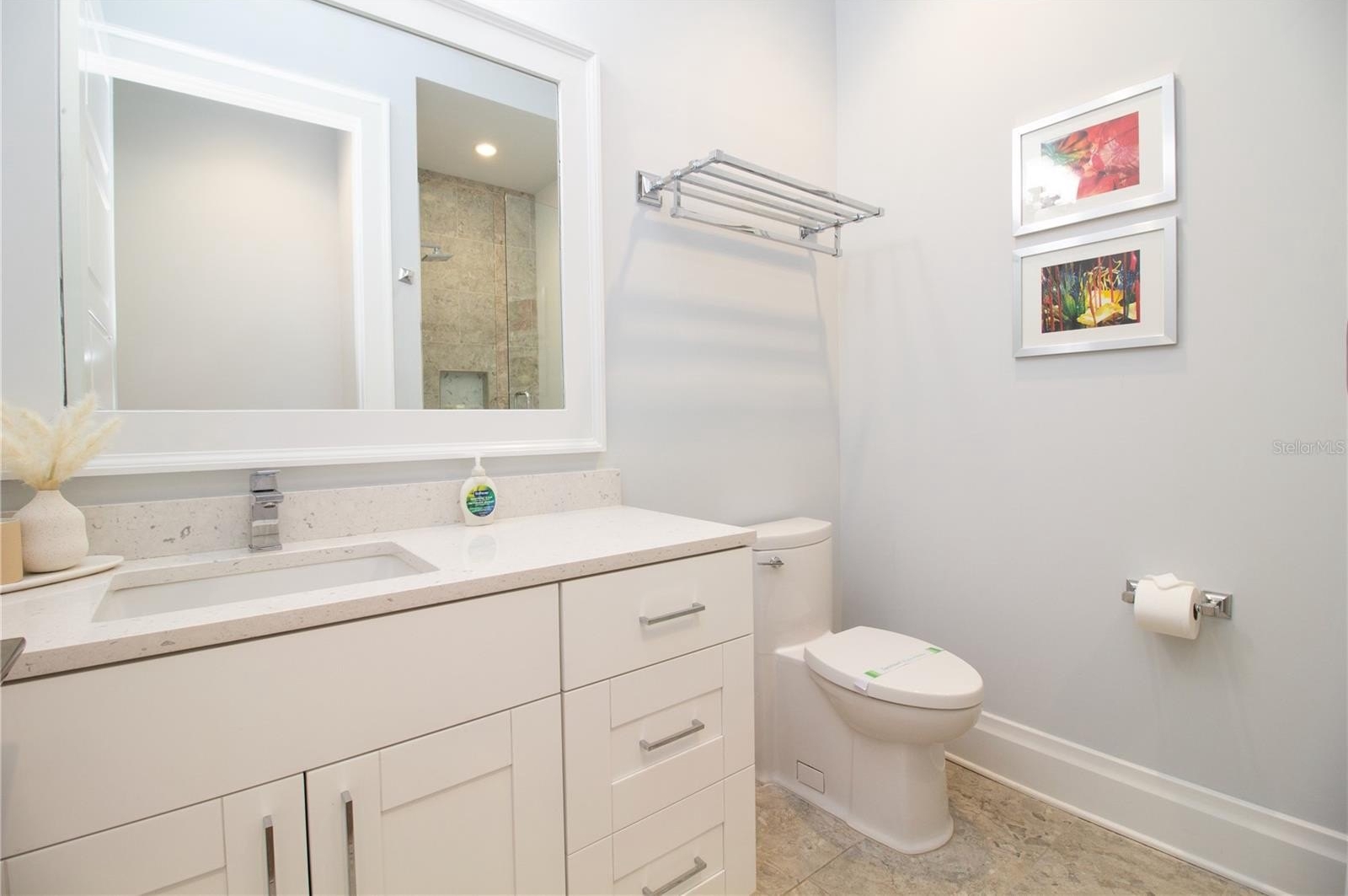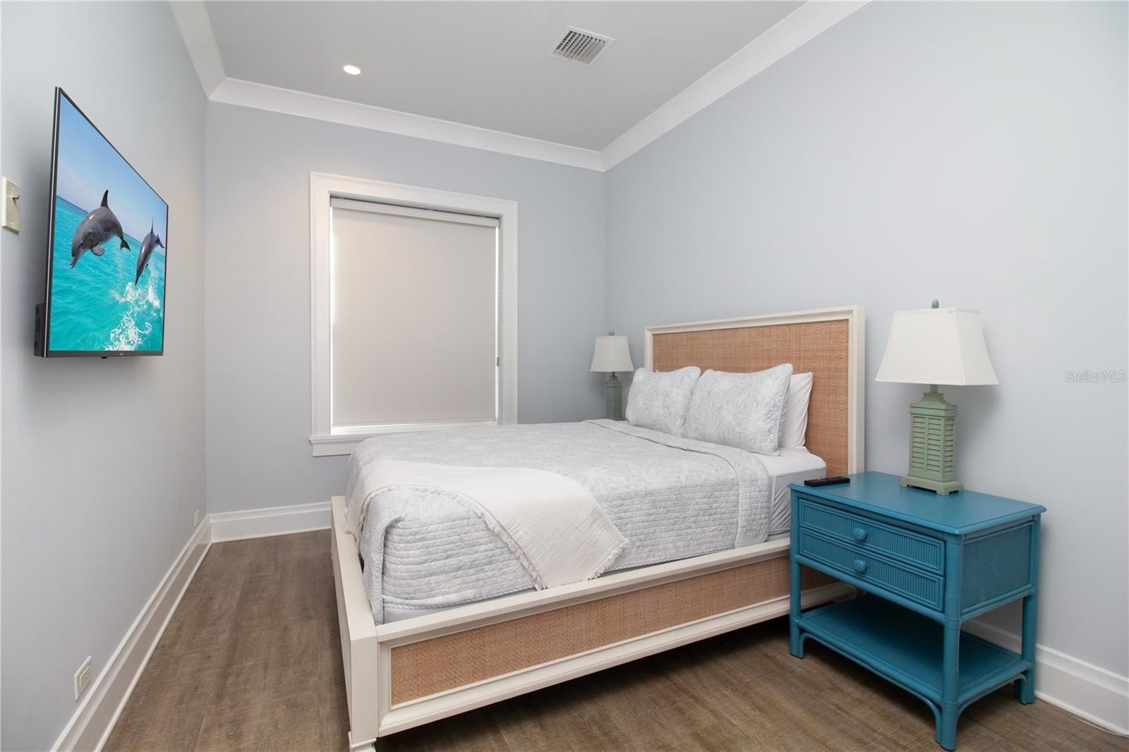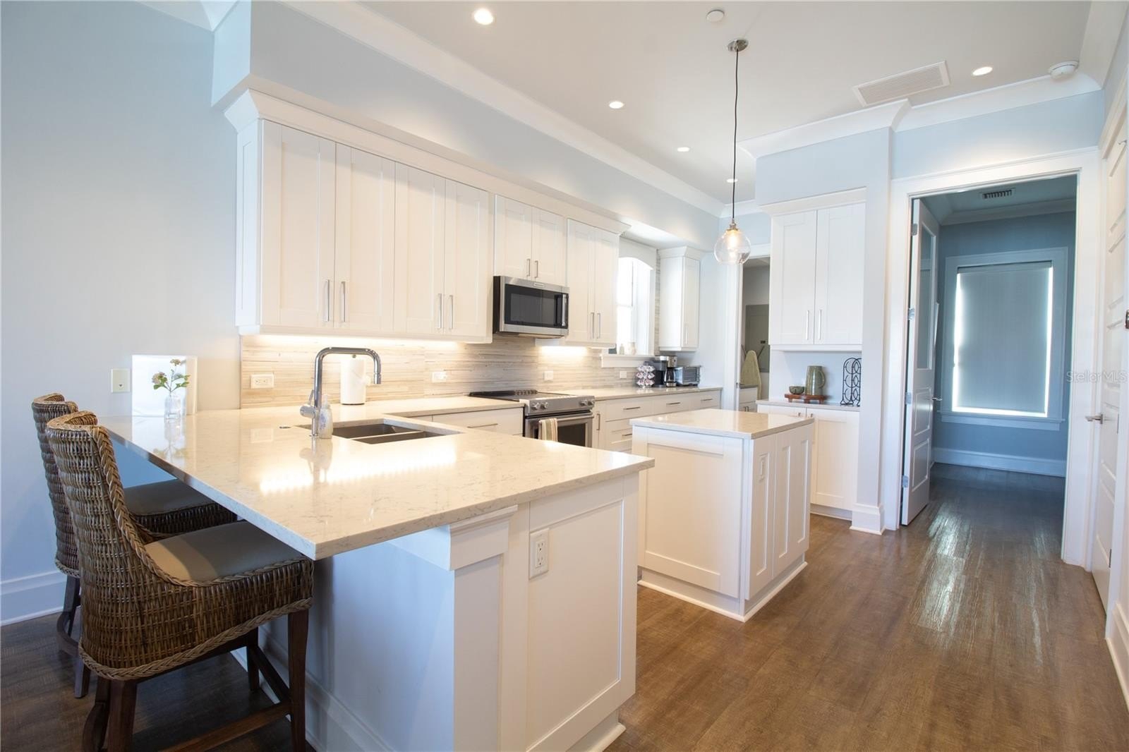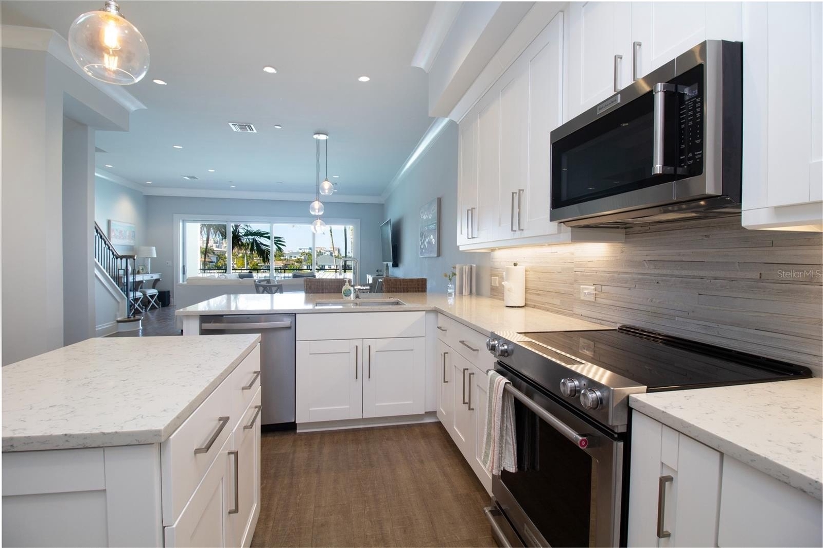 The second floor showcases an open-concept living, dining, and kitchen area tailored for today’s lifestyle. The gourmet kitchen features stainless steel appliances, white shaker cabinetry, quartz countertops, a striking backsplash, and a large center island ideal for hosting. A guest bedroom with walk-in closet and a beautifully appointed full bath is also located on this level. Enjoy serene water views from the covered balcony—perfect for morning coffee or evening sunsets.