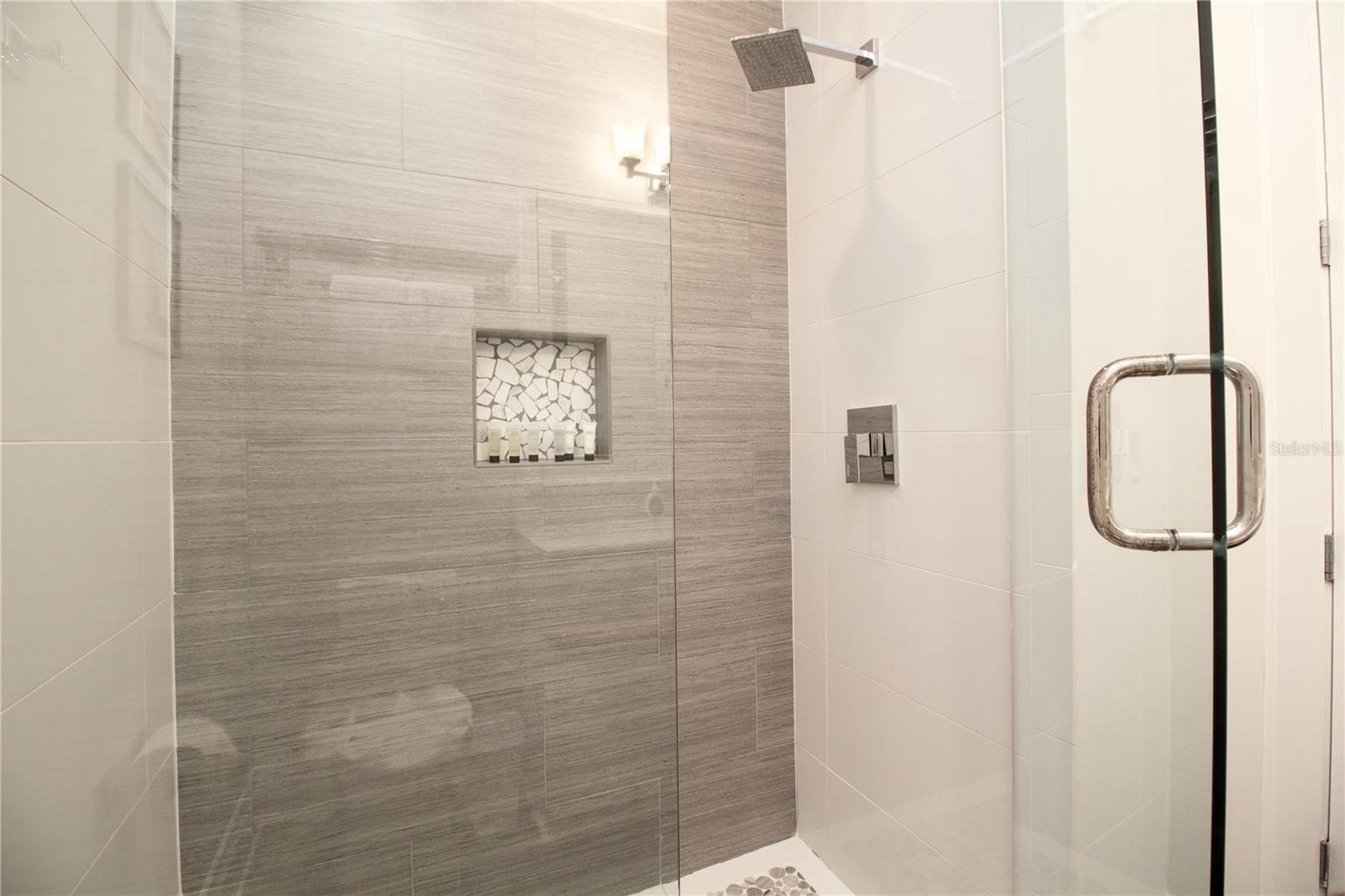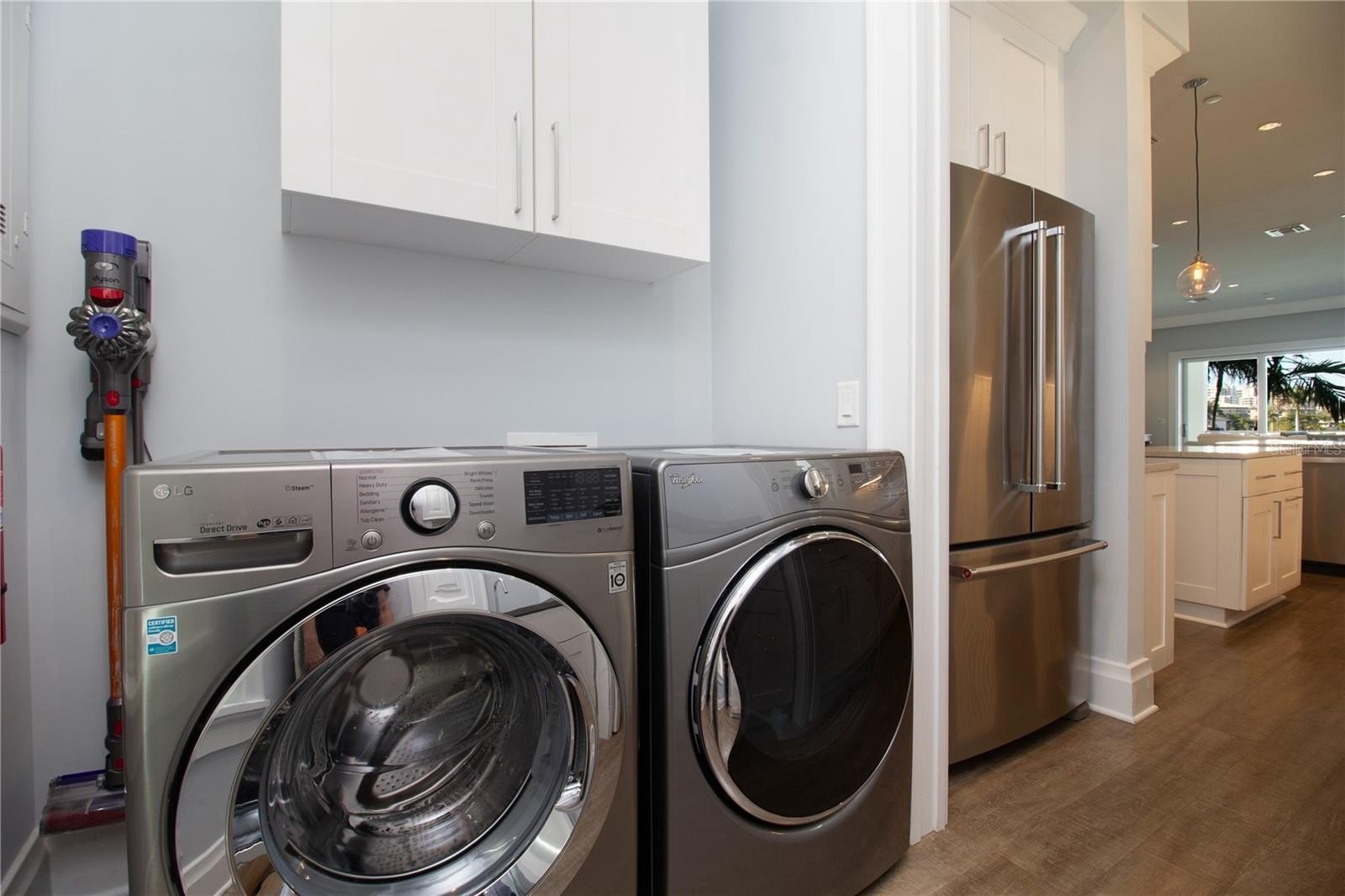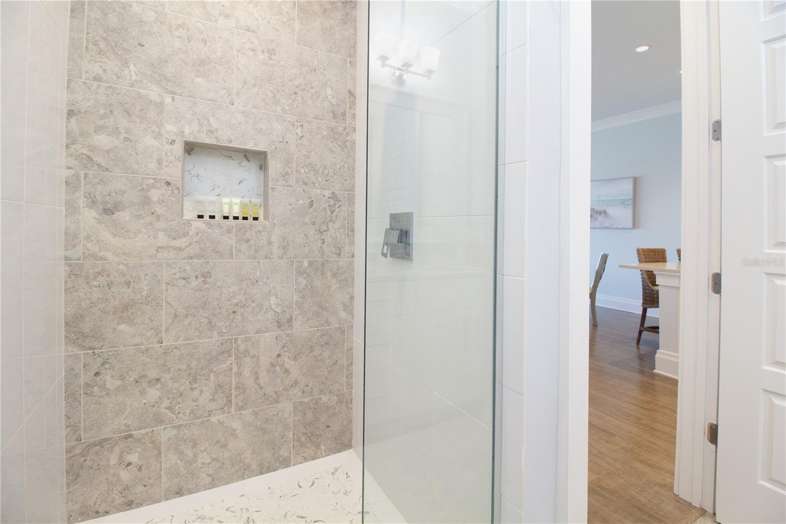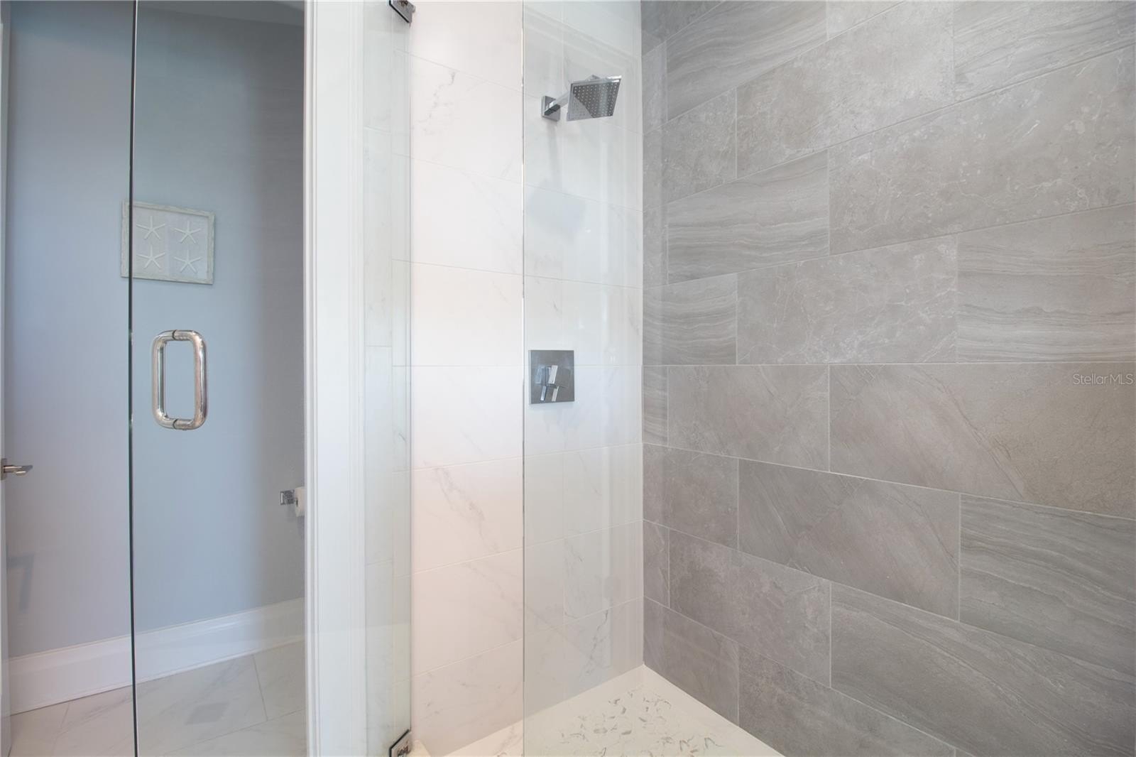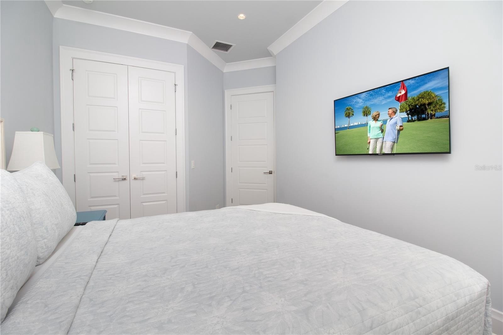 The second floor showcases an open-concept living, dining, and kitchen area tailored for today’s lifestyle. The gourmet kitchen features stainless steel appliances, white shaker cabinetry, quartz countertops, a striking backsplash, and a large center island ideal for hosting. A guest bedroom with walk-in closet and a beautifully appointed full bath is also located on this level. Enjoy serene water views from the covered balcony—perfect for morning coffee or evening sunsets.