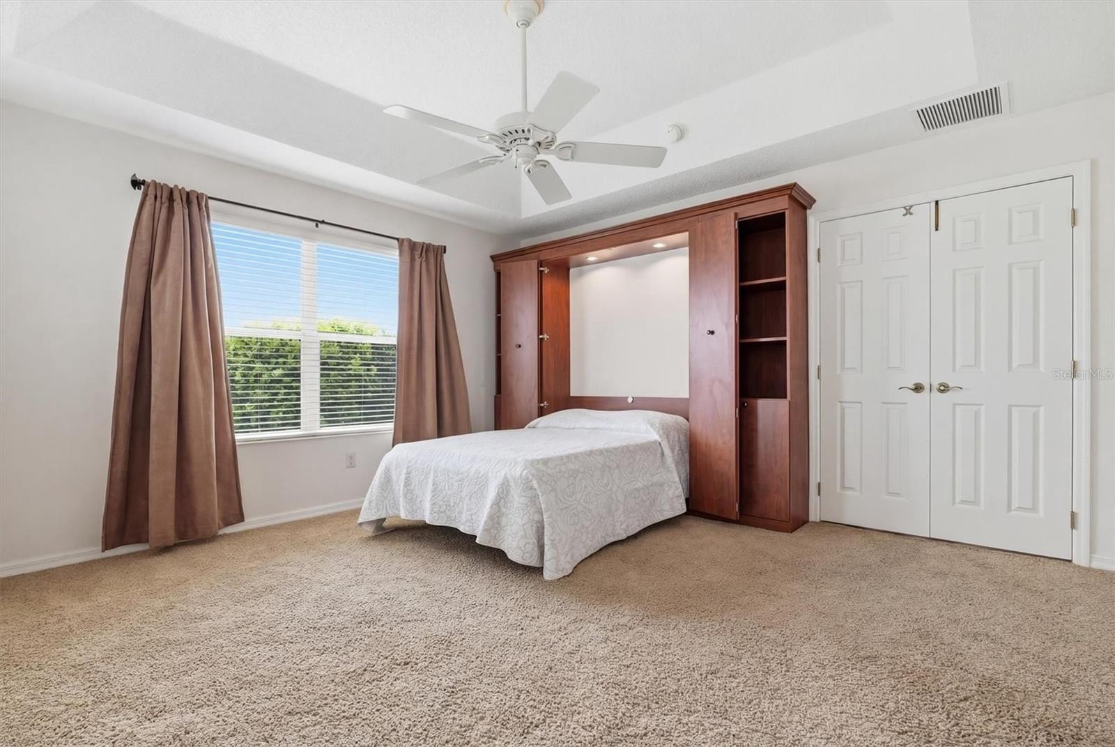 One or more photo(s) has been virtually staged. Welcome to this charming Hawthorne floorplan in the sought-after Village of Mallory Square — a warm, move-in ready 3-bedroom, 2-bath home with a 2-car garage and irresistible curb appeal. Step into the foyer and be greeted by herringbone parquet floors, vaulted ceilings, and a bright, airy layout that invites easy living and gracious entertaining. The living room flows seamlessly into a formal dining area with tray ceilings and direct access to the screened lanai and kitchen pass-through — ideal for casual meals or hosting friends. The kitchen will delight any home cook: gas range, generous cabinetry, center island, plentiful prep space, pantry with pull-out drawers, and a convenient coffee bar. A dinette opens to the 18x18 screened lanai and a 13x9 open patio—perfect for morning coffee, BBQs, or a small fire pit evening. The primary suite is a serene retreat with tray ceiling, abundant windows, custom Murphy bed, dual closets, and an en-suite bath featuring dual sinks, high countertops, tiled shower, and a private water closet. Bedroom 2 offers generous space and Bedroom 3 makes an excellent home office or guest room with built-in shelving for book lovers. Indoor laundry includes a window and closet; washer and dryer are included. New roof (2024) and a new garbage disposal complete the practical upgrades. Residents of The Villages enjoy world-class amenities including community clubhouses, pools, golf courses, restaurants, gated entry (no guard), dog park, wheelchair accessibility, lake access and more. This home is conveniently near the Mallory Square community pool, Coconut Cove Rec Center, Mallory Hill Country Club & Restaurants, and just minutes by golf cart to Lake Sumter Landing for dining, shopping, and nightly entertainment 24/7. Don't miss the warm, welcoming lifestyle this Mallory Square home offers — schedule your showing today.