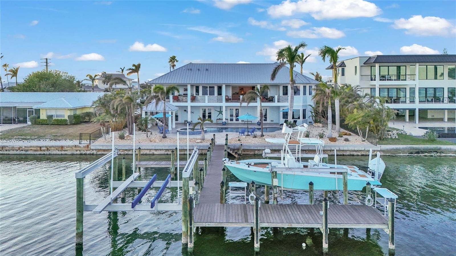 Outdoors, the home transforms into a private waterfront retreat with a bayside freeform pool and spa, expansive travertine deck for lounging and dining, and a covered cabana. Boating enthusiasts will appreciate the Trex dock with water and electric, along with 28,000 lb and 10,000 lb boat lifts.